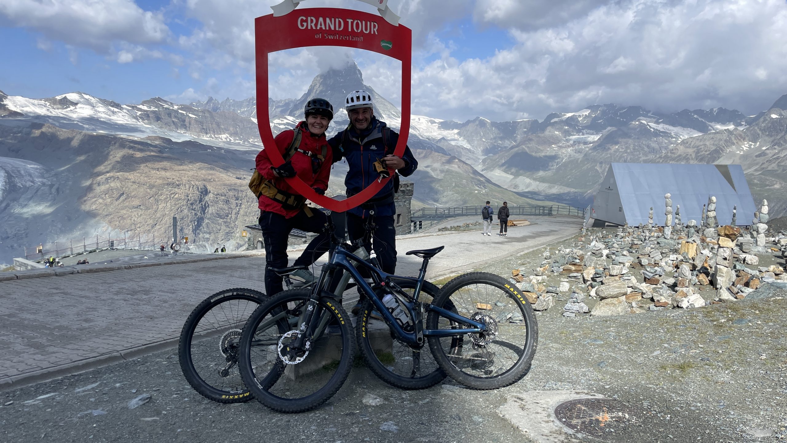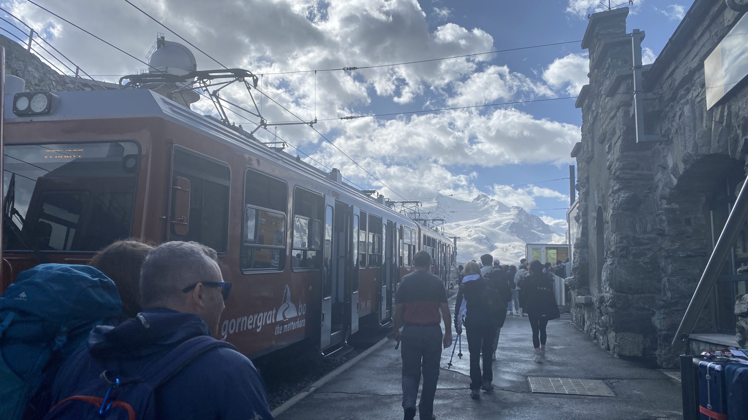 Heute Nacht wachen wir um 1h und um 3h auf. Es schüttet und gewittert. Morgens um 6.30h regnet es immer noch. Das war so nicht vorhergesagt. Da wir gestern bereits die Bahn von Täsch nach Zermatt mit dem Bike, den Bikepass für Zermatt und das Bike-Ticket für die Gornergrat-Bahn gebucht haben, wollen wir es wenigstens probieren. Im strömenden Regen geht es los. Kaum sitzen wir in der Gornergrat-Bahn, reißt der Himmel auf und das Matterhorn zeigt sich. Haben wir ein Glück.