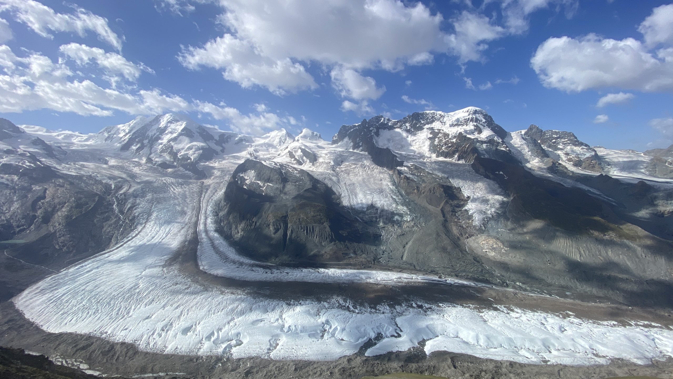 Das Panorama vom Gornergrat (3.089m) ist unbeschreiblich. Neben dem Matterhorn (4.478m) schiebt sich die Dufourspitze (4.634m) mit der Gletscher-Welt ins Panorama.