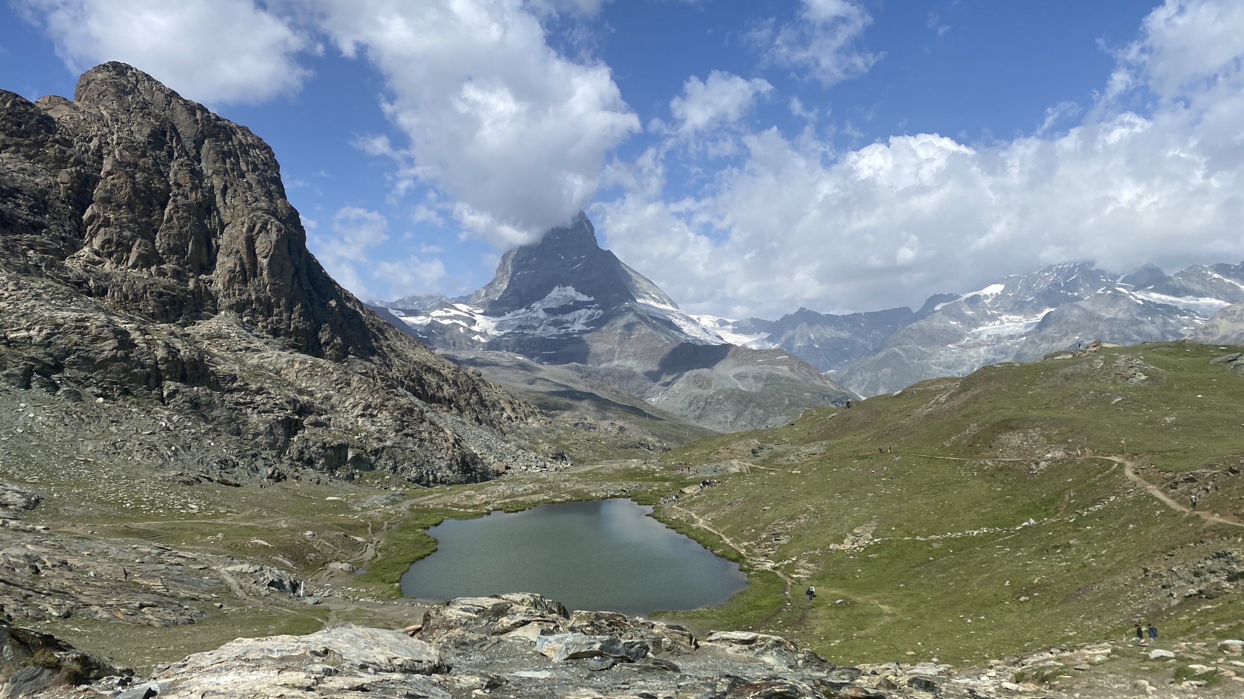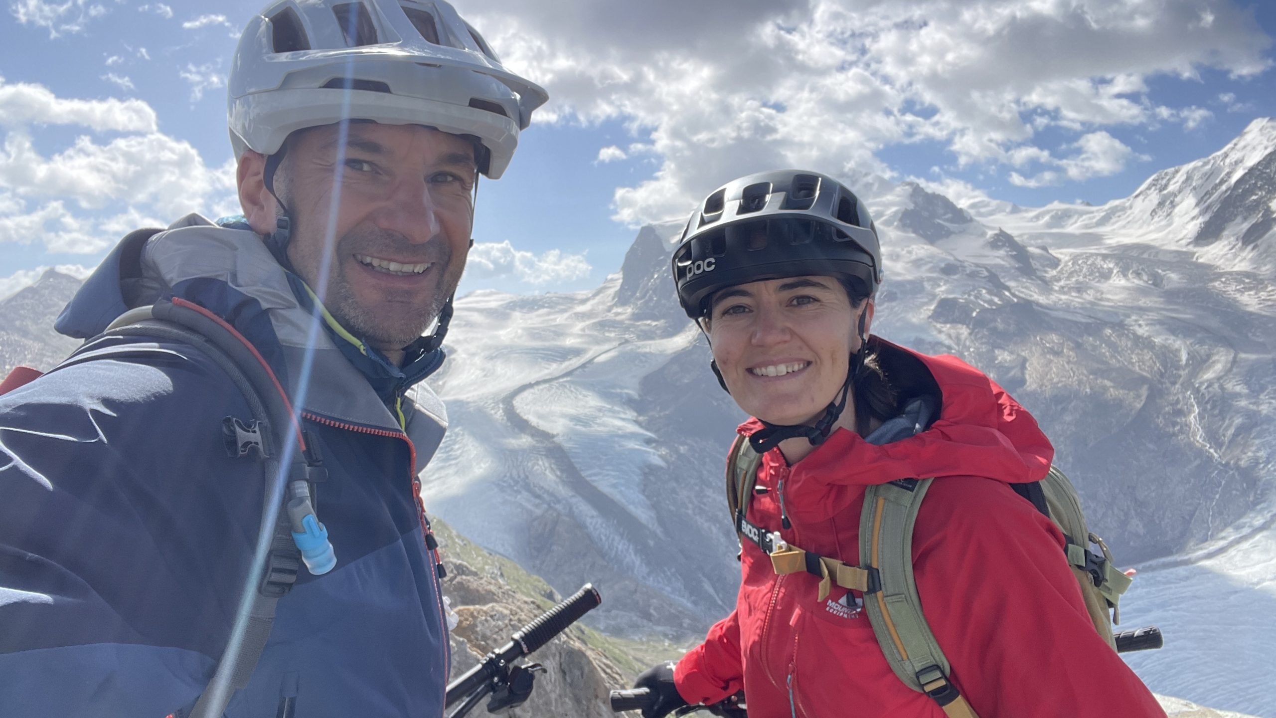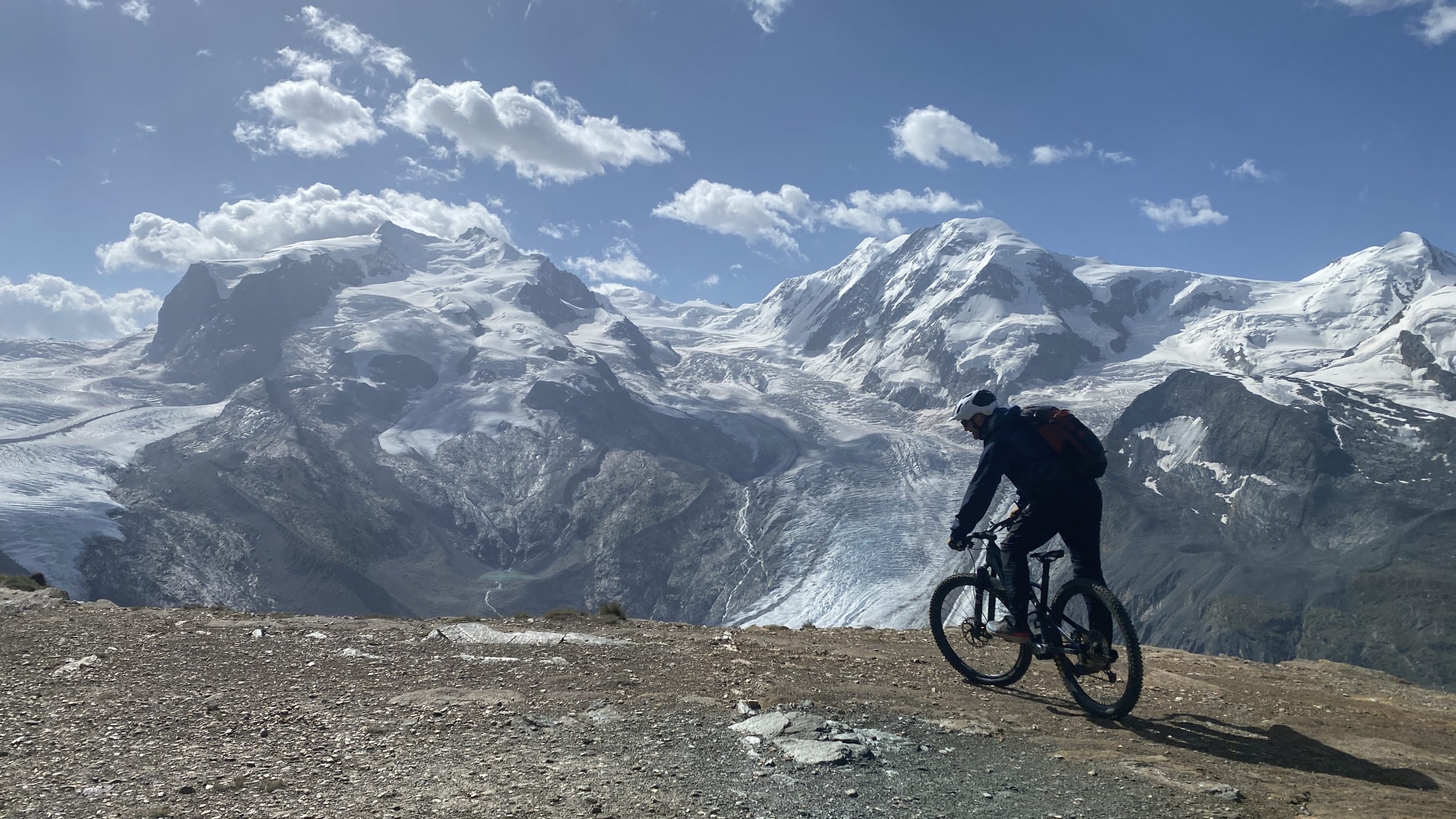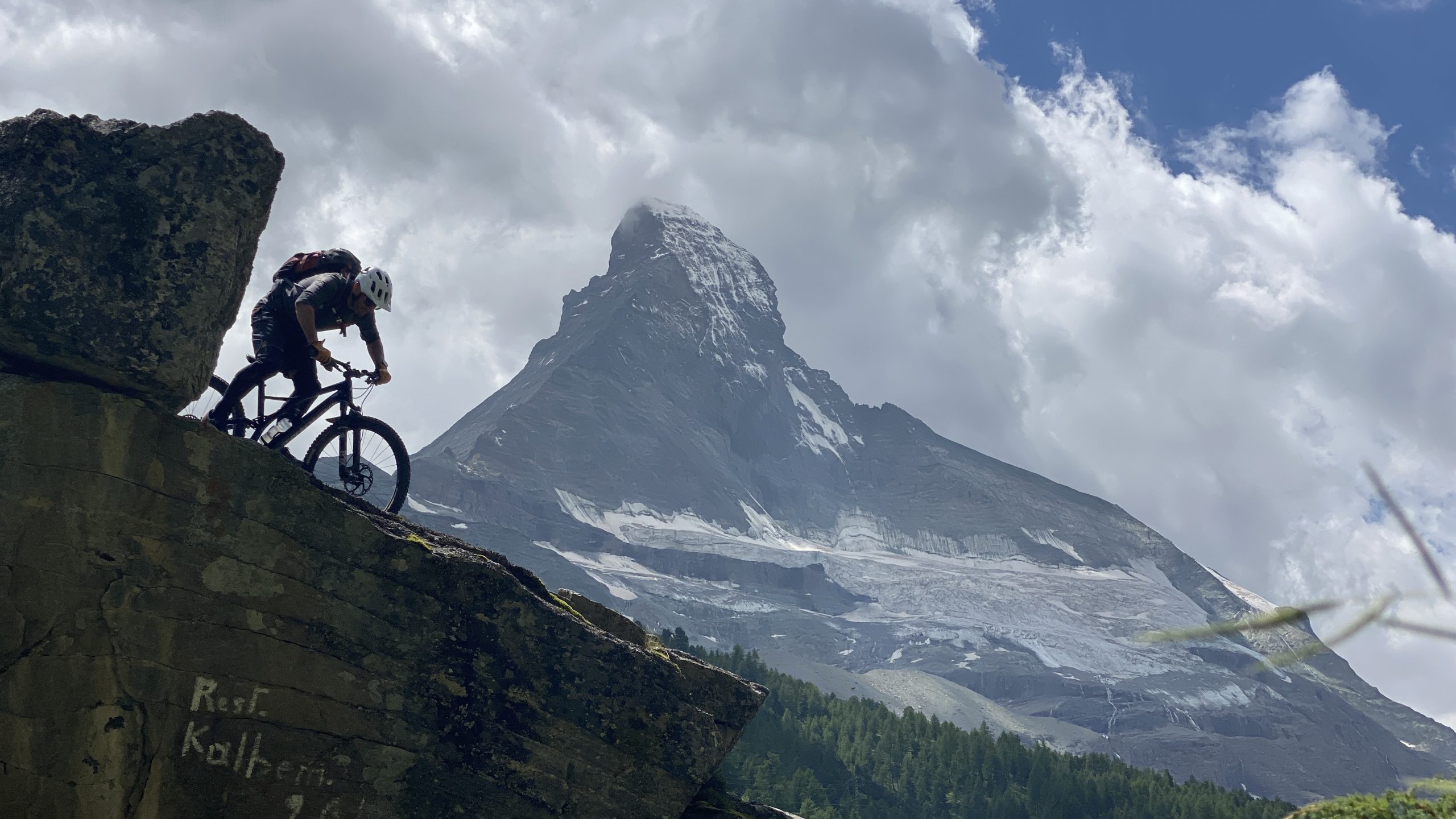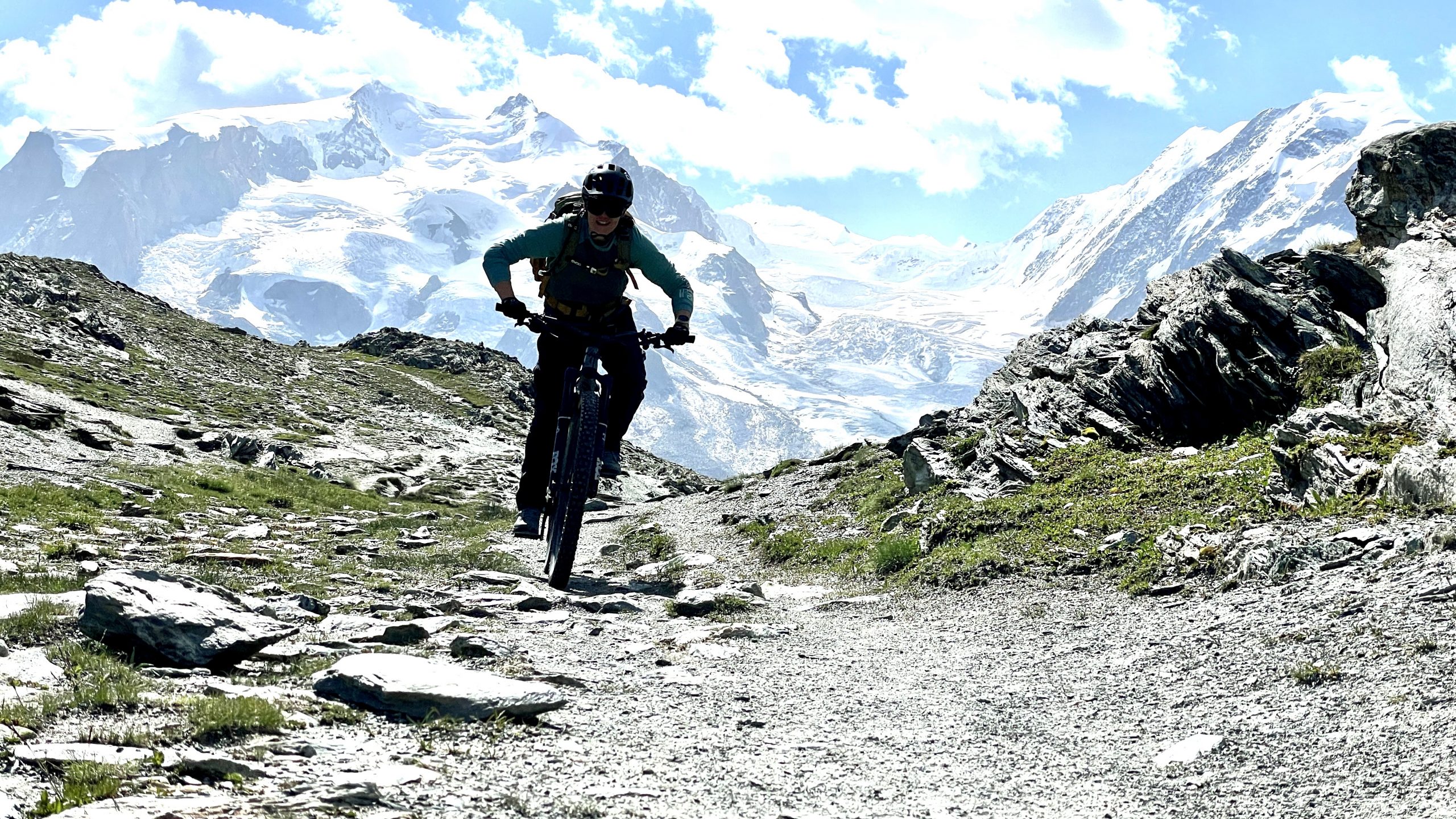 Wir probieren es mit der Bahn zum Schwarzsee (2.583m). Am Anfang Fahrstraße und für Radfahrer gesperrter Wanderweg. Den nächsten erlaubten Wanderweg nehmen wir. Jetzt wird es super. Dann finden wir den Einstieg in den „Chalbermatten-Trail“. Jetzt wird es mega! Mit einem Grinsen rollen wir über einen feinsten Single-Trail nach Zermatt.