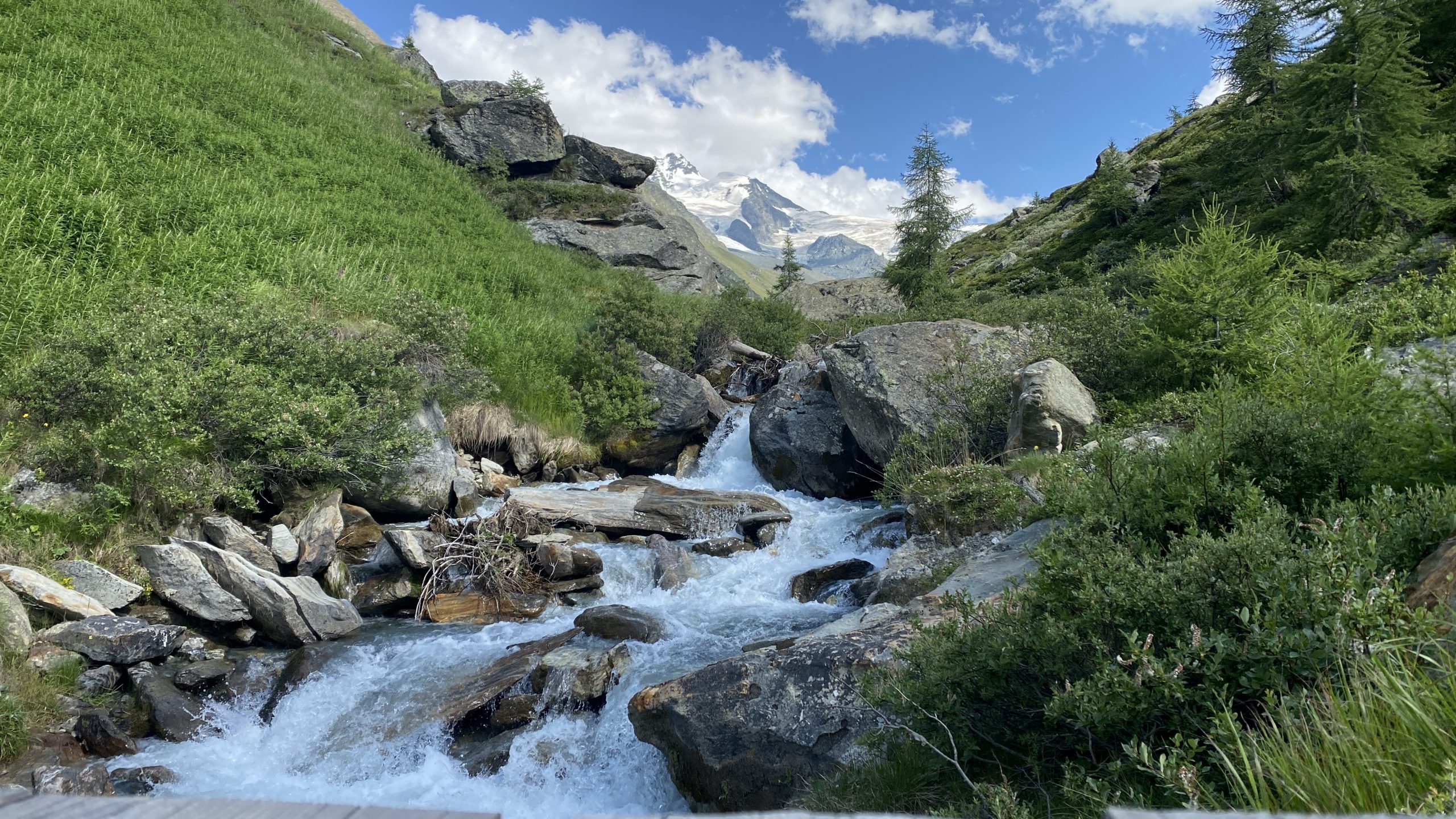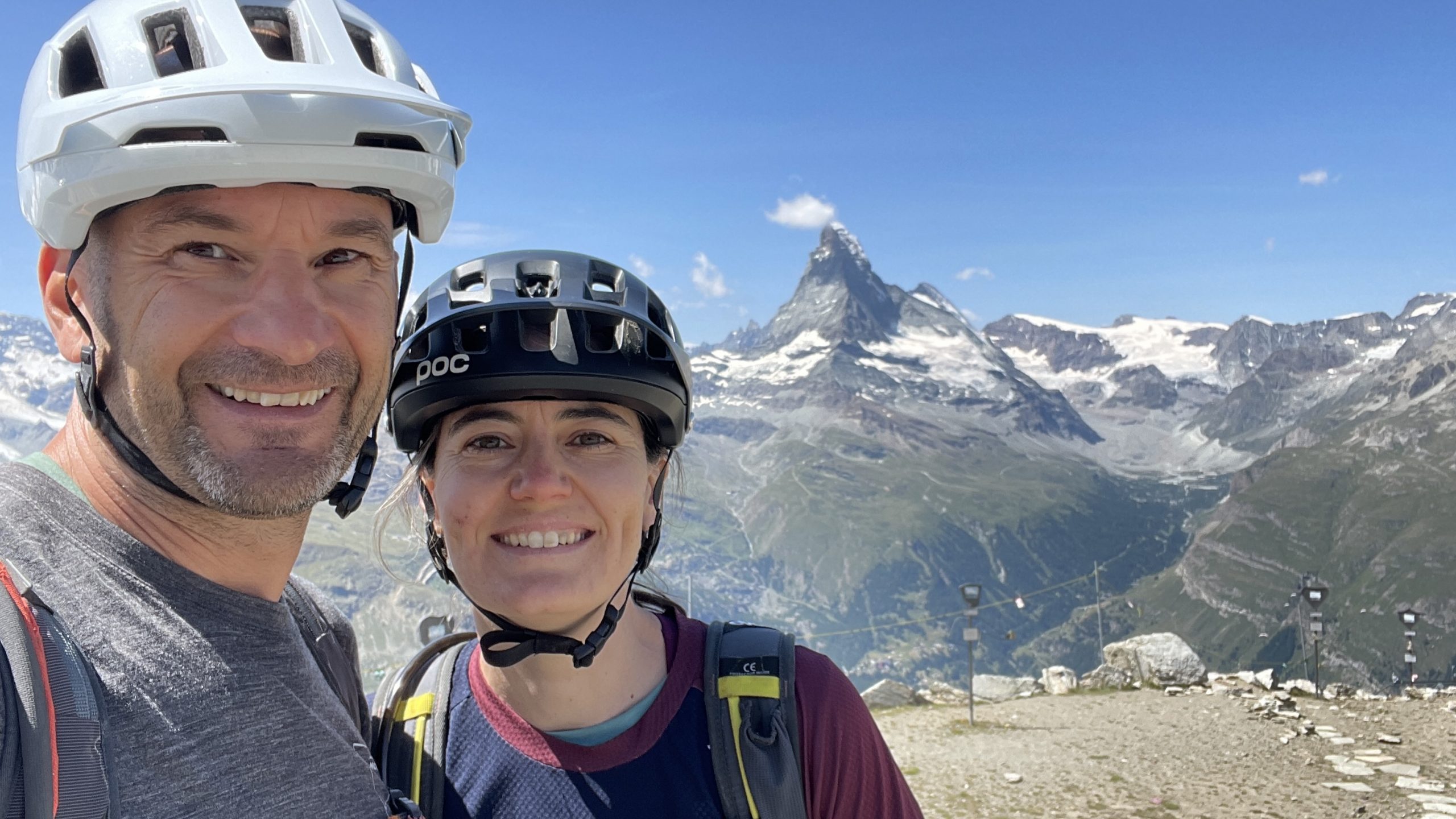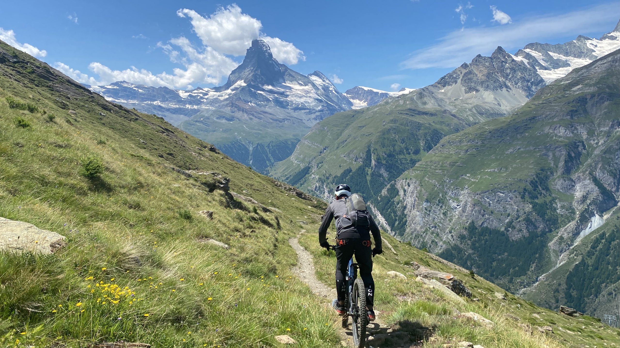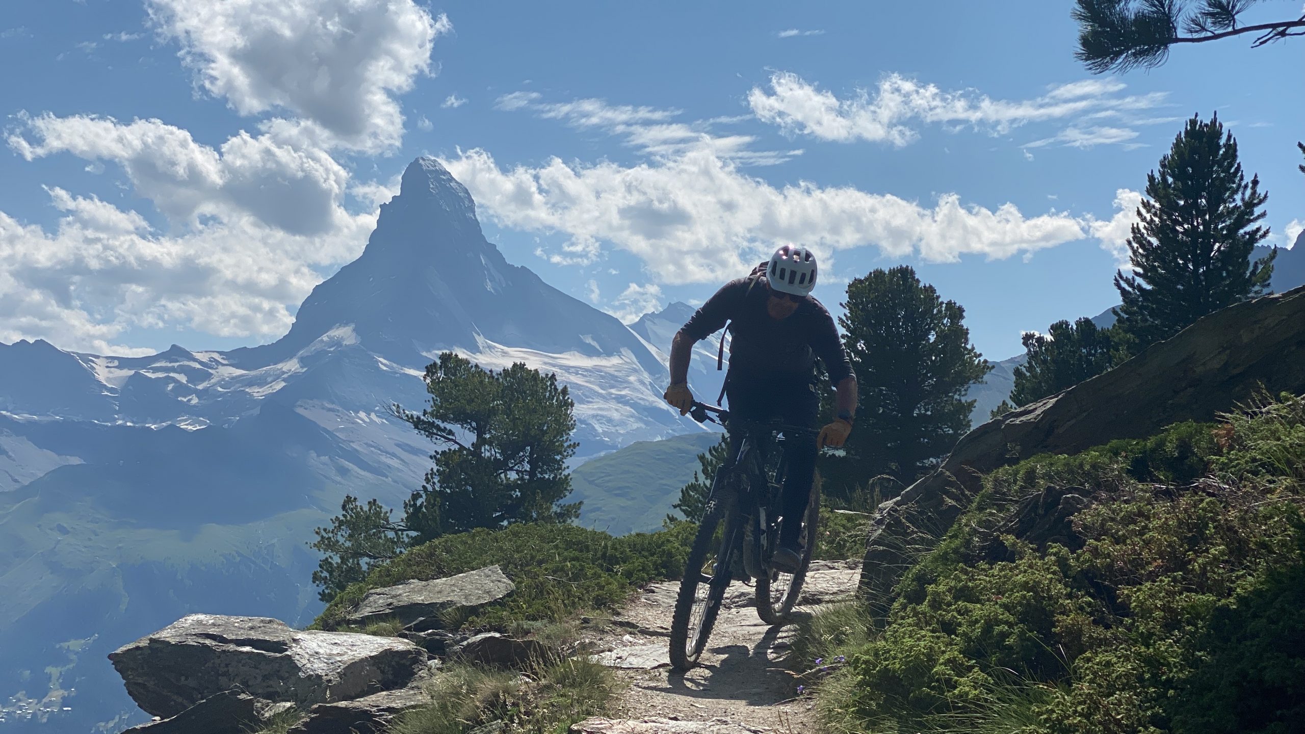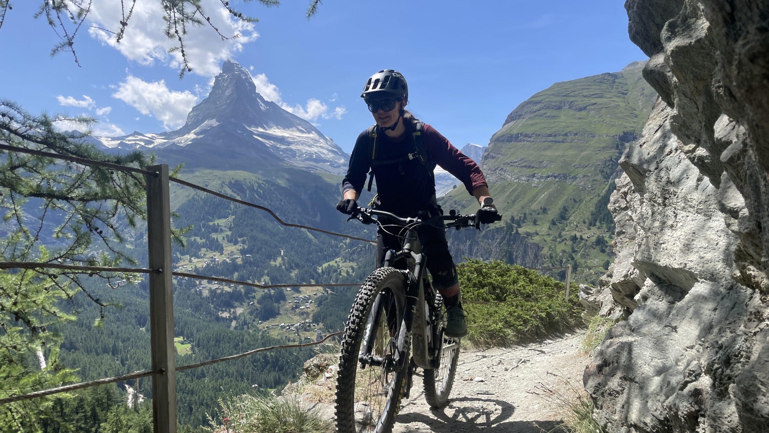 Eigentlich reicht es für heute, aber doch noch kurz den Flowtrail einmal ganz? Naja, wenn wir schon in Sunnega sind, nicht doch den Europaweg nach Täsch? Noch eine Gondel höher finden wir uns über den Sunnega-Trail auf dem genialen Europaweg Richtung Täsch. Die Aussicht ist grandios- insbesondere zeigt sich das Matterhorn heute wolkenfrei. Der extra Trail hat sich gelohnt.