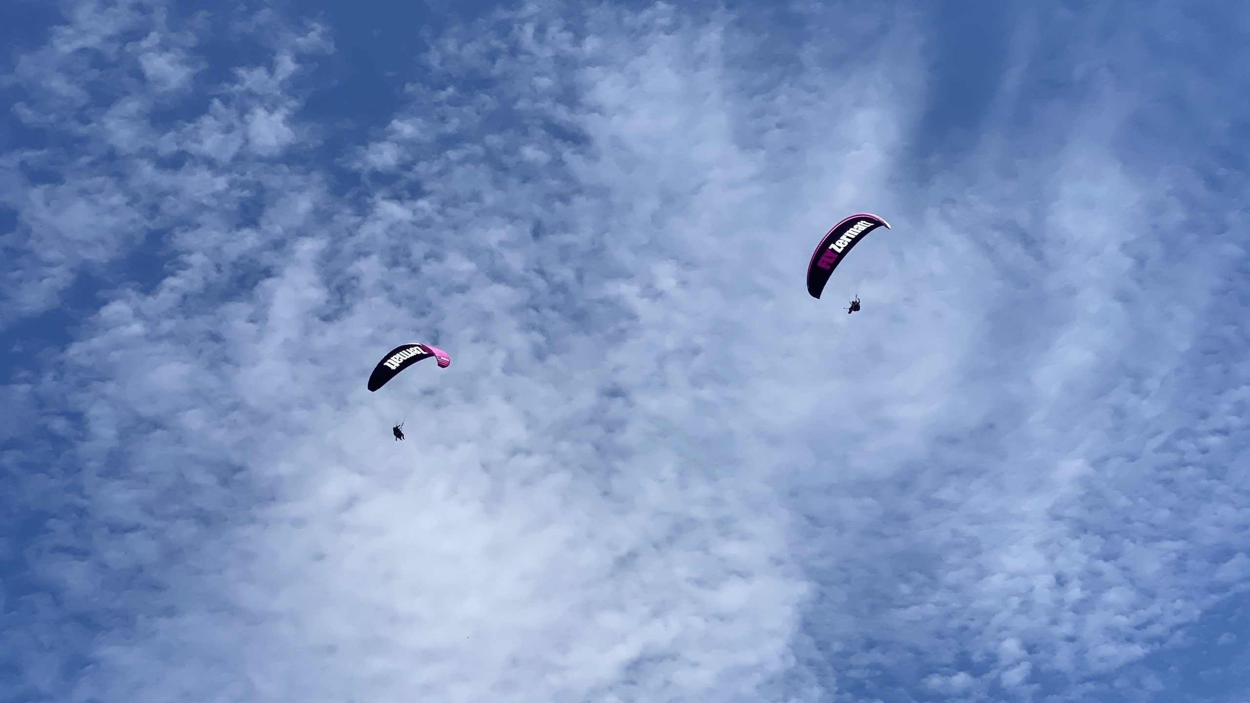 Heute geht es aufs Rothorn (3.101m), mit Schrägseilbahn, kleinen Gondel und große Gondel. Spektakel im der Gondel: 6 Tandem-Flieger packen ihre Gäste ein.