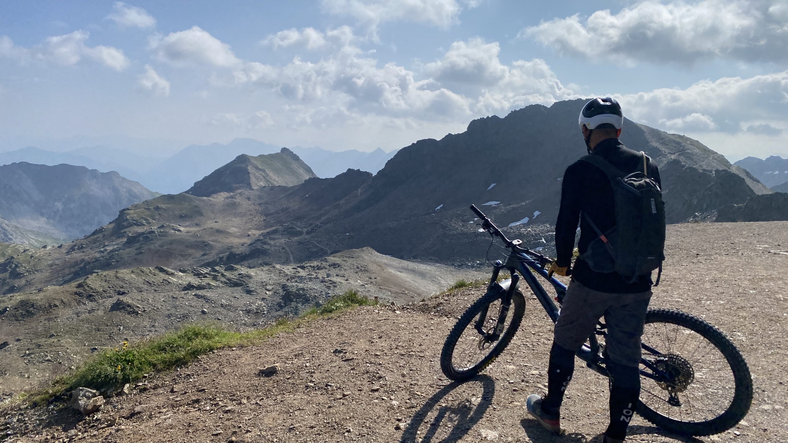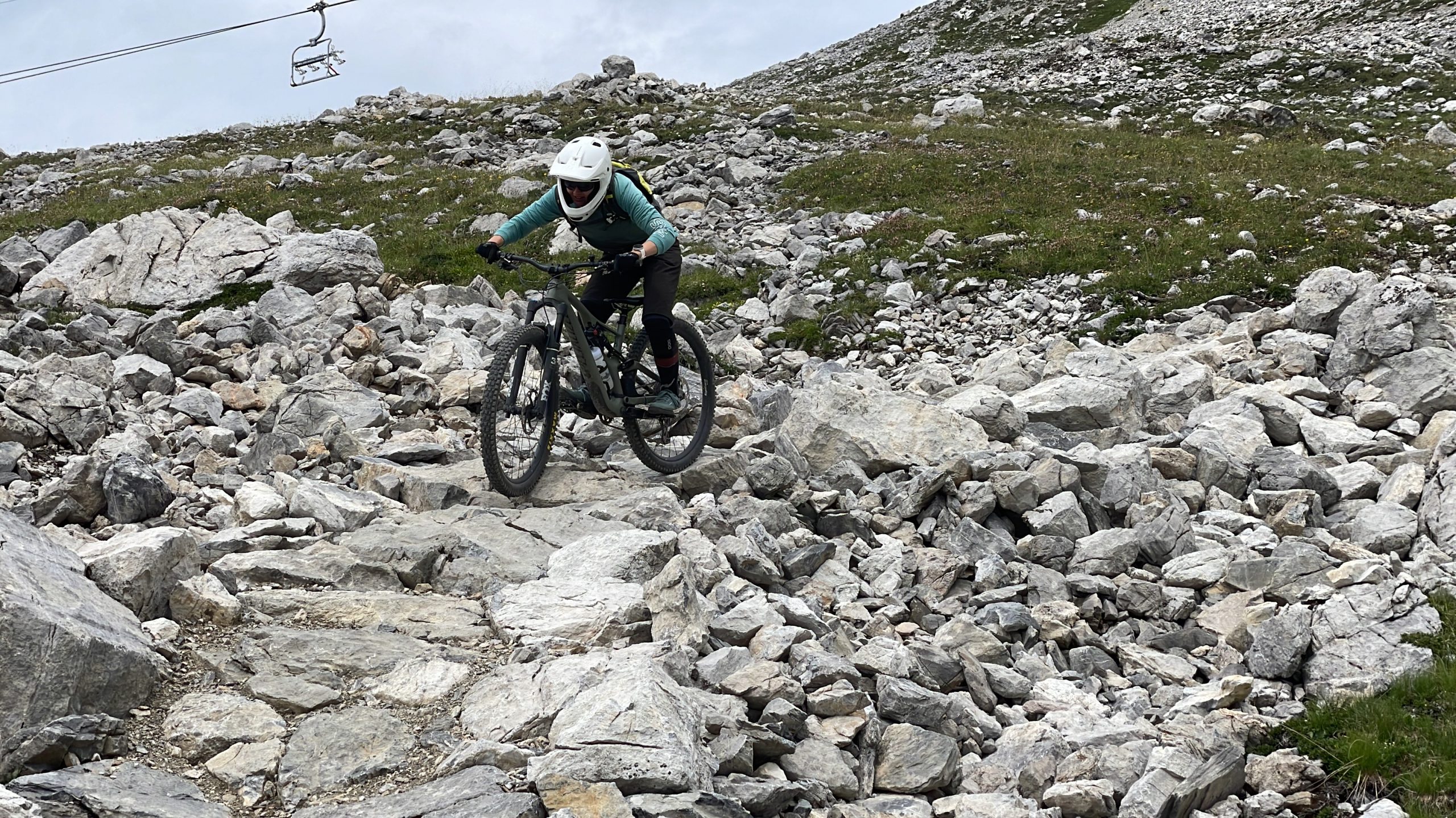 Dann wollen wir den Weißhorn Express nehmen. Runter ins Tal oder die Abkürzung 170 Hm und 1 km? Wir entscheiden uns für die Abkürzung – die ist ganz schön steil zu schieben. Wir nehmen den Weißhorn Express. Oben am Gredigs Fürggli (2.615m) wartet der Trail „The Great White“. Den Trail fahren wir zum ersten Mal und ist ein absolutes Highlight!!! Den müssen wir uns merken.