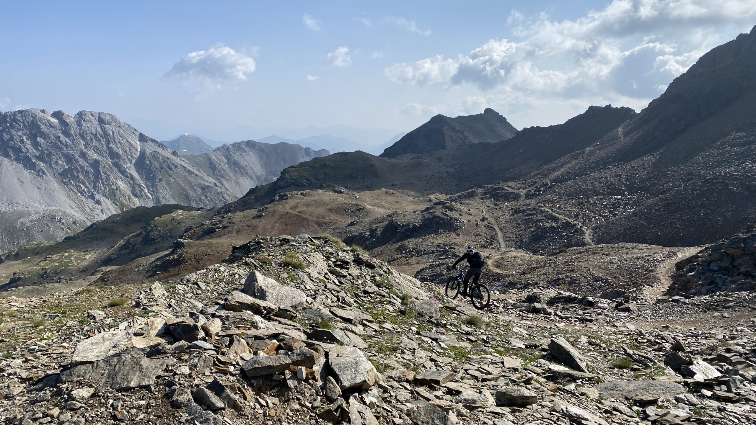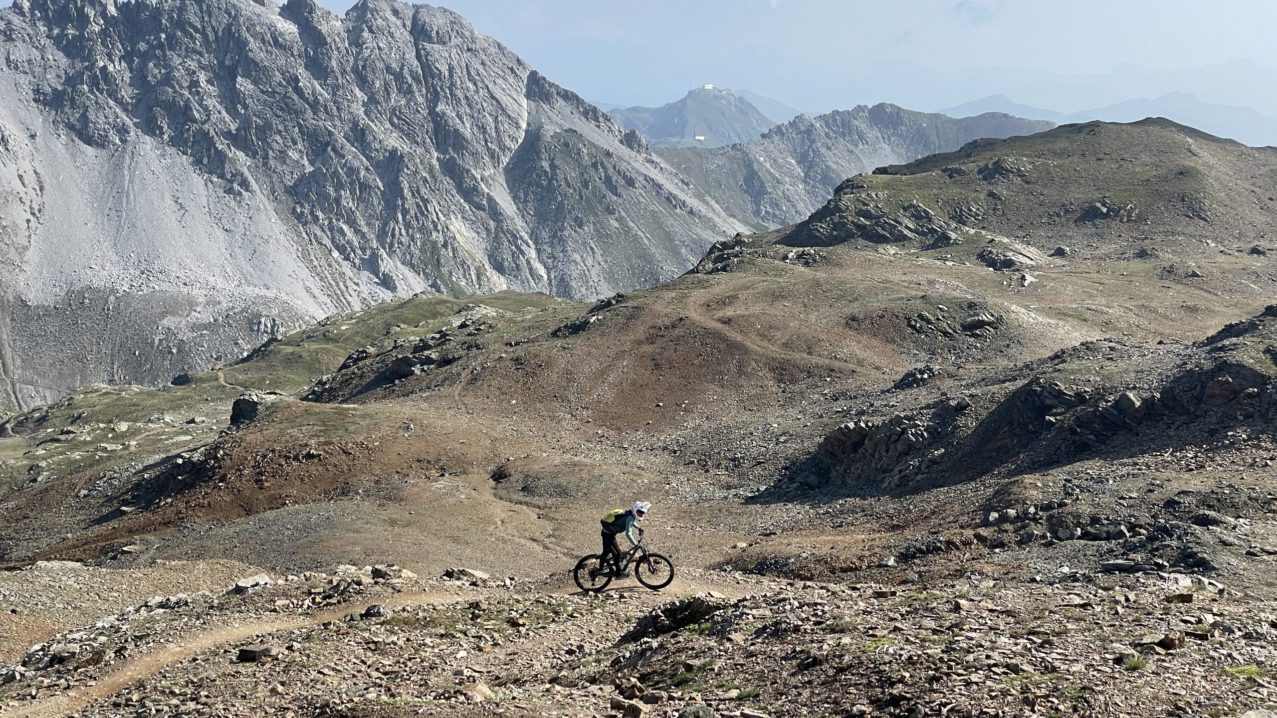 Wir wollen mal den Weisshorn-Trail testen. Keine anderen Biker in der Bahn verheißt meist keinen super Trail. So ist es leider. Der Trail bekommt keine Chance. Über die Schotterstraße nehmen wir die Abkürzung zurück nach Arosa. Zurück aufs Hörnli (2.511m) und weiter zum Urdenfürggli (2.546m). Ganz schön windig hier.