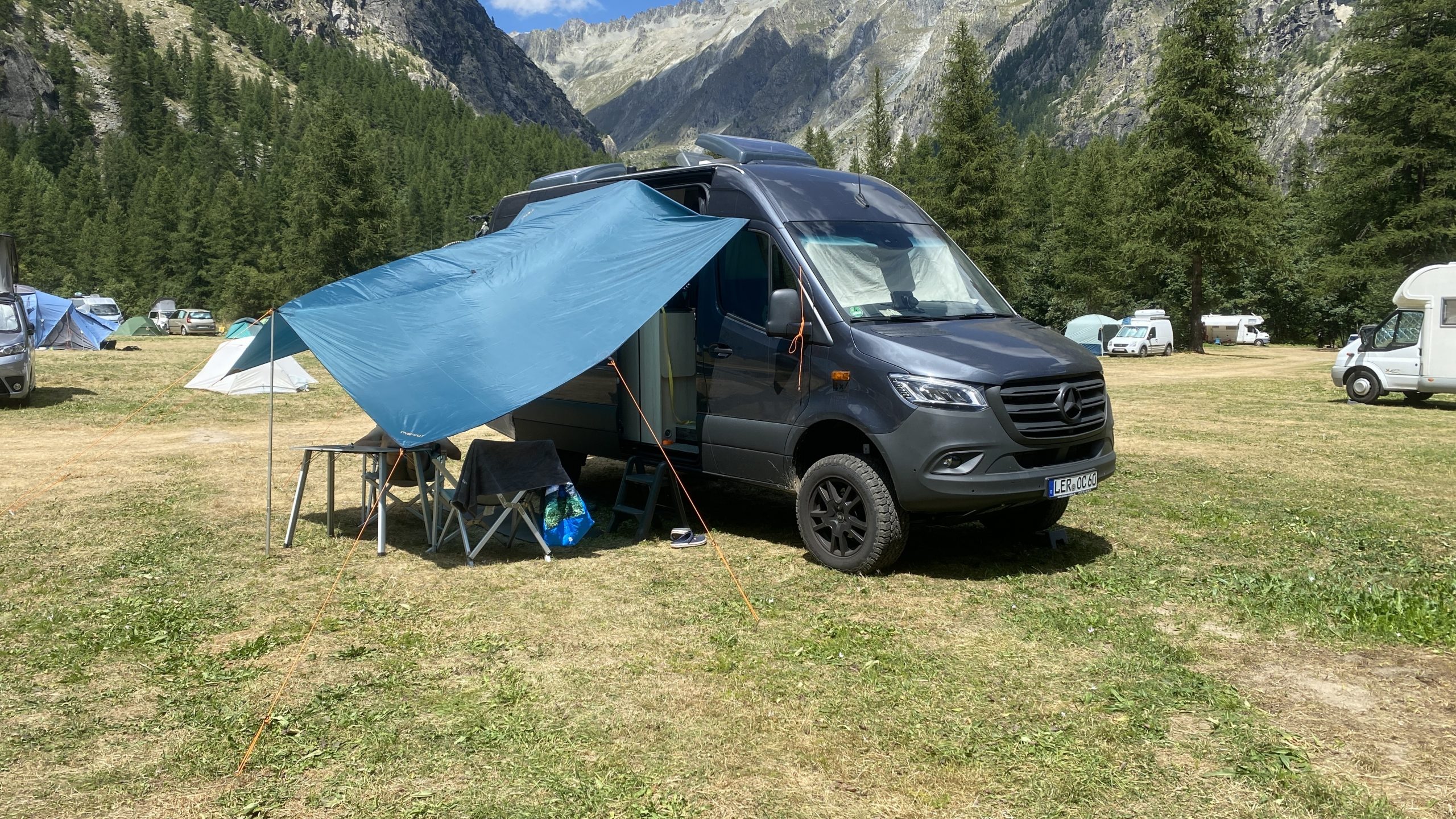 Halber Schlumi-Tag. Zum ersten Mal Technik-Probleme. Nach Hilfe und Suche – eine Sicherung ist durchgebrannt. Da suchen wir dann morgen mal nach einer neuen. Wir testen unser Tarp und sind bei der knallenden Sonne richtig happy.