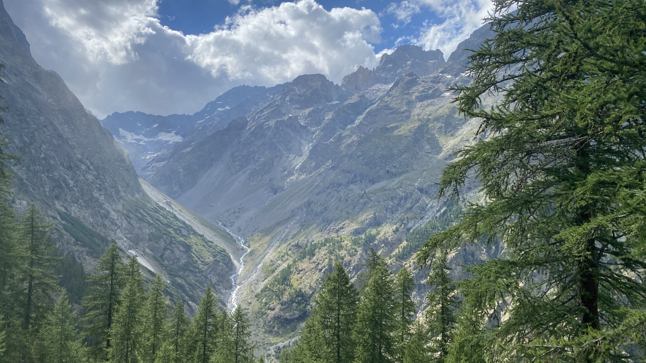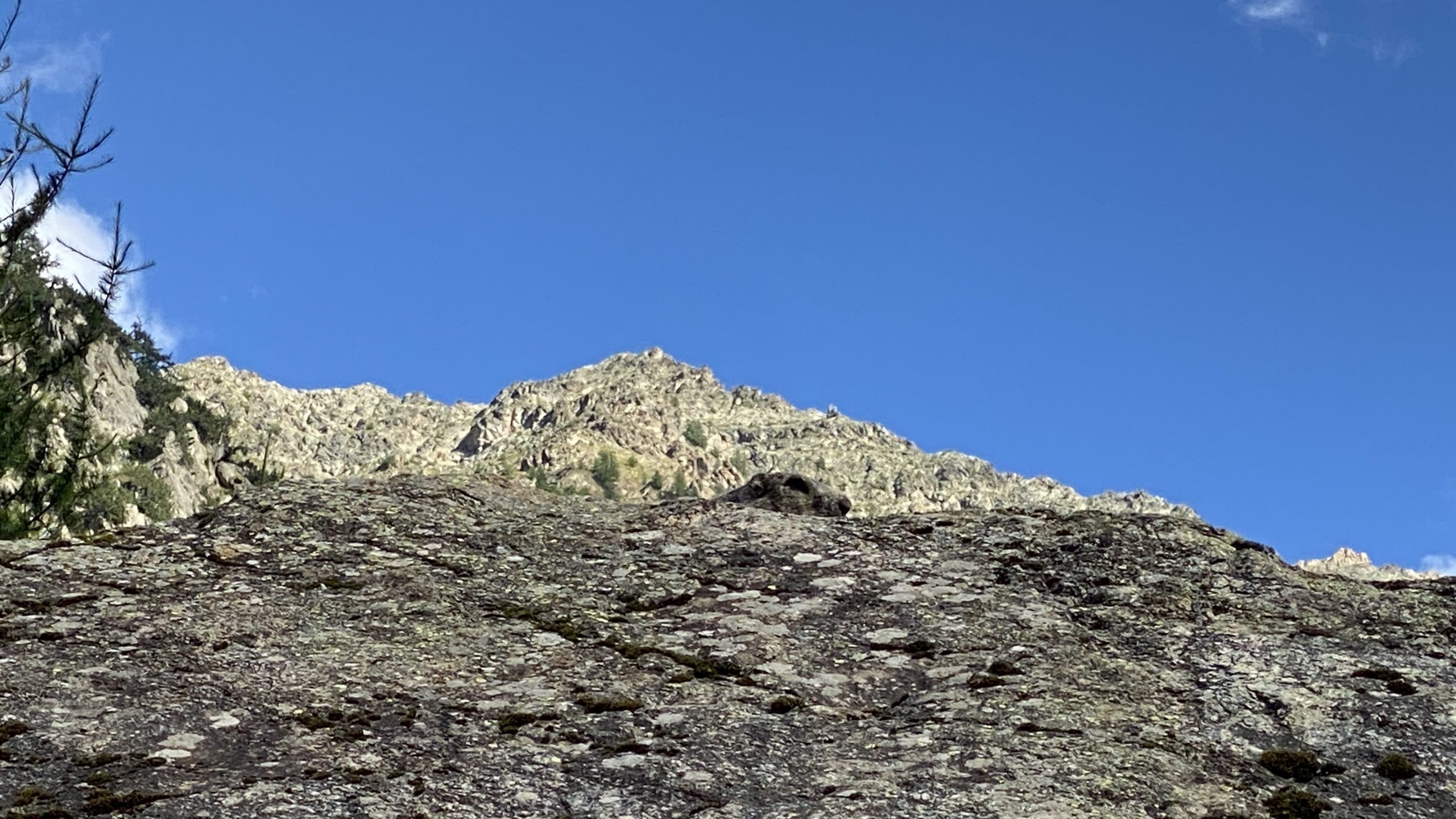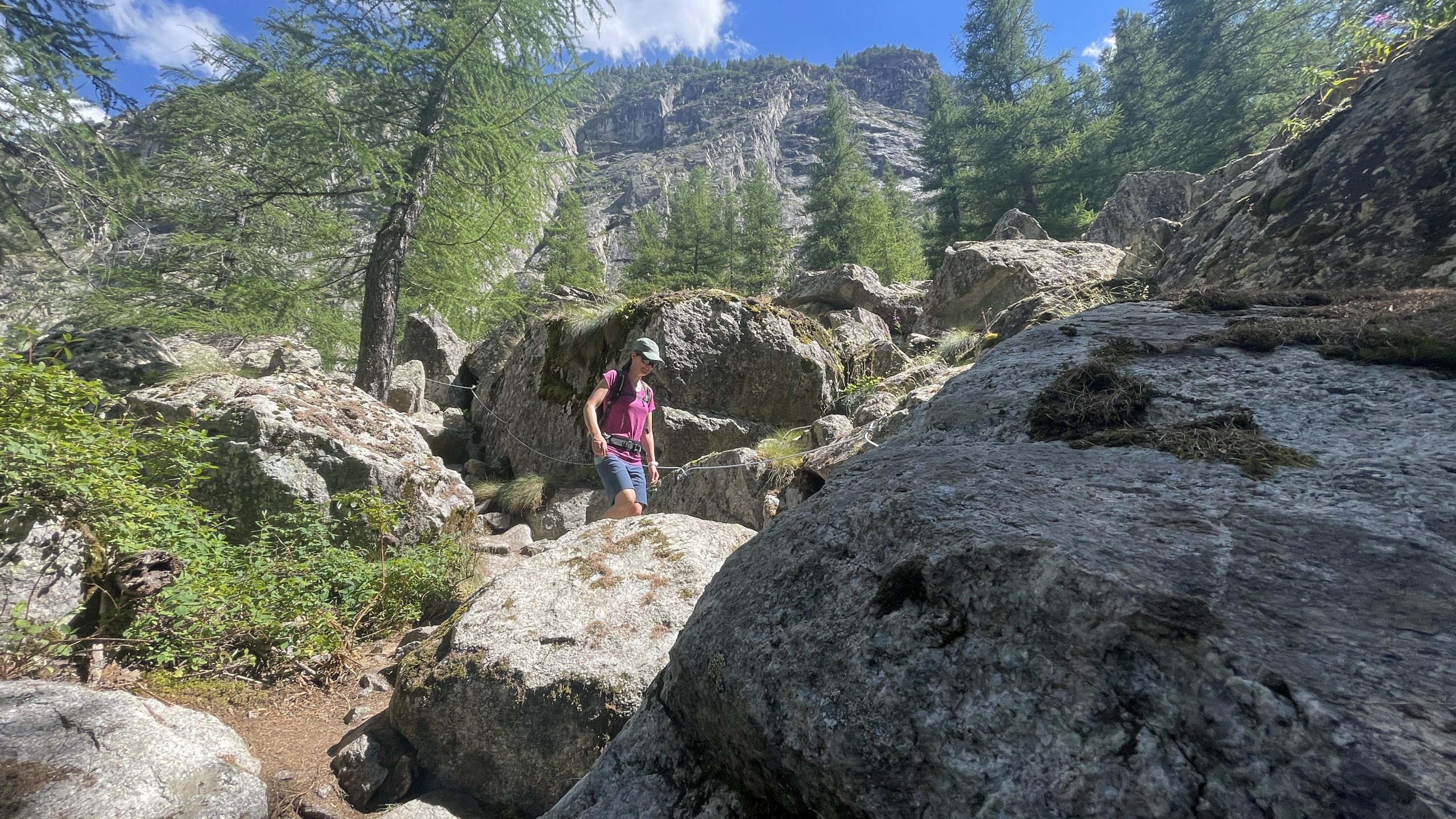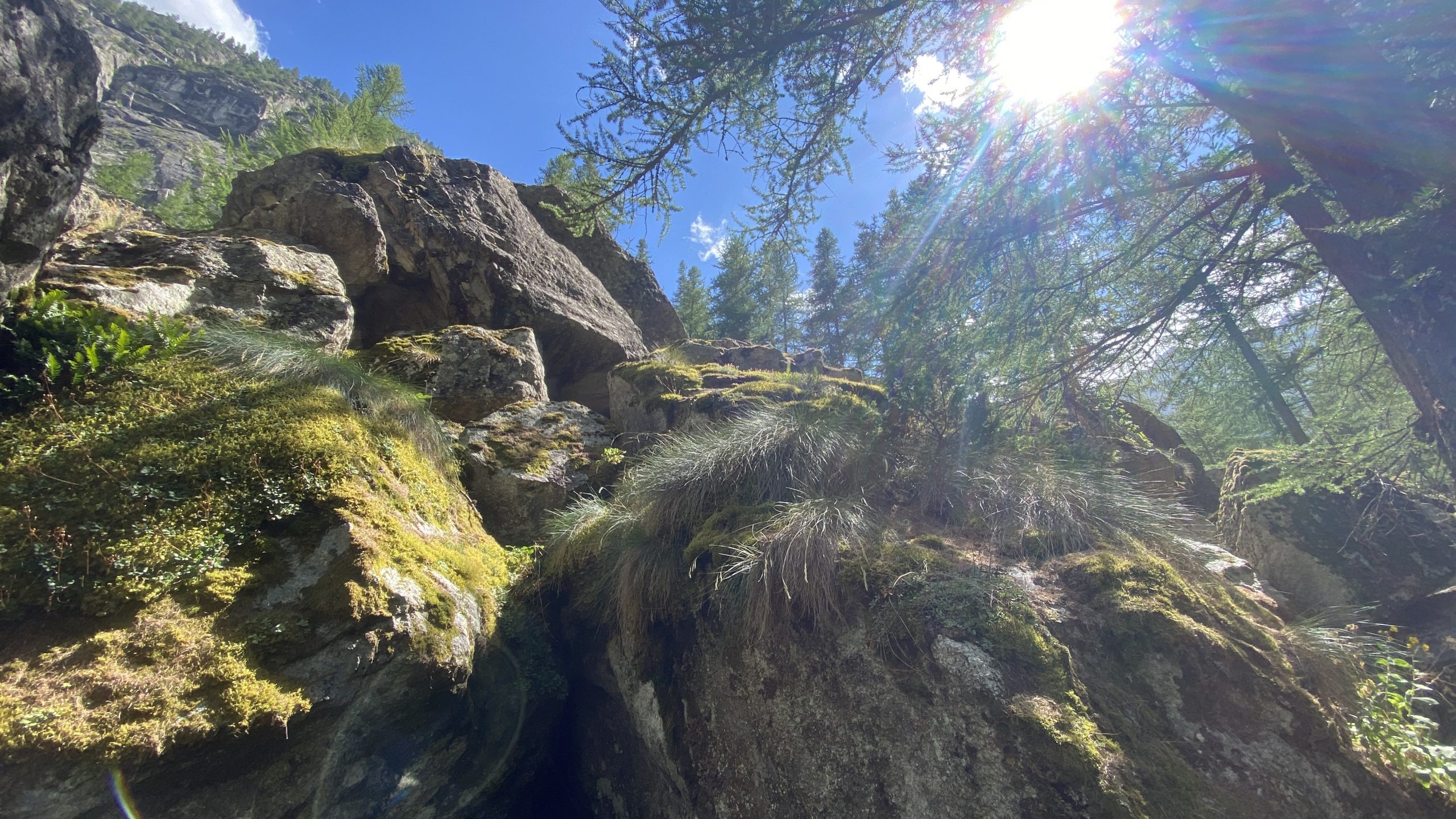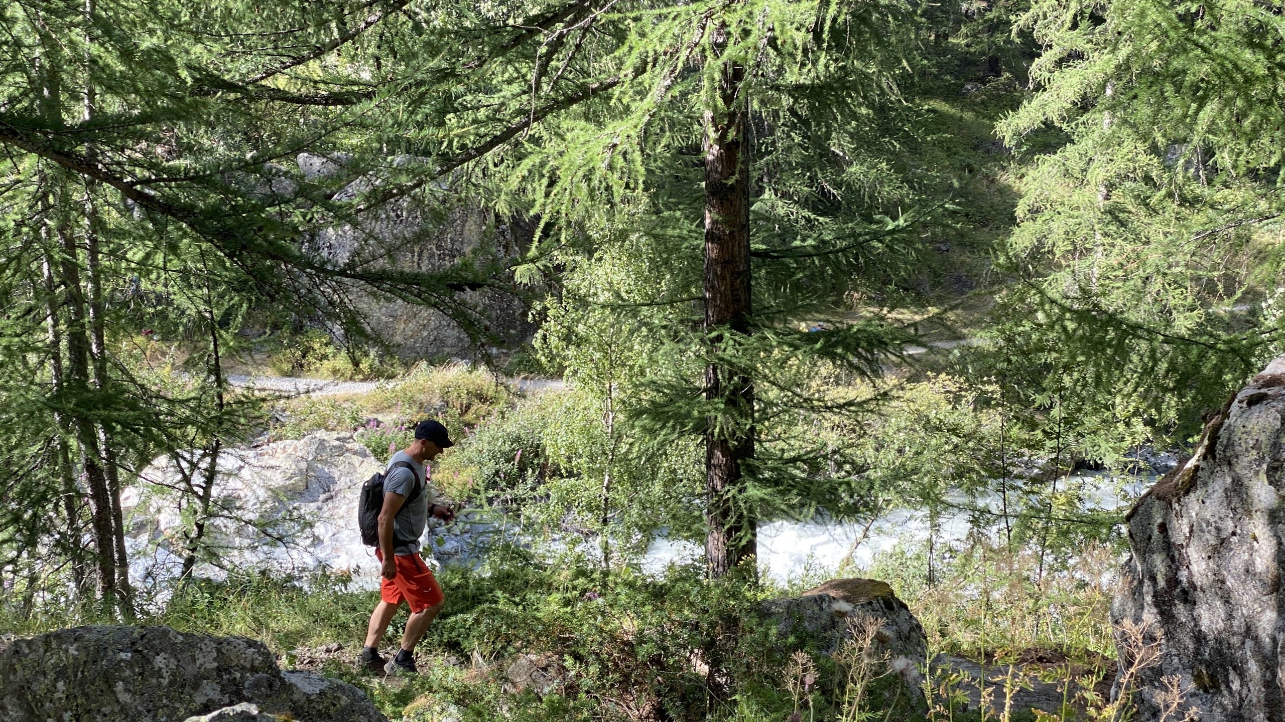 Dann machen wir uns auf zu einem Nachmittags-Spaziergang. Eineinhalb Stunden den Berg hoch – soweit wir kommen. Hinter dem Camping geht es am Fluss entlang, über eine Hängebrücke entlang eines verblockten Flußbettes. Bemooste Steine. Kleiner Dschungel. Dann ein steiler traumhafter Pfad hinauf. Schnell kriegen wir Höhe und haben besten Ausblick auf die Tour von gestern. Wunderbares Licht in einem wunderschönen Bergwald. Eine Mama und Baby Gams sagen guten Tag. Ein Murmeltier chillt auf dem warmen Felsen. Herrlich.