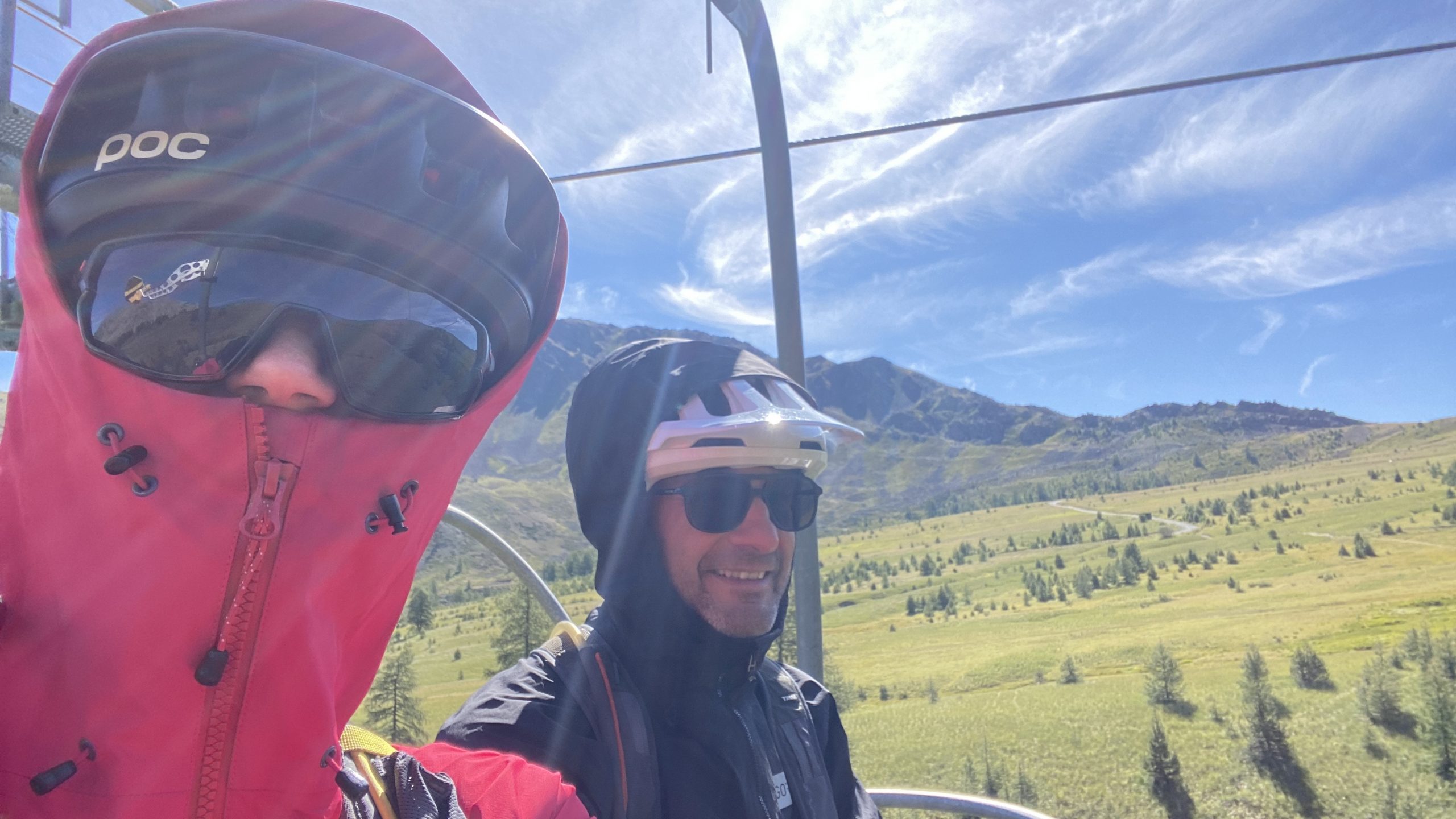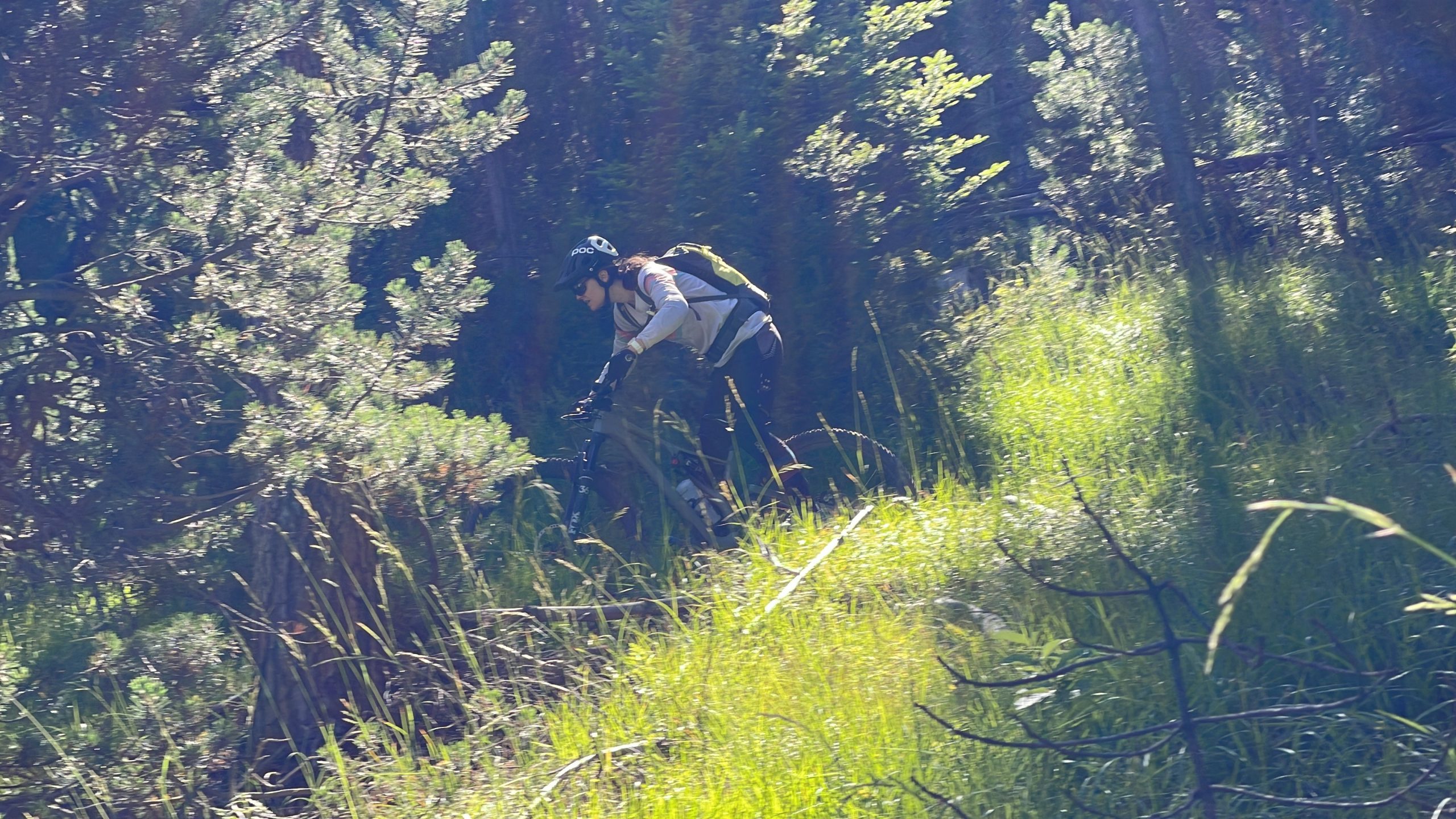 Zunächst geht es mit zwei Liften zum Sommet des Anges (2.459m). Morgens ist es eisekalt im Sturm. Schnell runter Richtung Briançon. Erst durch die alten Ruinen von La Cochette. Ab der Baumgrenze beginnt der Supertrail Nr. 1. Steil, leichte Stufen. S2 – super fahrbar. Der Trailspaß nimmt kein Ende! Mega! Nach dem Trail wären wir für den Tag schon happy.