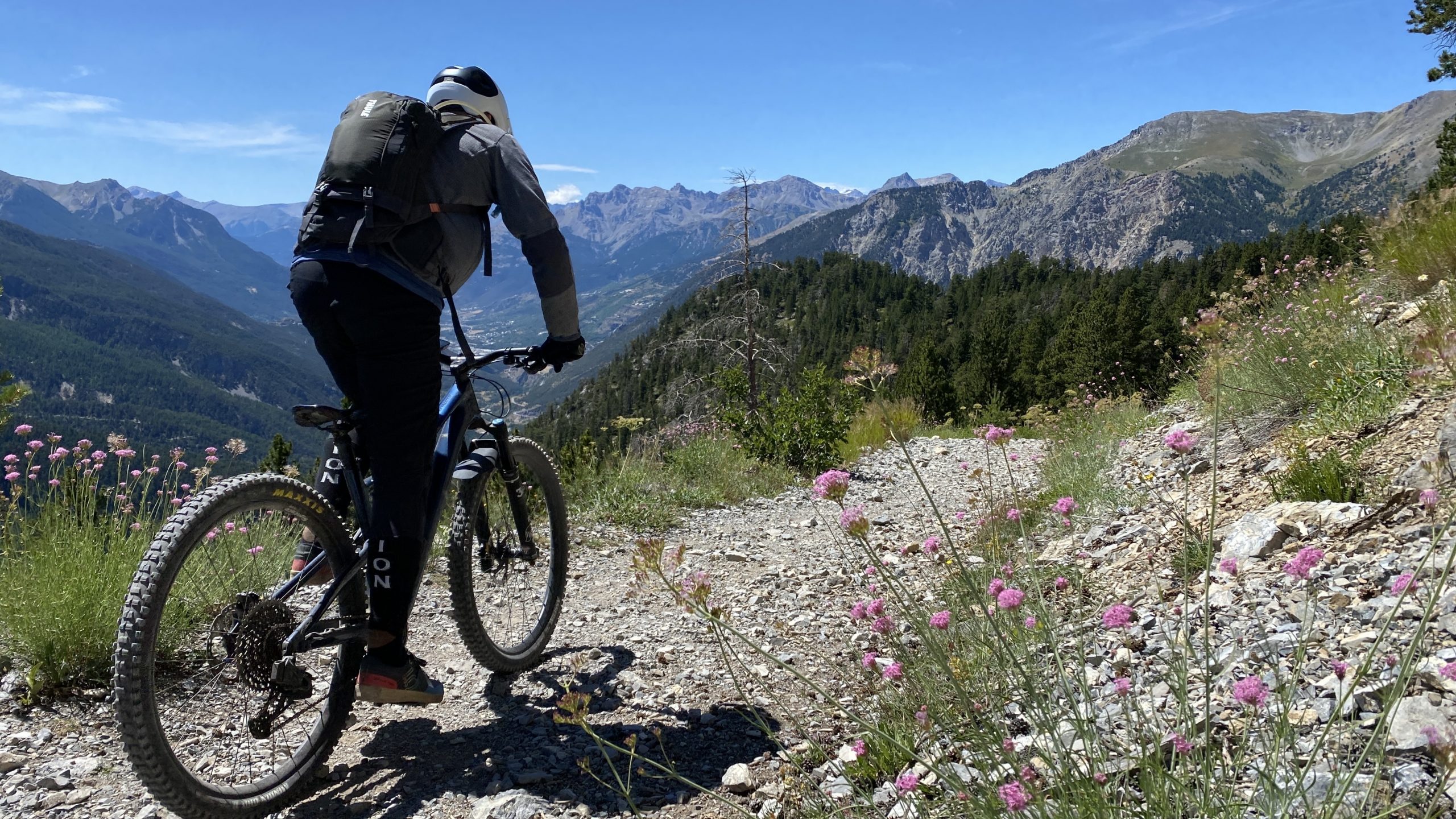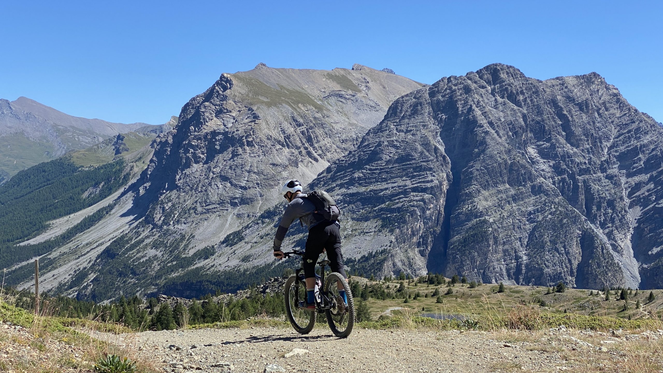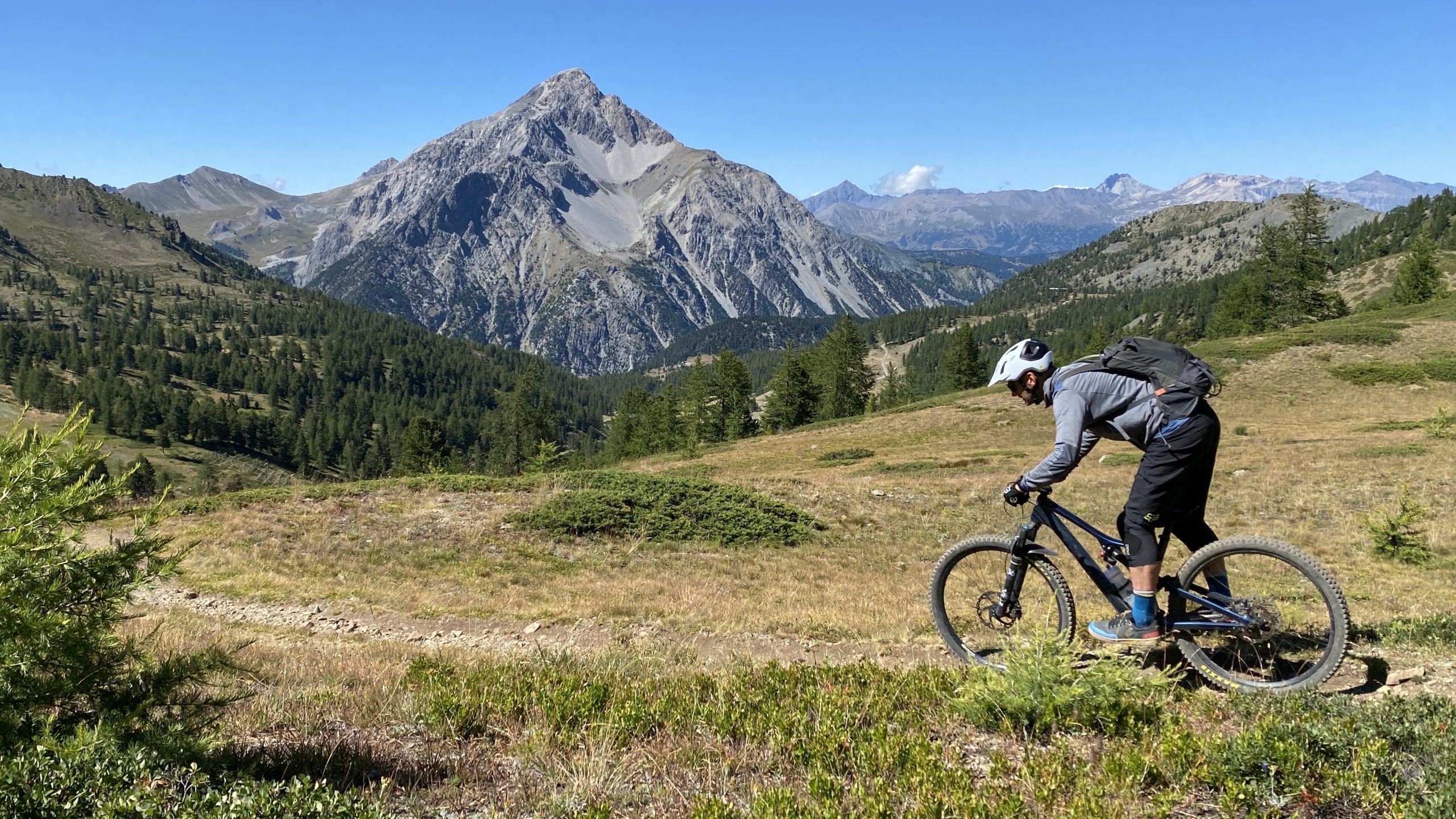 Noch einmal hinauf zum Sommet des Anges. Kurven hinunter, dann hoch zum Col du Gondran. Ab dort fahren wir gefühlt durch Nevada. Eine unbeschreibliche Landschaft. Kein Mensch unterwegs. Stille. Nach der nächsten Kurve müsste das Tal doch mal enden. Nach der nächsten. Nach der nächsten. Irgendwann erreichen wir den Lac Gignoux. Das „Steilstück“ vom Ride-Redakteur ist wirklich steil! Ab da geht es in einen super Trail durchs Grüne mit Blick auf den Mont Chaberton. Ebenfalls endlos.