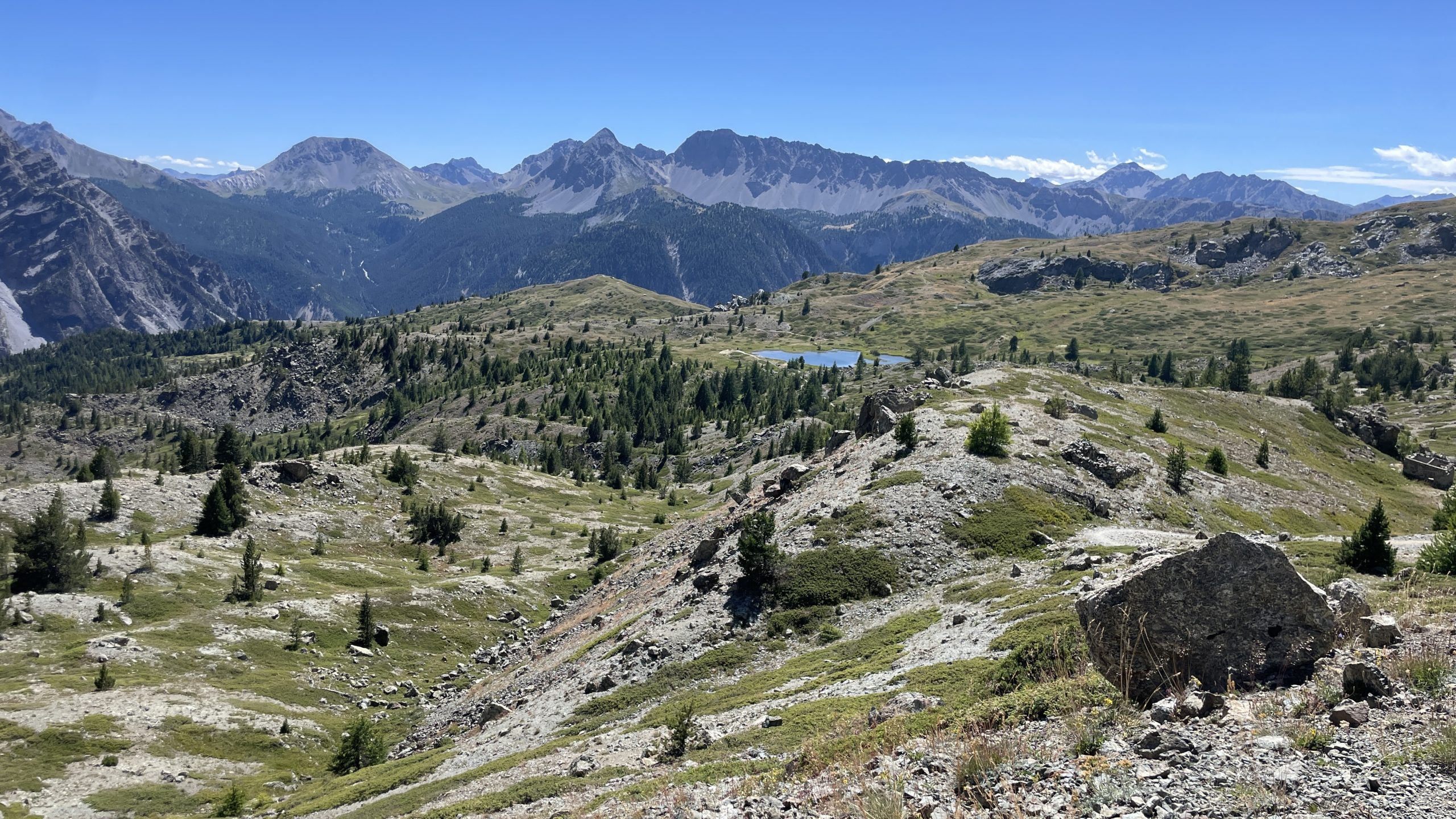 Wir treten 450 Hm wieder zurück den Pass hoch nach Montgenèvre. Von dort aus mit der Gondel Chalvet (2.135m). Erst ein bisschen Panoramaweg mit Panorama Richtung Briançon und Richtung Italien. Dann geht es den perfekten Spitzkehren-Trainings-Trail hinab. Ganz fein.
