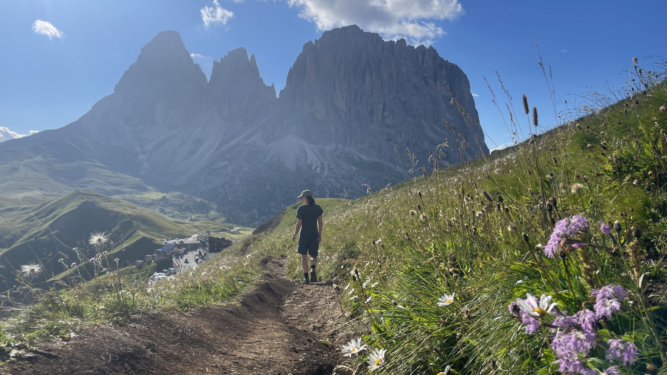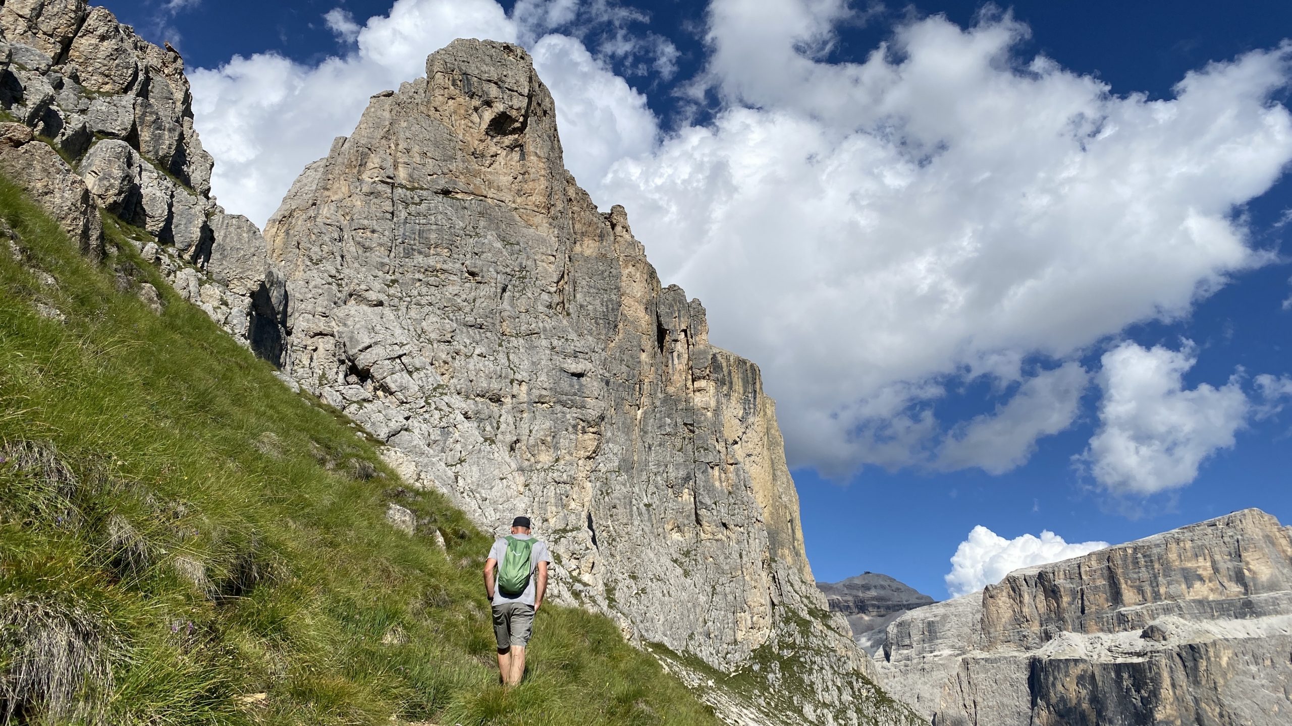 Wir nutzen den Nachmittag, um uns den Einstieg für die morgen geplante Klettertour auf den ersten Sellaturm anzusehen. Hatte ich schon in Arco erwähnt, dass wir Spezialisten im Suchen von Einstiegen sind? Jedenfalls wissen wir jetzt, wo der Einstieg nicht ist und sind zwei Stunden am Sellamassiv vorbeigewandert. Wir vermuten den Einstieg weiter um das Massiv herum – aber an einem Fixseil ist ohne Ausrüstung Schluss. Morgen probieren wir es von der anderen Seite.