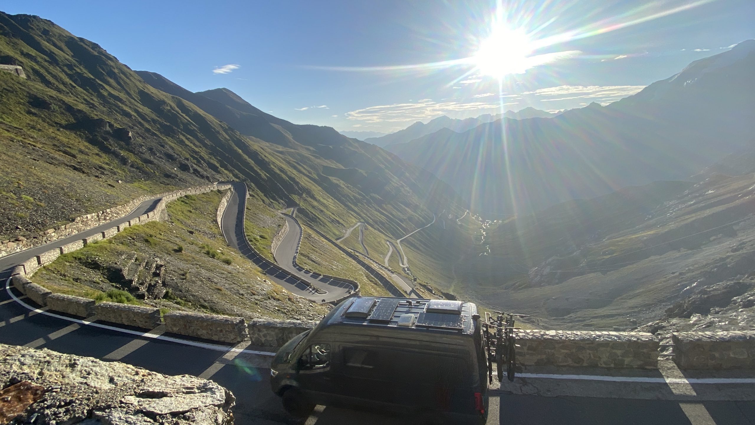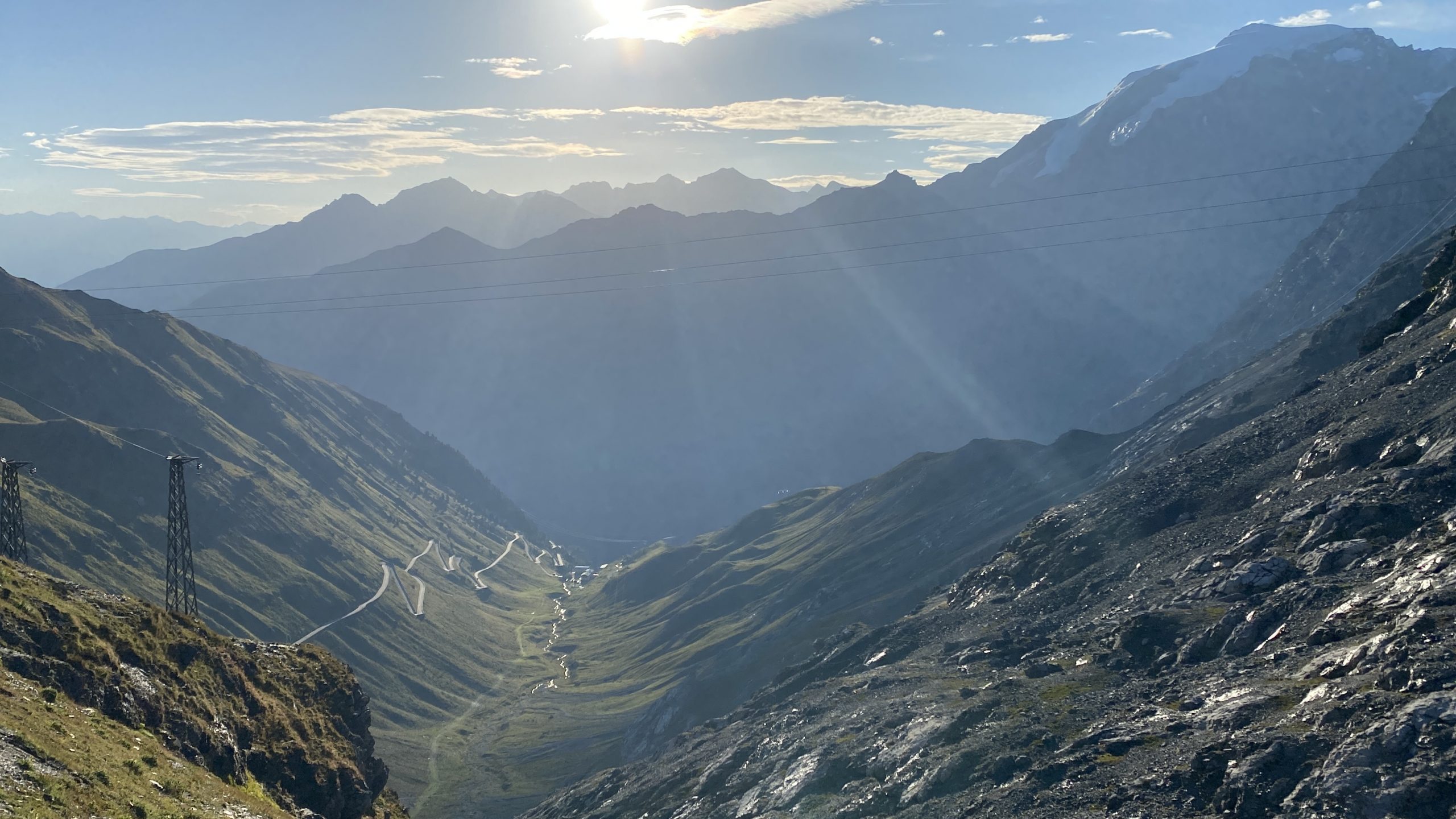 Nach dem ordentlichen Gewitter und Regen in der Nacht fahren wir früh das Stilfser Joch (2.757m) hinab. Immer wieder wunderschön – der Blick auf den König Ortler. Dann im aufgehenden Morgenlicht. Noch keine Motorräder unterwegs. So lassen sich die 48 Kehren vom Joch wunderbar fahren. Erst unten in der dritten Kurve begegnet uns Erwin vom Bike-Shuttle.
