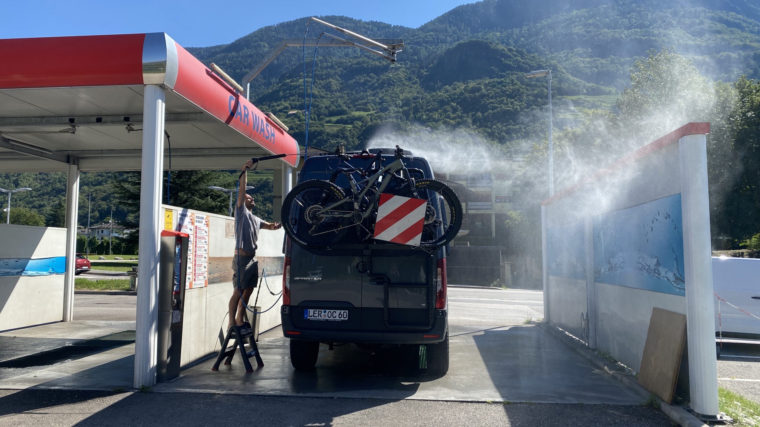 Die Fahrt vorbei an Meran nutzen wir für einen Refill. Gas gibt es im zweiten Anlauf im Obi. Einkaufen und den dreckigen Camper waschen.