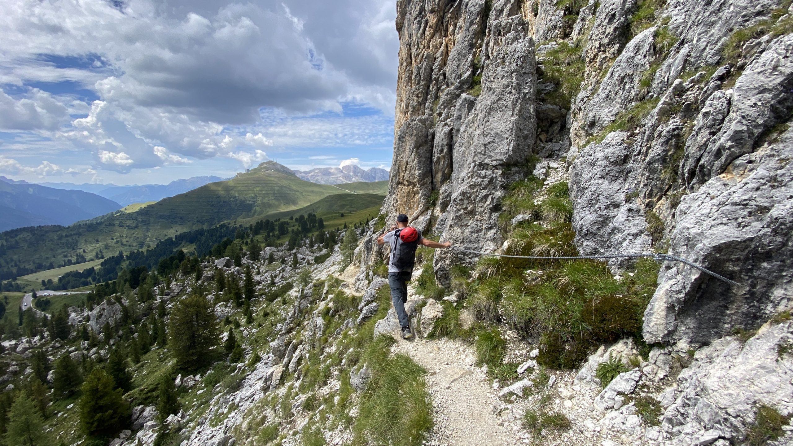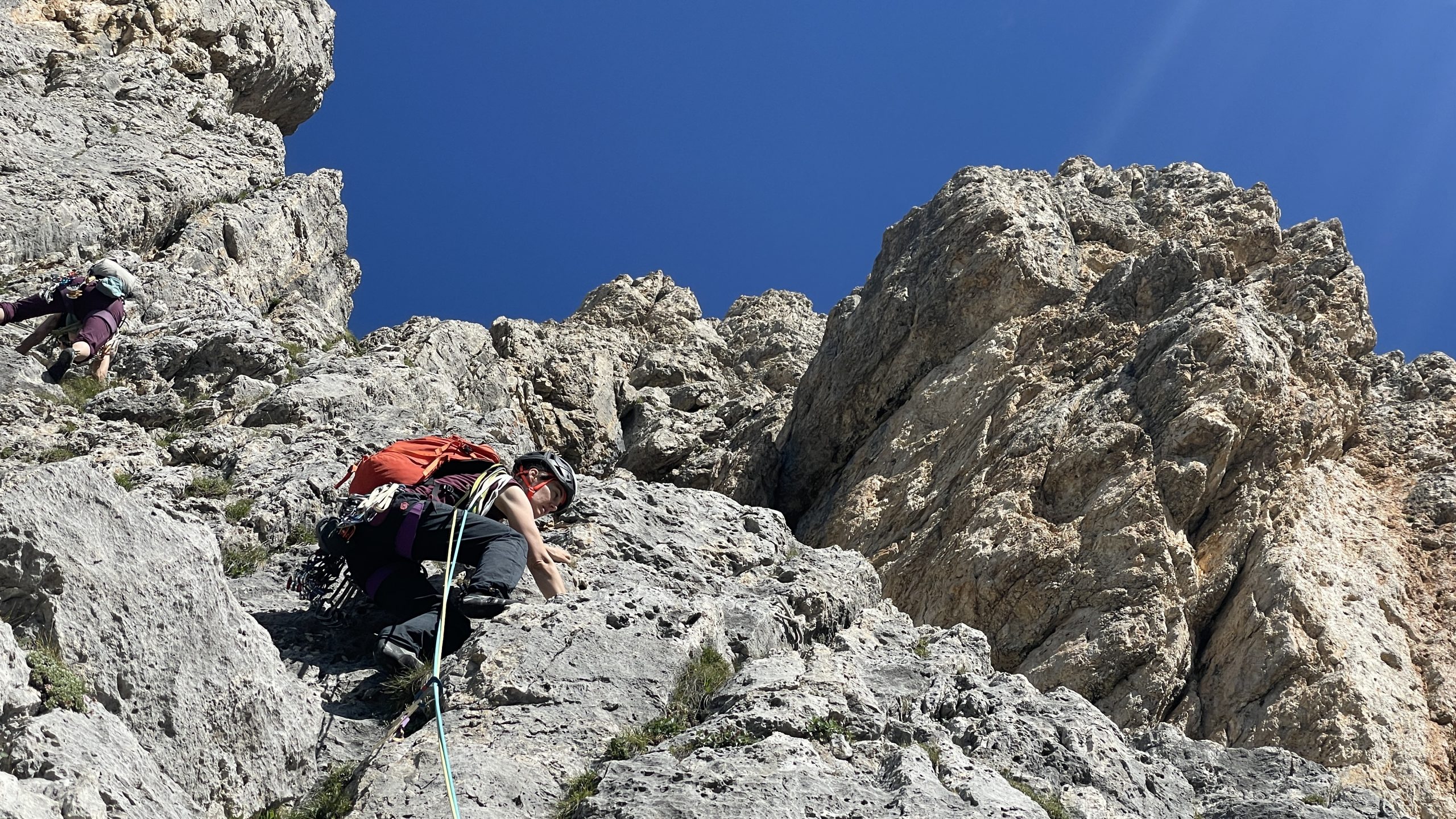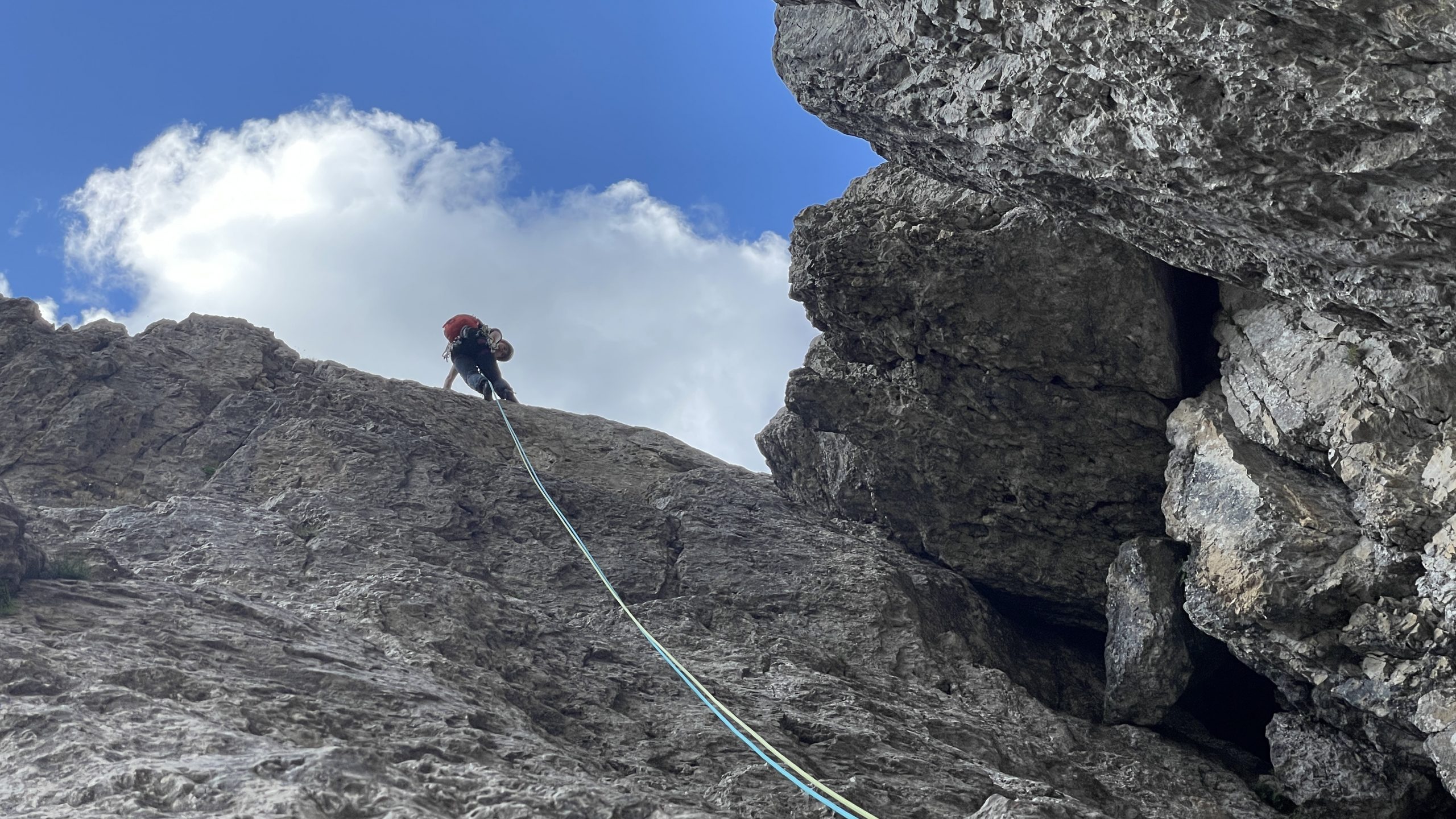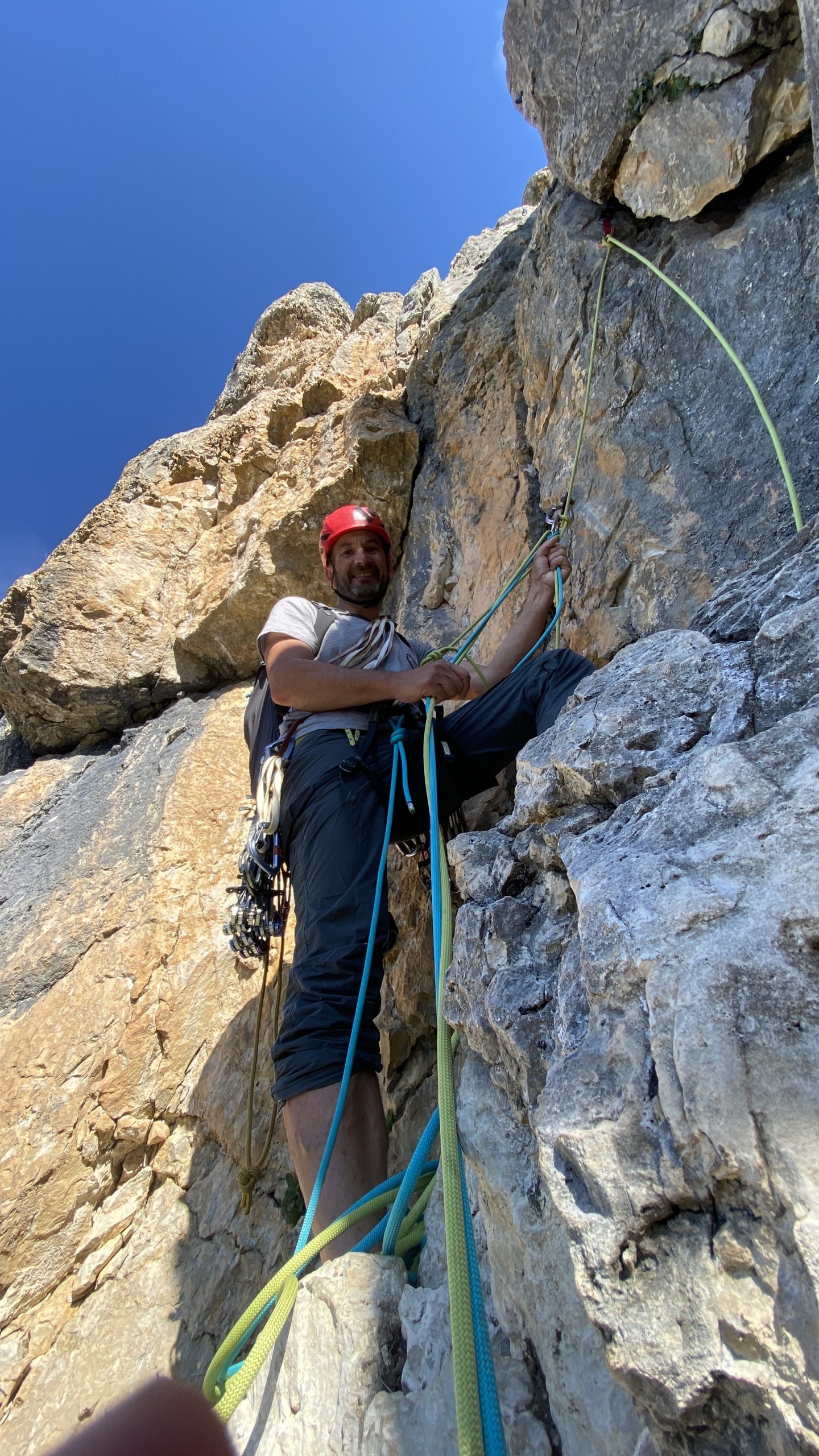 Vor uns zwei Seilschaften, hinter uns eine. Die erste Seilschaft weicht beim Anblick des 16-Jährigen Kletterers aus dem italienischen Nationalkaders für Speed-Klettern in die Nachbar-Route aus. Perfekt. Die Vater-Sohn-Kombi kennt die Route und ist schnell. So finden wir die erste Seillänge und den ersten Stand auf Anhieb. Danach wird es kniffliger. Der Fels ist trocken, super griffig – perfekt. Die Absicherung kann noch ergänzt werden. Meistens lassen sich gut Sicherungen legen. Happy oben. Über Abseilen, kurzer Abstieg, noch einmal Abseilen hinunter. Im Trockenen wandern wir zurück zum Bus.