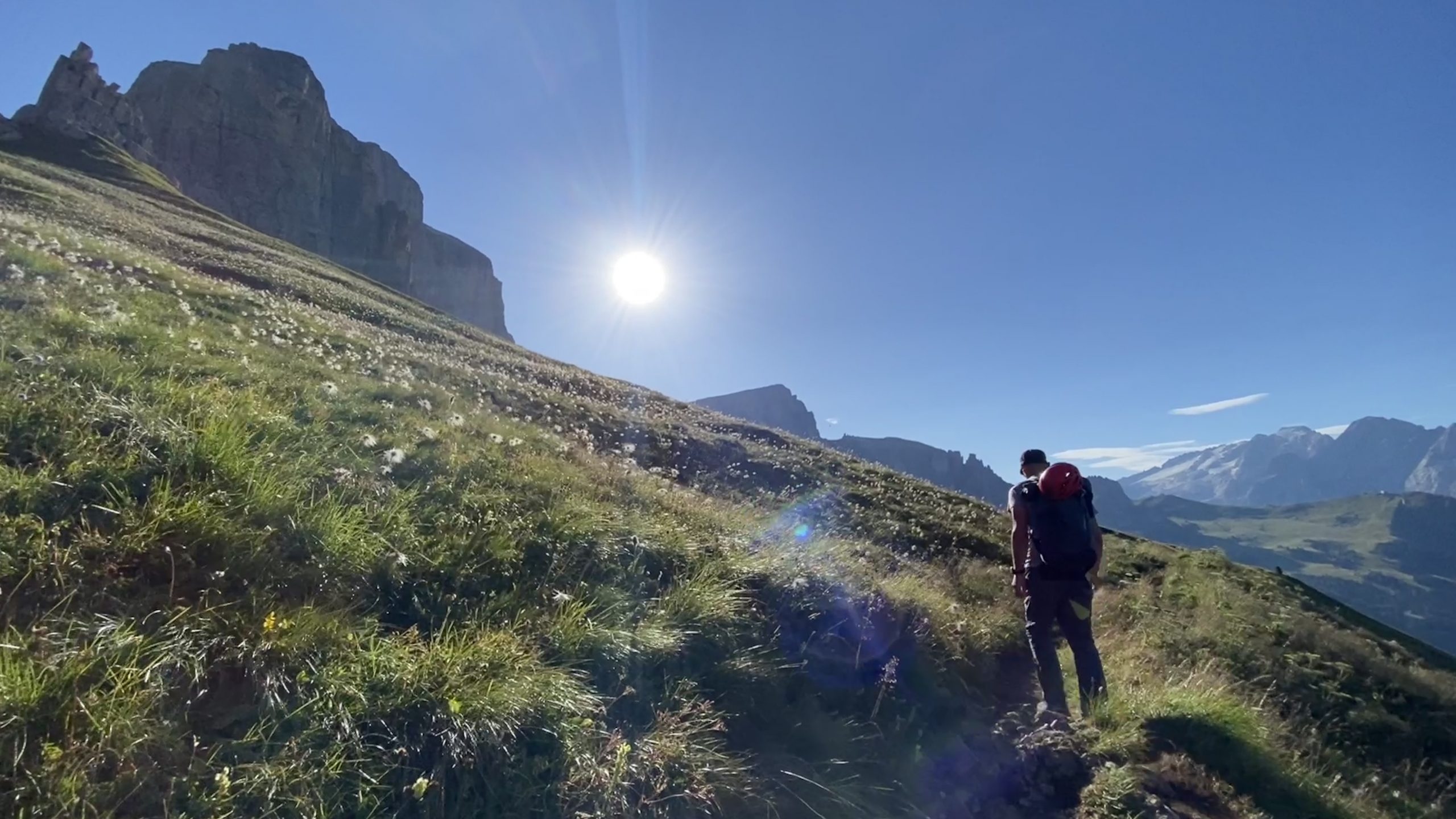 angesagt ist, wollen wir heute früh los. Das klappt. Sonnenschein. Heute nehmen wir den richtigen Pfad zur Klettertour „Frecchia bis“, 5 Seillängen, 150 Höhenmeter, 4. Den Einstieg finden wir heute Morgen ganz easy: immer den anderen Kletterern hinterher.