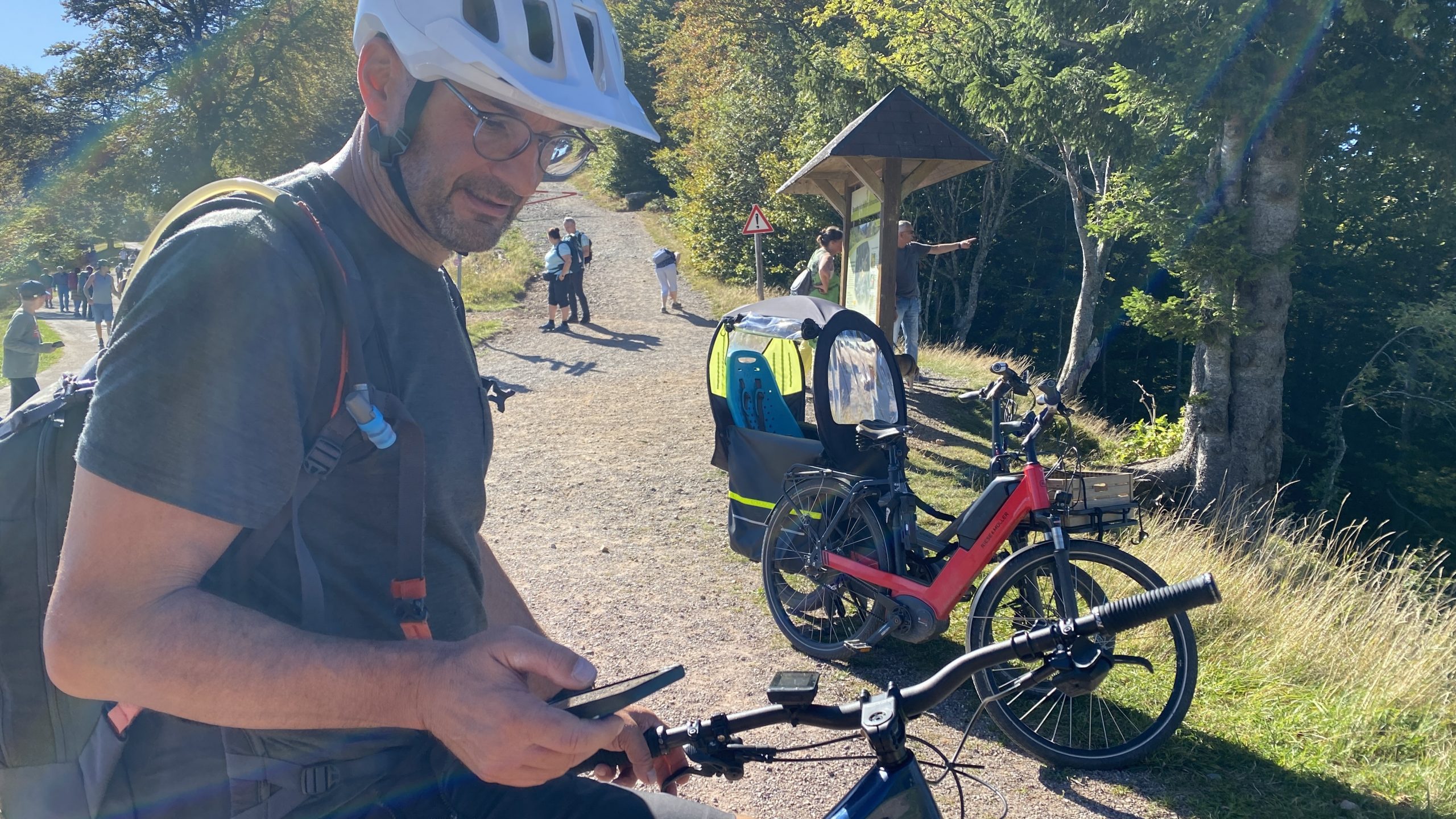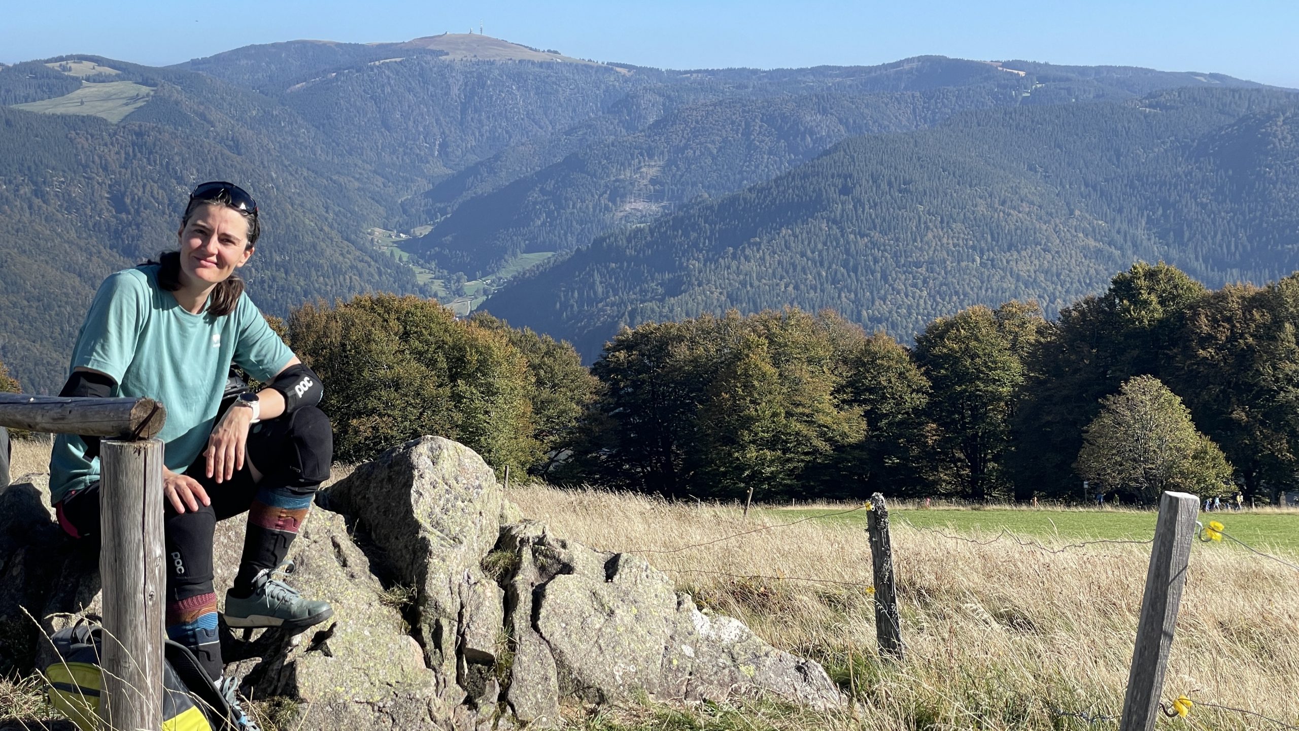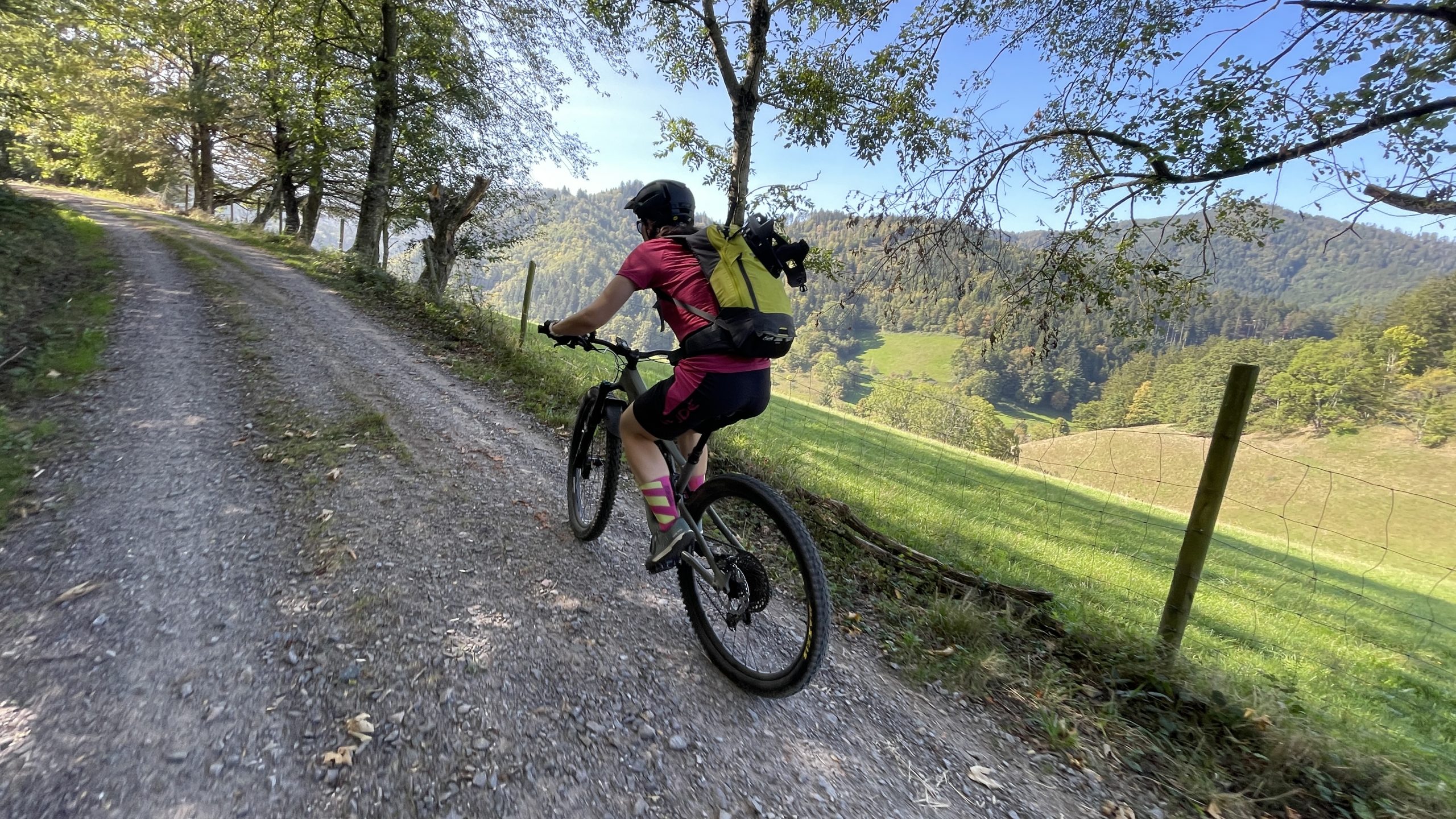 Das Brötchen oben am Schauinsland-Turm schmeckt so richtig. Wir genießen die Sonne. Dann geht es ab in den Trail „Badish Moonrising“. Der Trail ist richtig toll. Den hatten wir ganz anders in Erinnerung. Der macht richtig Freude. Vielleicht liegt es daran, dass wir mit mehr Schwung nicht so viel wie letztes Mal treten müssen.