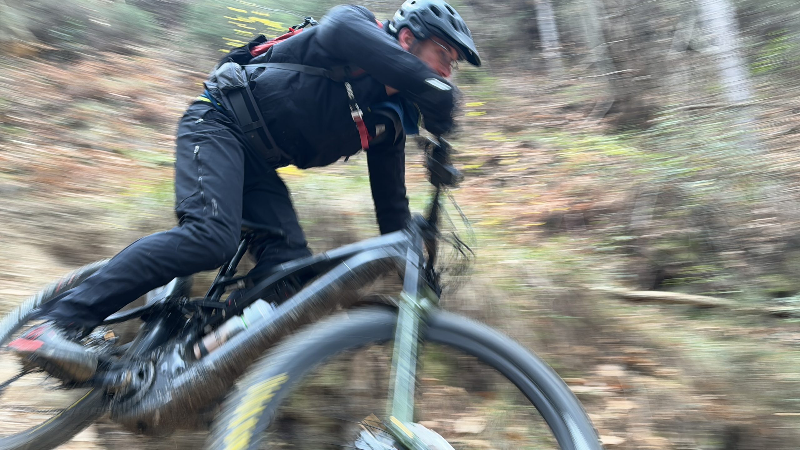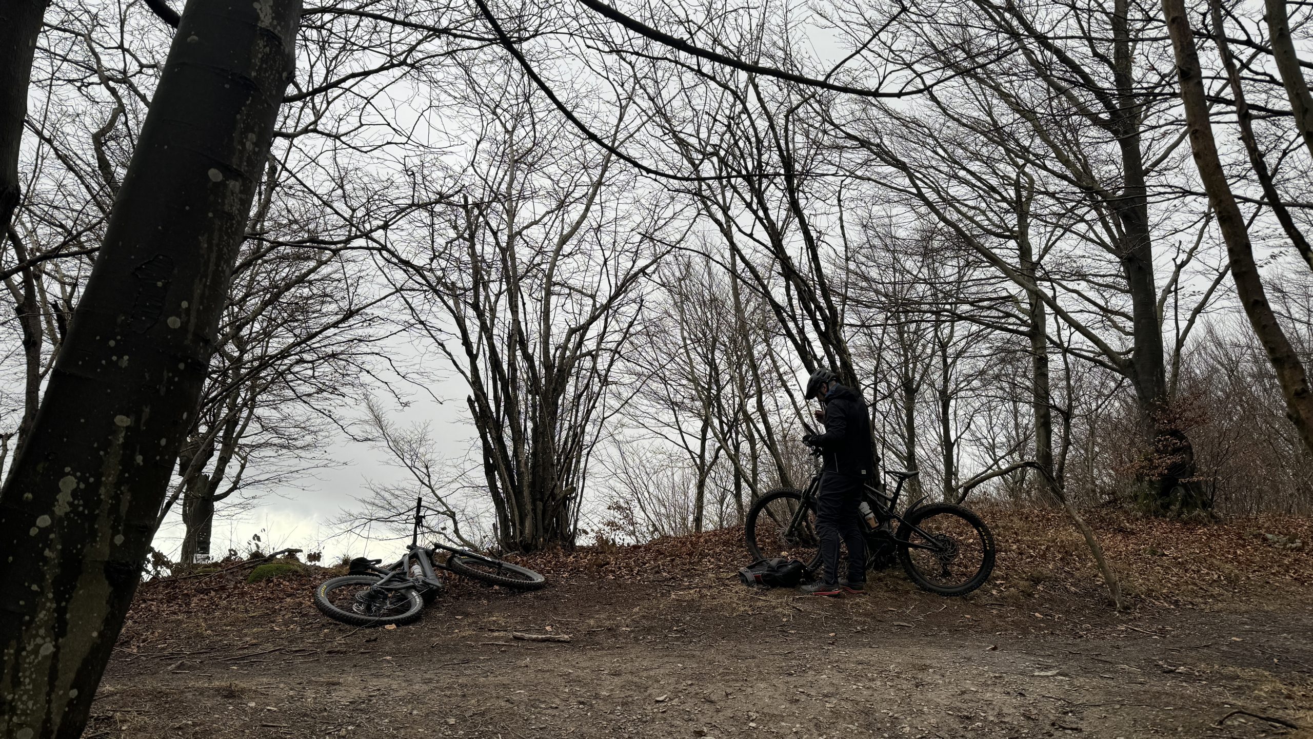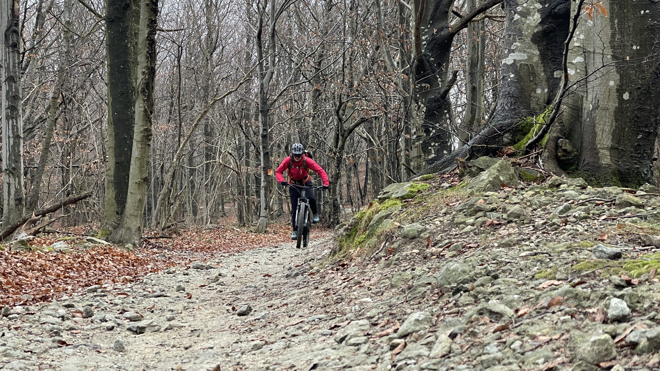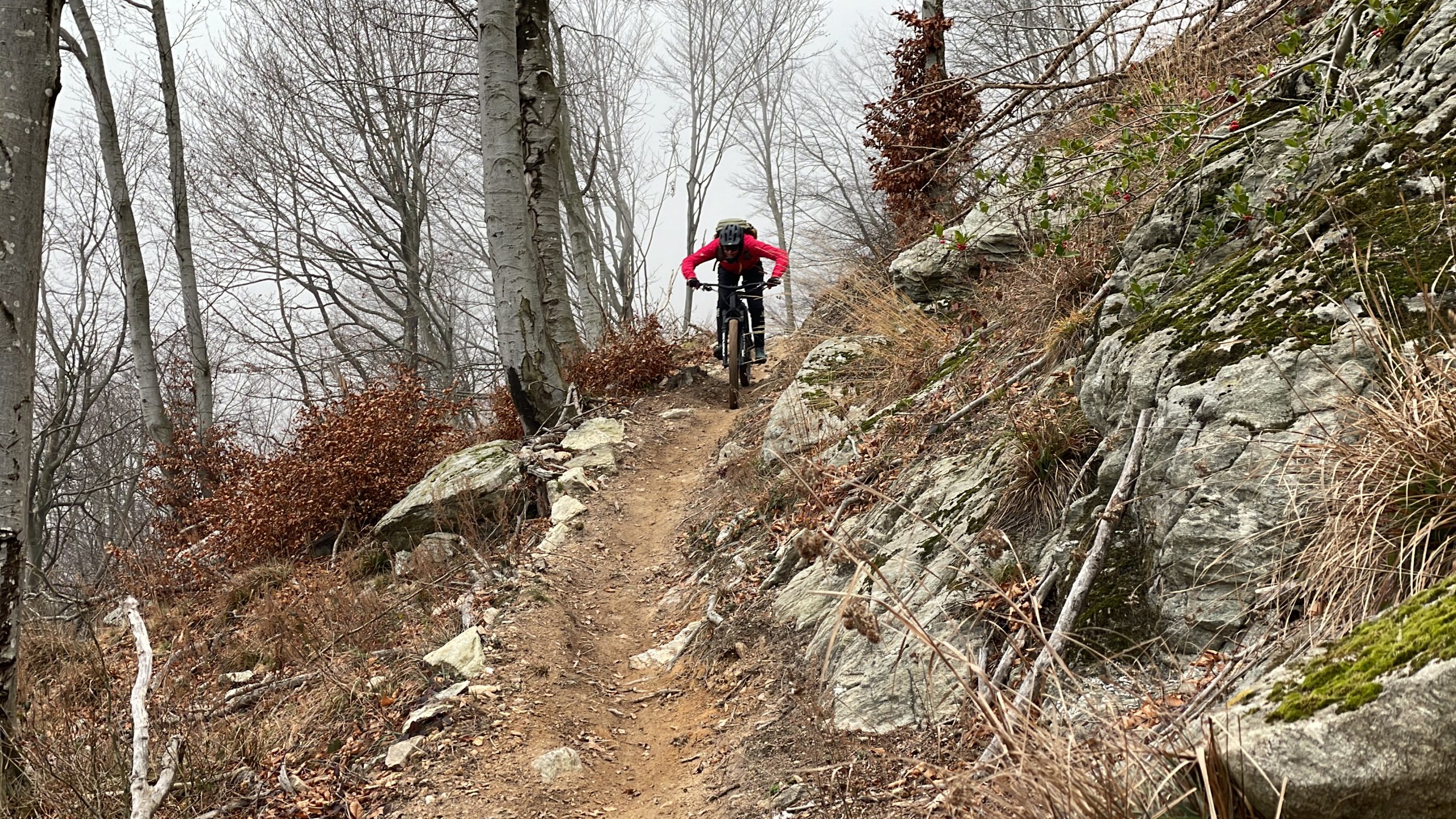 Wir starten hoch zum DIN. Die Querung hoch ist schön. Dann weiter hoch zum Bric Merizzo (1.275m). So heißt auch die heutige Tour „Bric Merizzo“. Dieses Jahr liegt kein Schnee mehr. Feucht und kühl ist es trotzdem. Wir fahren den „Fast and Furious“. Nach einem nassen Einstieg ist der Trail trocken und macht richtig Spaß! Steile Rampen, enge Kurven, schön gebaut.