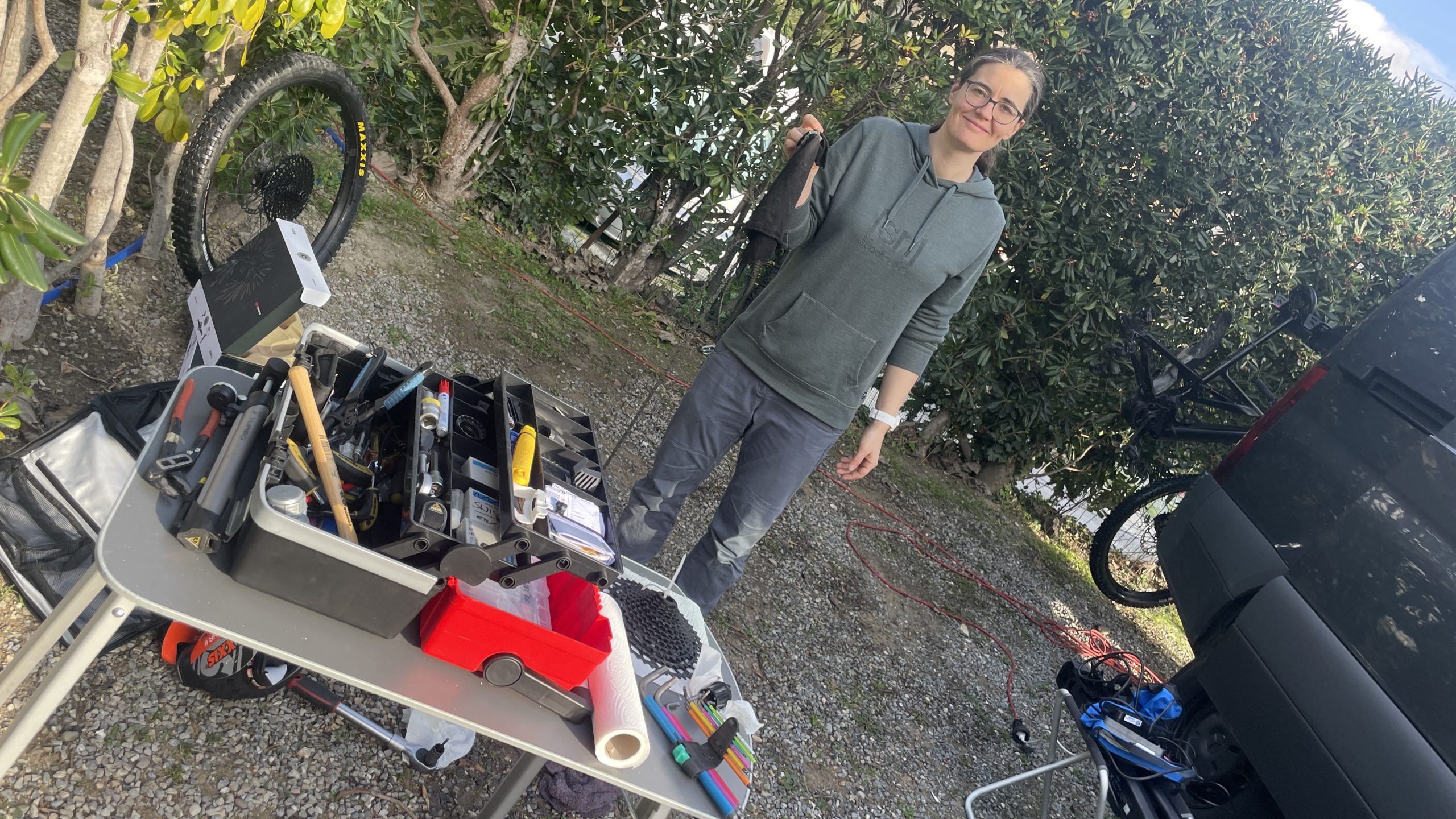 3.10.2025 Wir starten den Tag mit einer Yoga-Stunde. Herrlich. Den Vormittag haben Wirkung frei gelassen. Den nutzen wir zum Einkaufen. Da unsere Ketten rasseln bitten wir Stefan von Stefans Bikeladen um Rat, da wir die neue Schaltung noch nicht kennen. Das ist Mega...