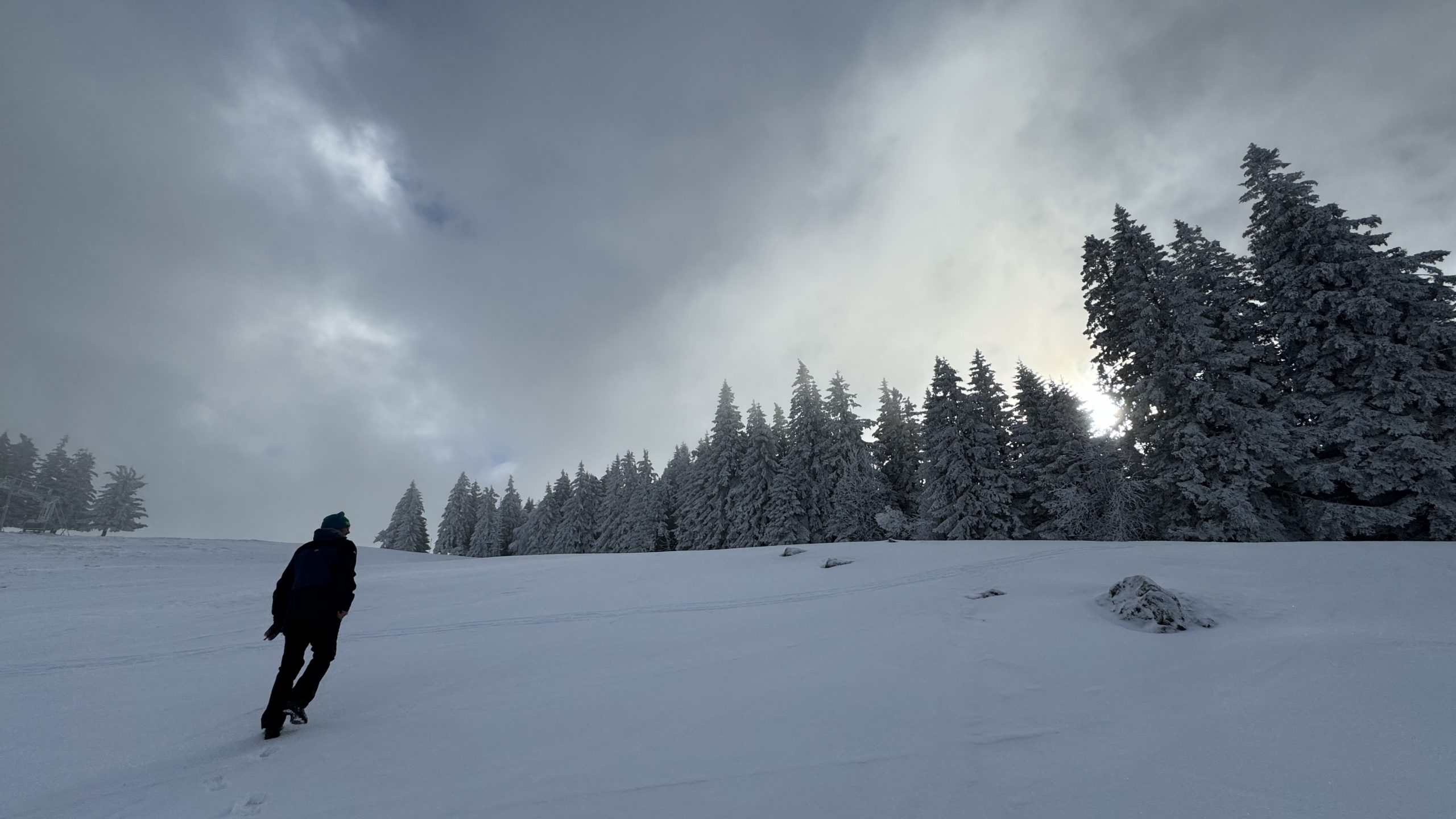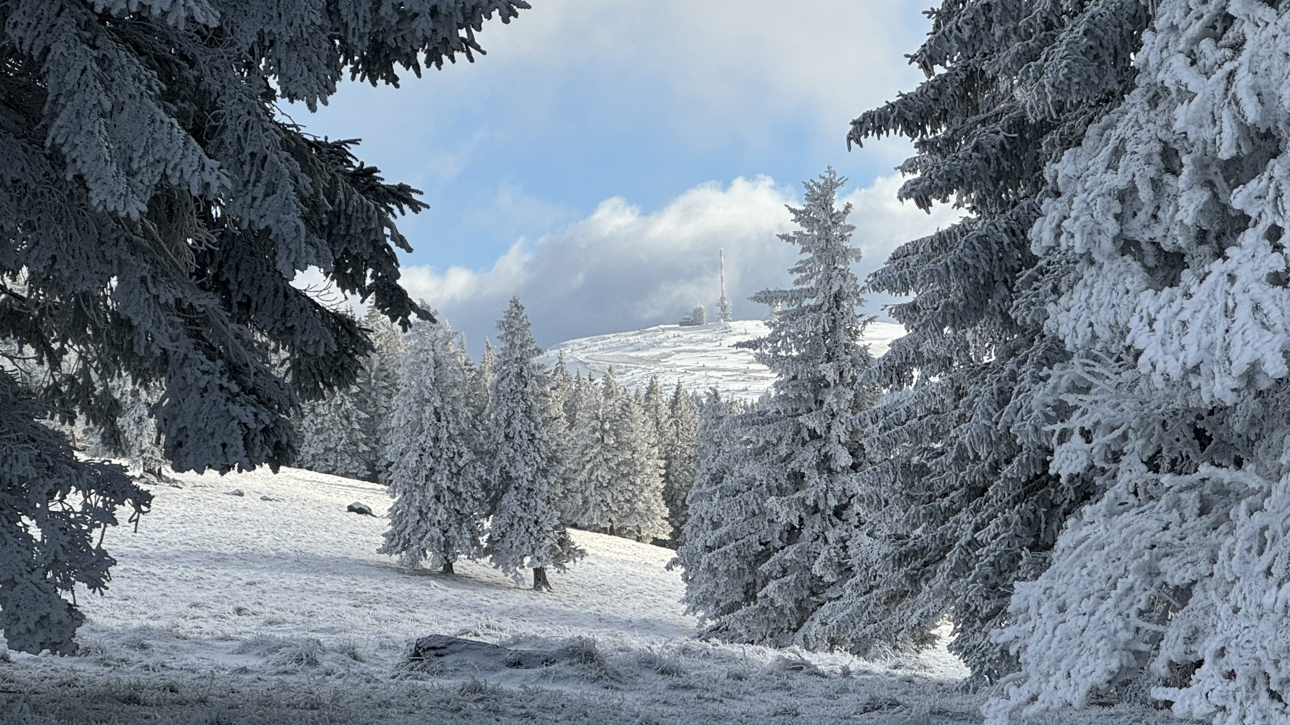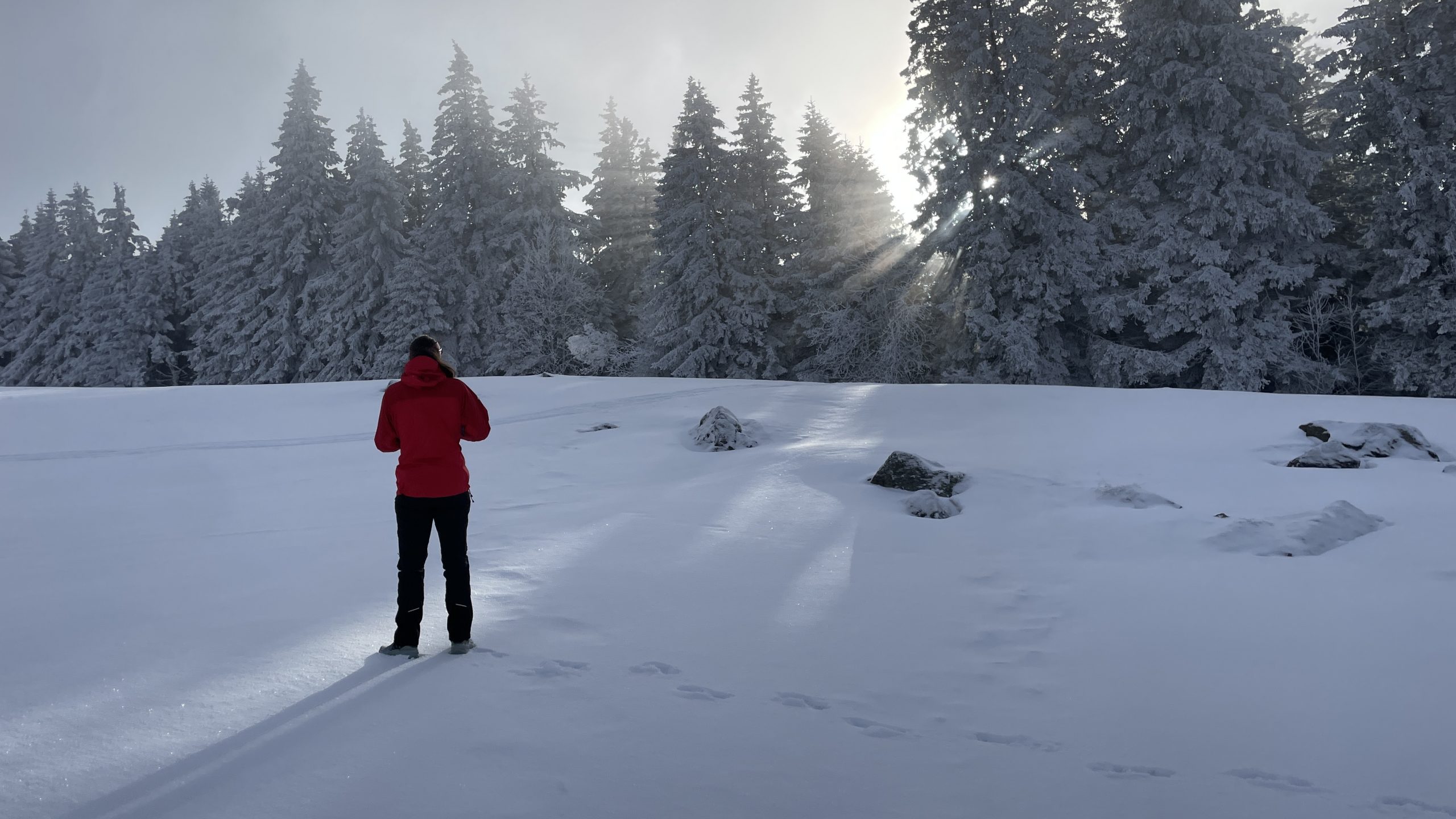 Wir drehen eine kleine Runde von der Stollenbacher Hütte. Es liegt Schnee und ist frisch. Der Blick vom „Tote Mann“ ist sensationell – ein Spiel aus Sonne, Wolken, blauen Himmel und weiß-gefrorenen Bäumen. Traumhaft.