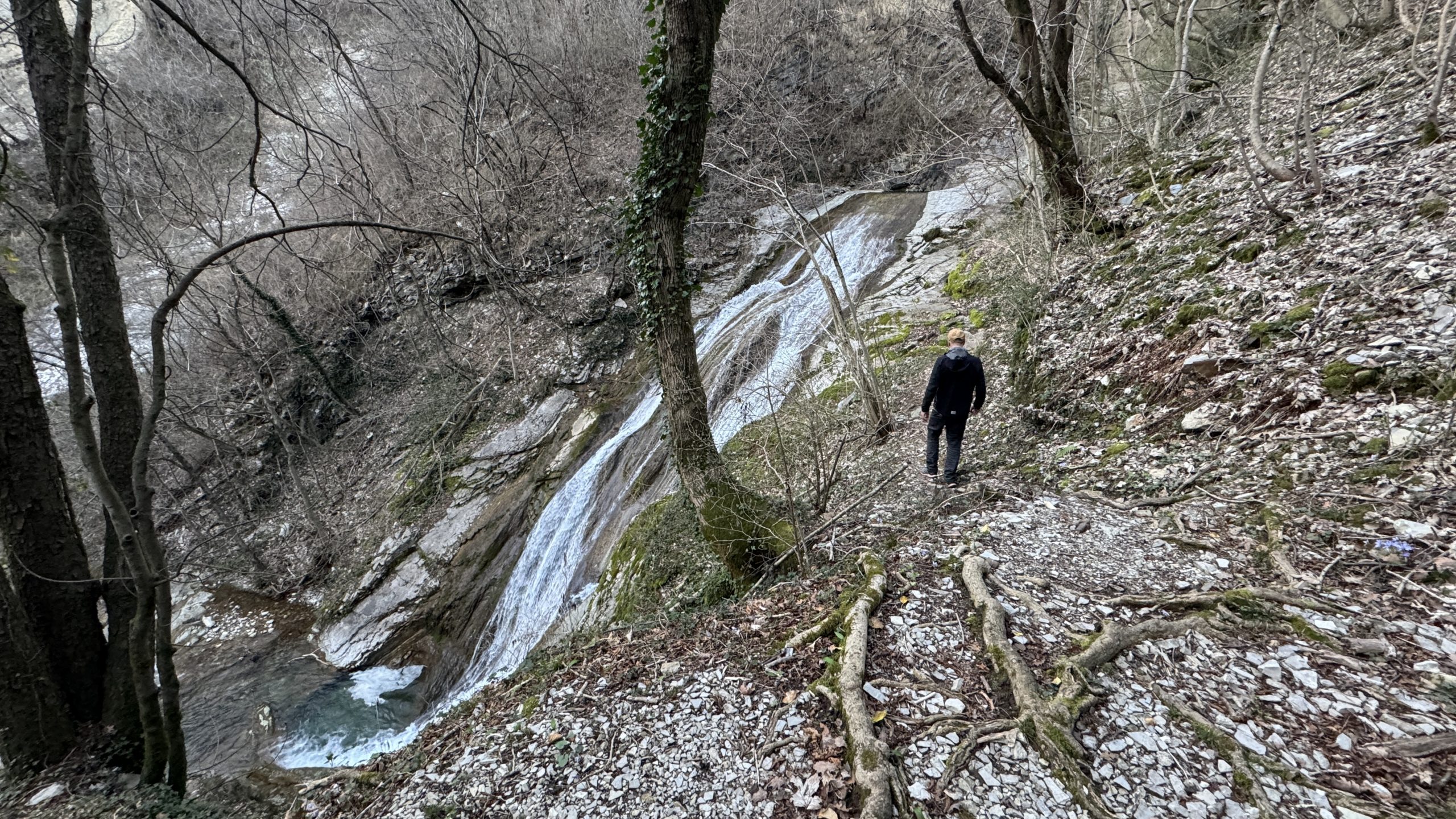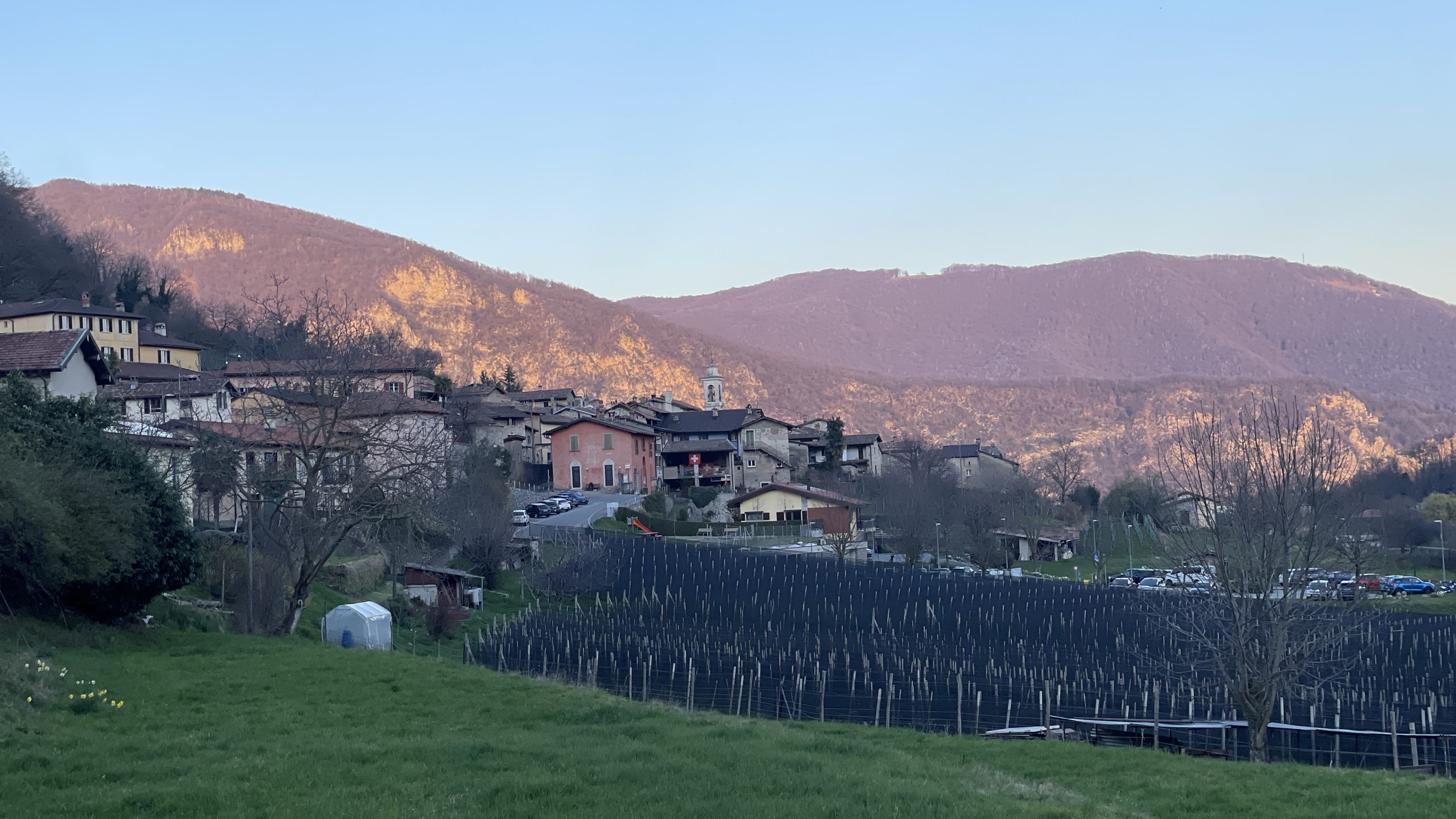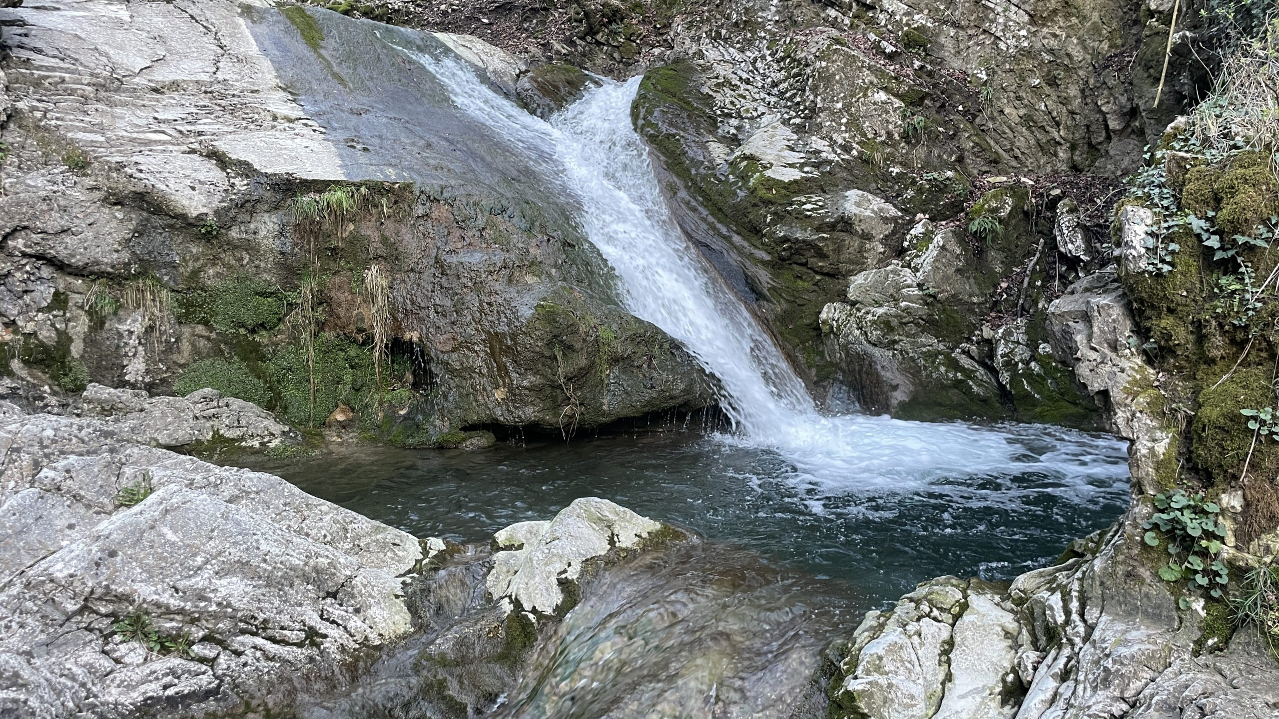 Es geht weiter – ein Stück in Richtung Norden. In Mailand haben wir ein bisschen Pech und stehen eine Stunde hinter einem Unfall. Heli. Volles Programm. Faszinierend, wie man in Italien so selbstverständlich über die Autobahn spaziert. Bei Como wollen wir ein Päuschen machen. In Meride finden wir einen Parkplatz mit einem grauen Sprinter, der so aussieht wie wir. Wir bleiben dann doch hier und drehen zu Fuß eine kleine Runde. Hier bekommt man schnell Höhe und einen Blick hinunter in das kleine Örtchen. Beim Rückweg schauen wir uns den Wasserfall mit Gumpen „Terrazza della Val Mara“ an. Schön ist es hier. Vor allem 22 Grad und Sonne!