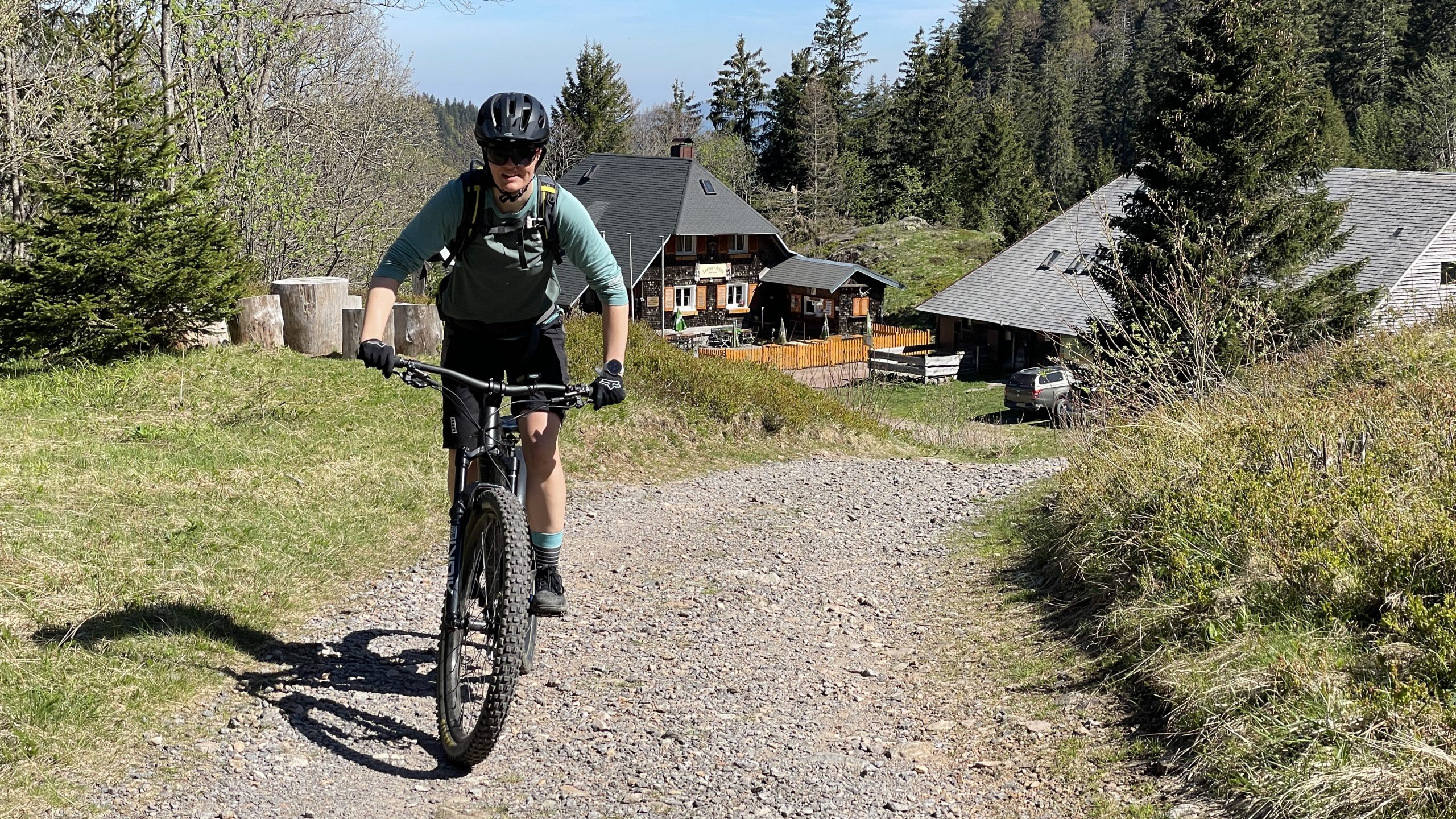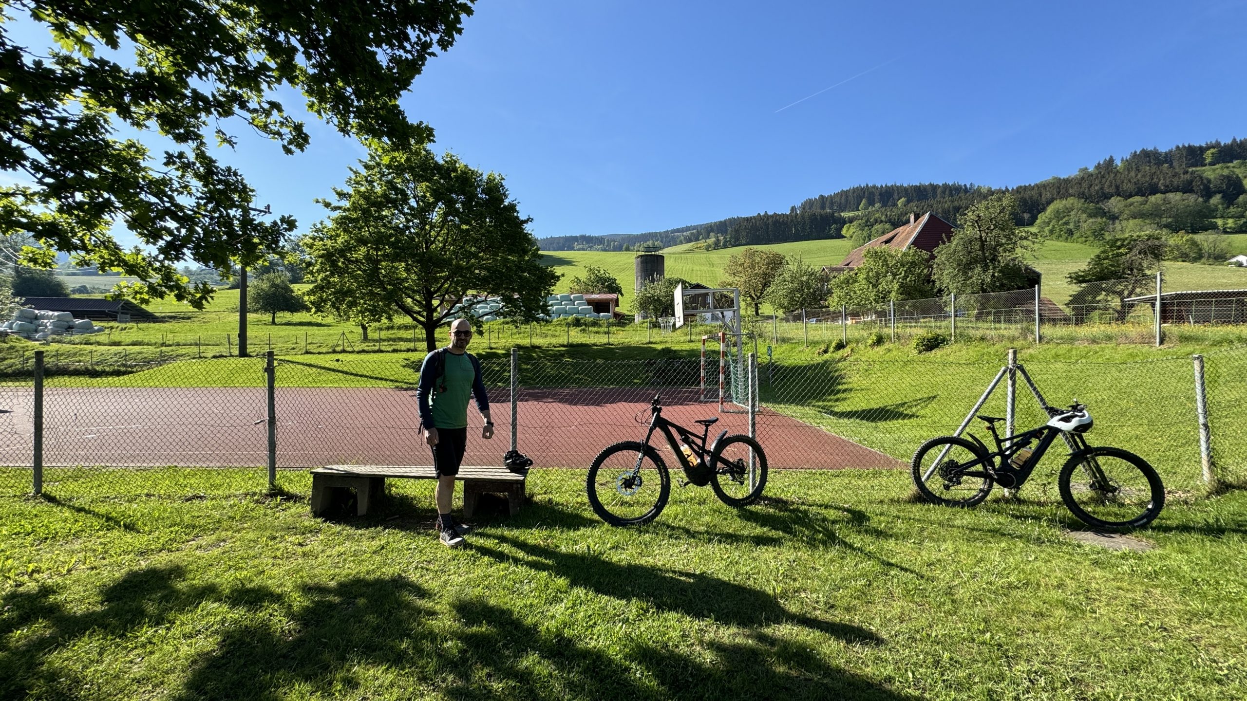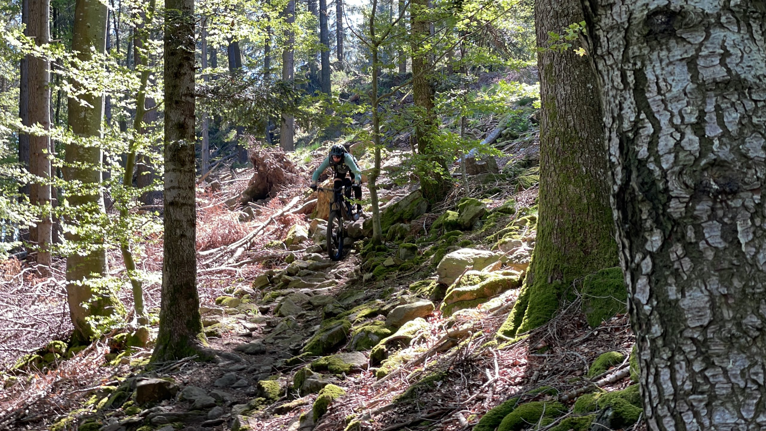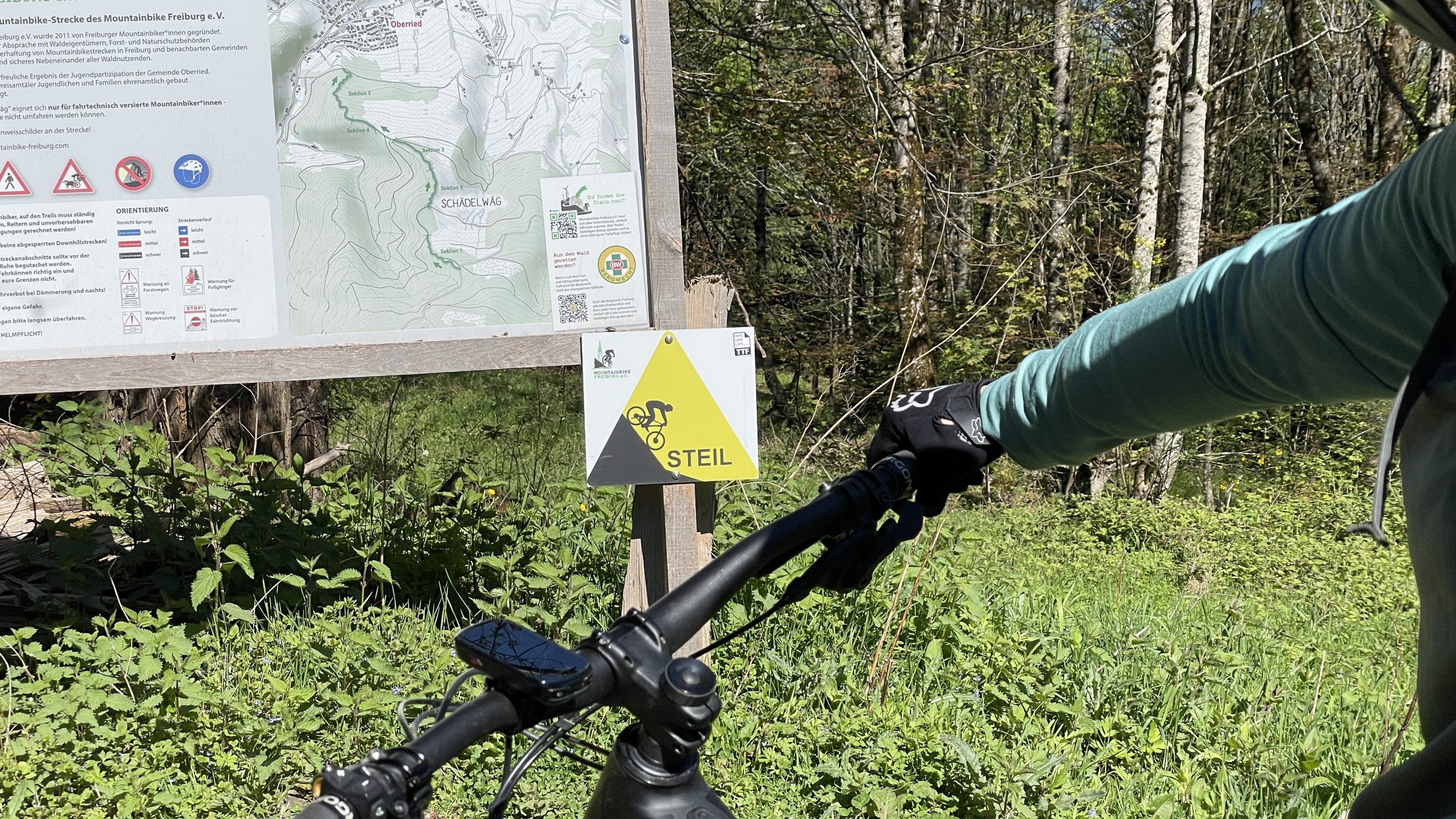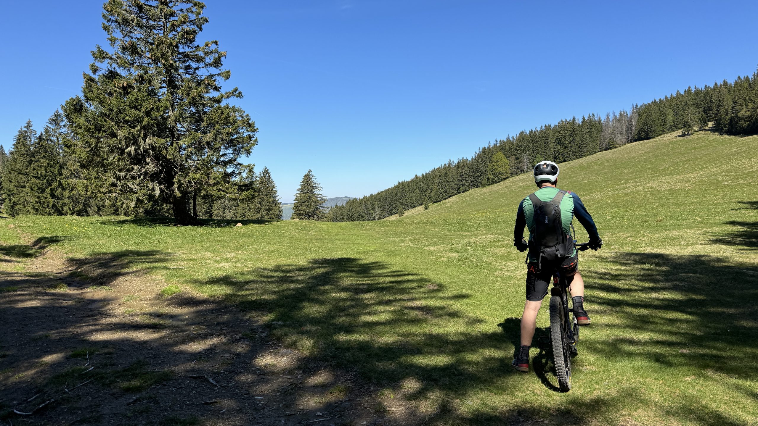 Vom Schauinsland fahren wir nach Oberried. Dort gibt es einen super Stellplatz. Da ist ordentlich was los, aber noch genügend Platz für uns. Sogar im Schatten. Wetter ist super sonnig und warm. Wir starten hoch von Oberried ins Zastler Tal zum Rinken. Von bergauf über einen vorblockten Trails zur Zastler Hütte. Puh. Vielleicht doch lieber Forststraße das nächste Mal. Das Gute, wir sind hier sehr früh und auf dem Trail kein einziger Wanderer unterwegs. Dann geht es rüber zum Toten Mann. Traumhaft sausen wir über die noch Kuh-freien Wiesen hinab und durch den Wald (leider Schieben Wegen umgesägten Bäumen) zum Einstieg vom Schädelweg.