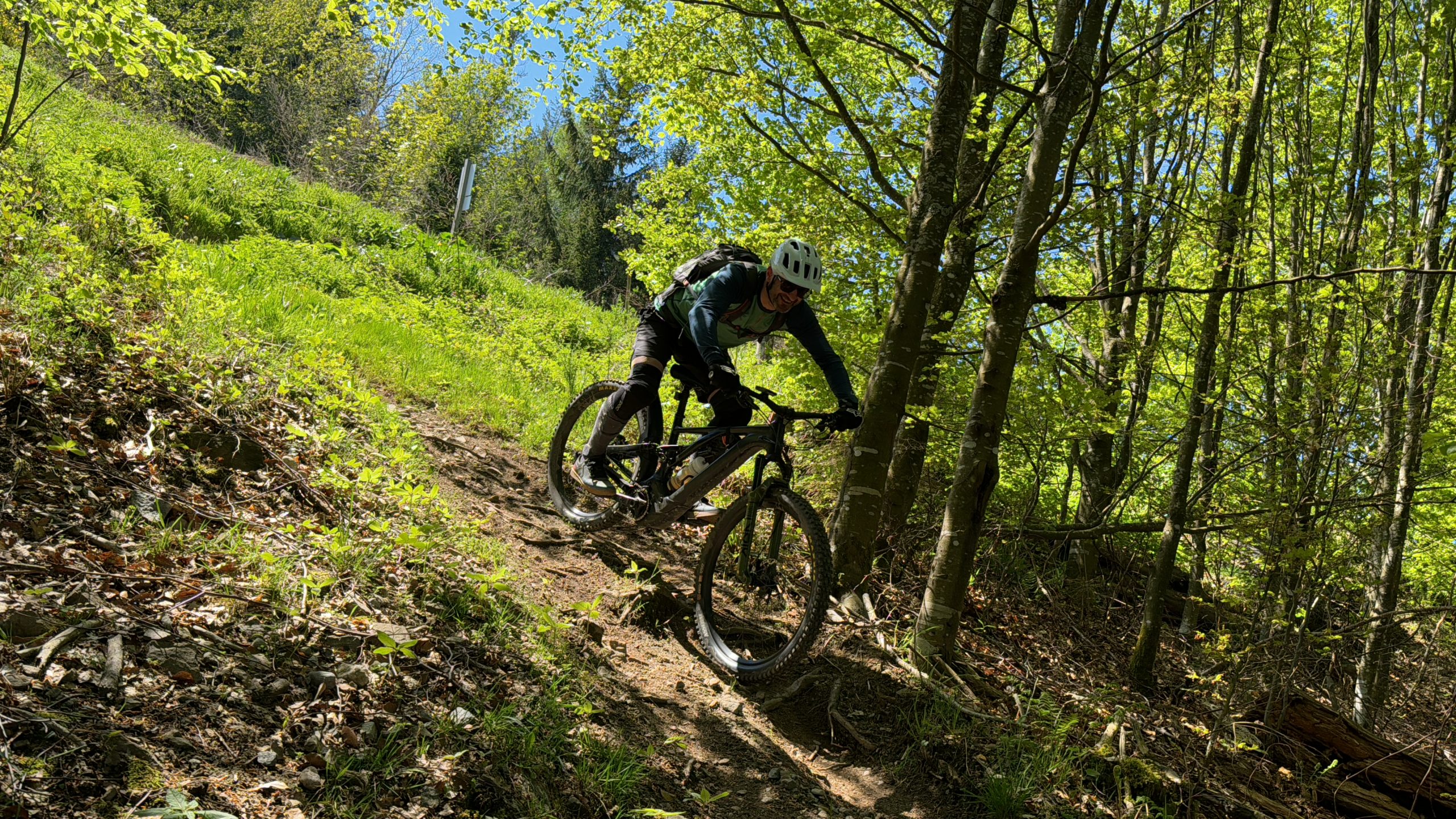 Beim Einstieg heißt es steil. Es ist steil, aber ziemlich gut. Wir fahren nicht alles, das spricht für den Trail! Hammer Ding, was der MTB Verein da an den Hang gebastelt hat.