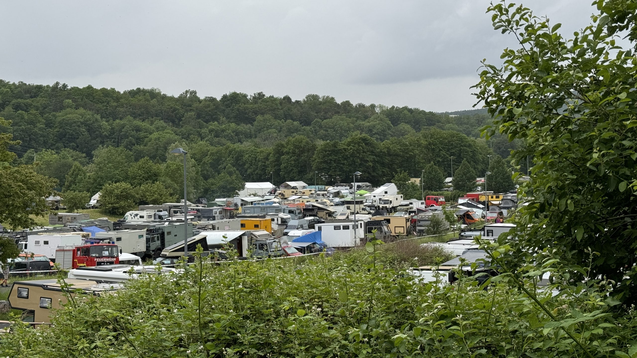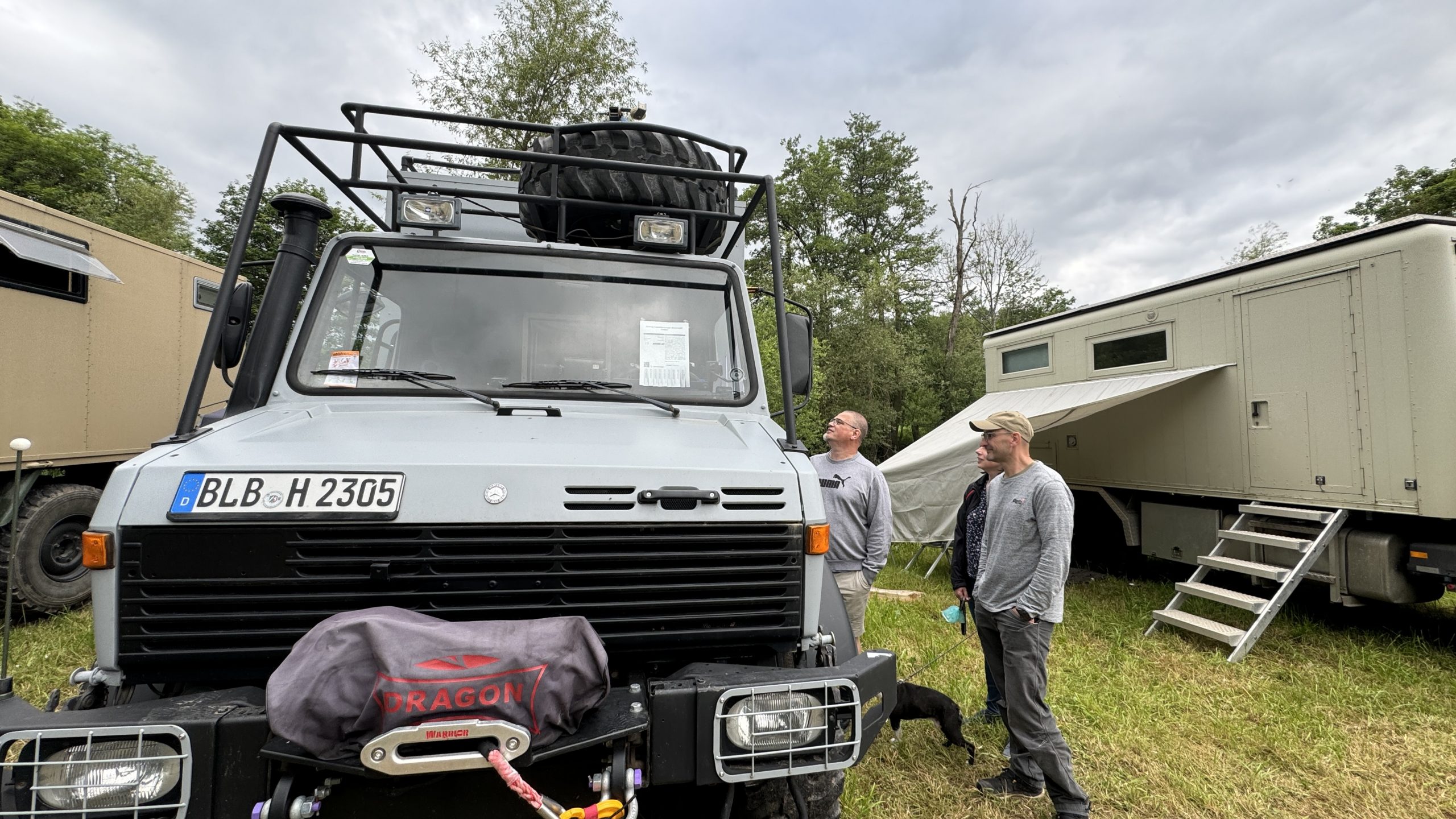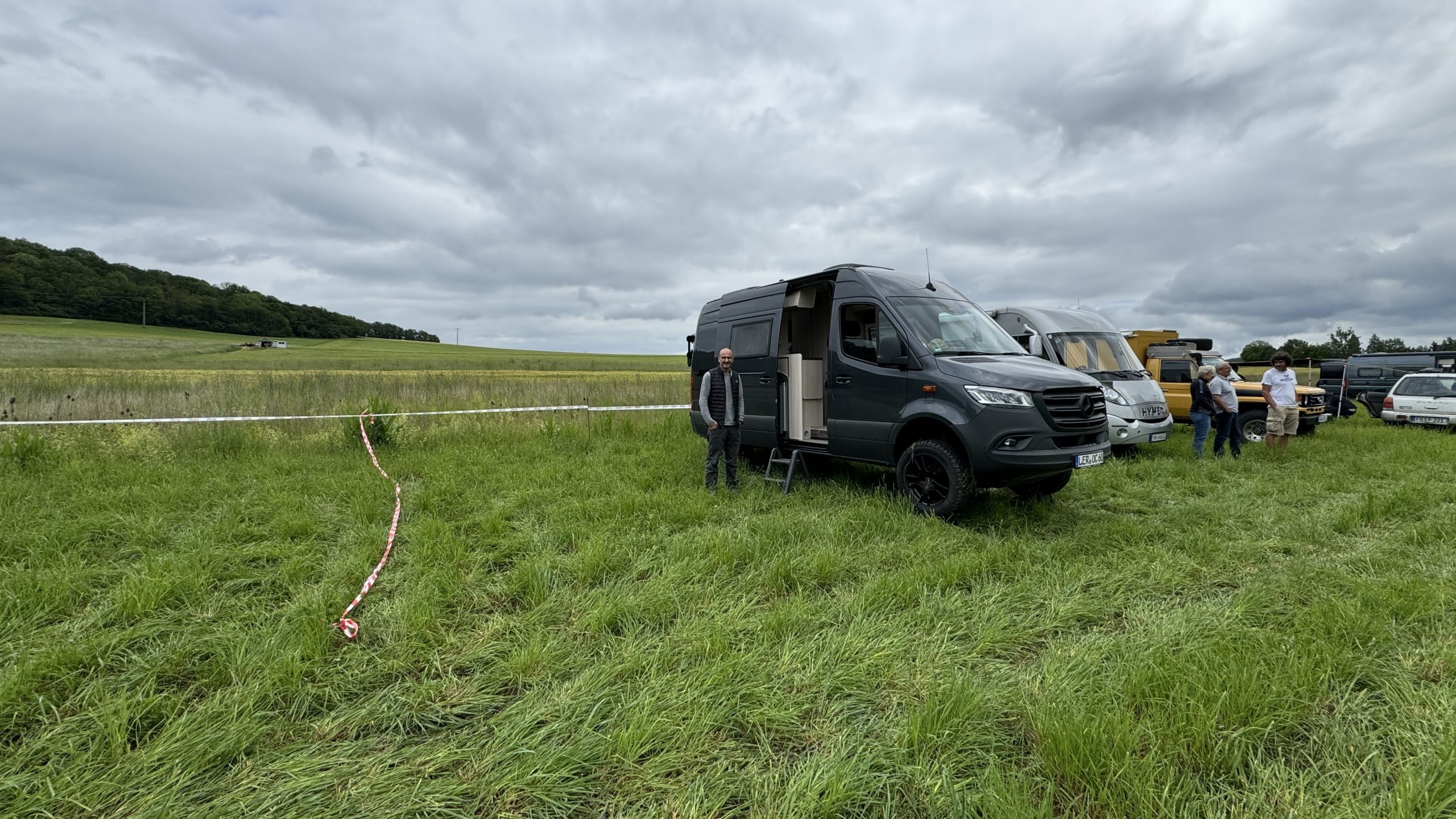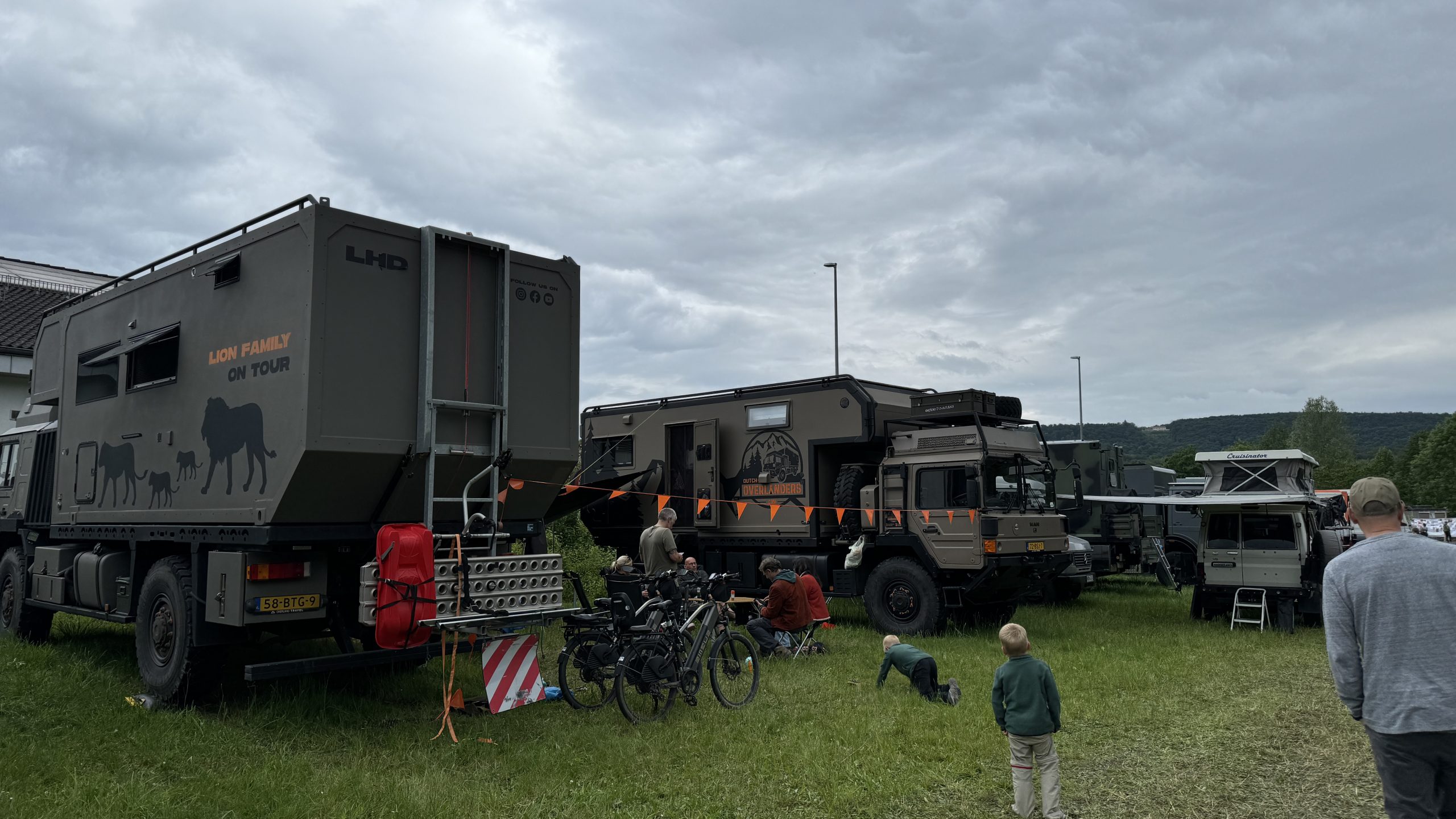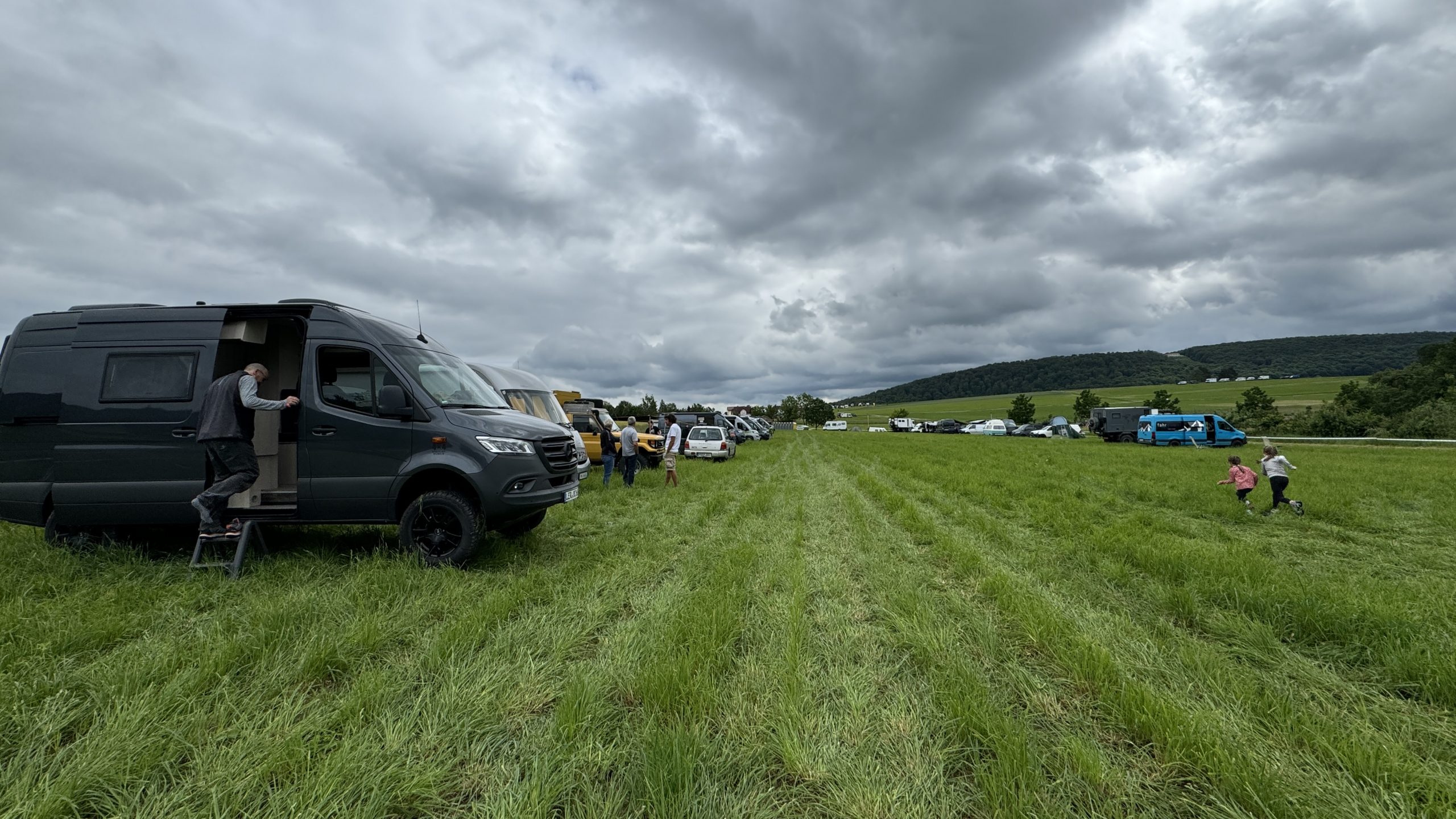 Trocken können wir noch eine Runde durch Camp 1 drehen und die Vielfalt und Größe möglicher Offroader zu bewundern. Zwei kleine Regenschauer unterbrechen das Draußensitzen. Aber überwiegend bleibt es trocken. Die Wiese sieht noch aus wie eine Wiese…