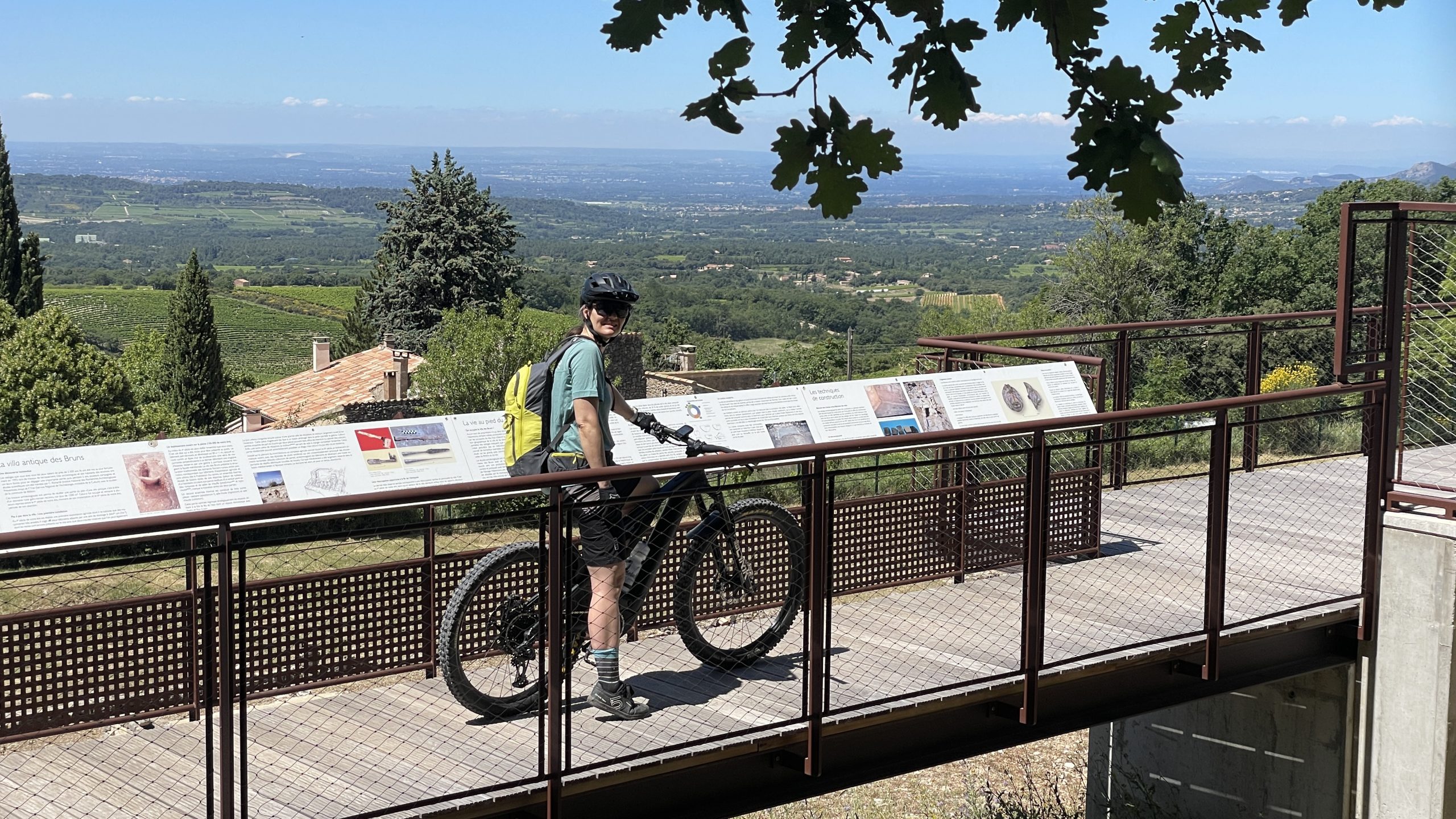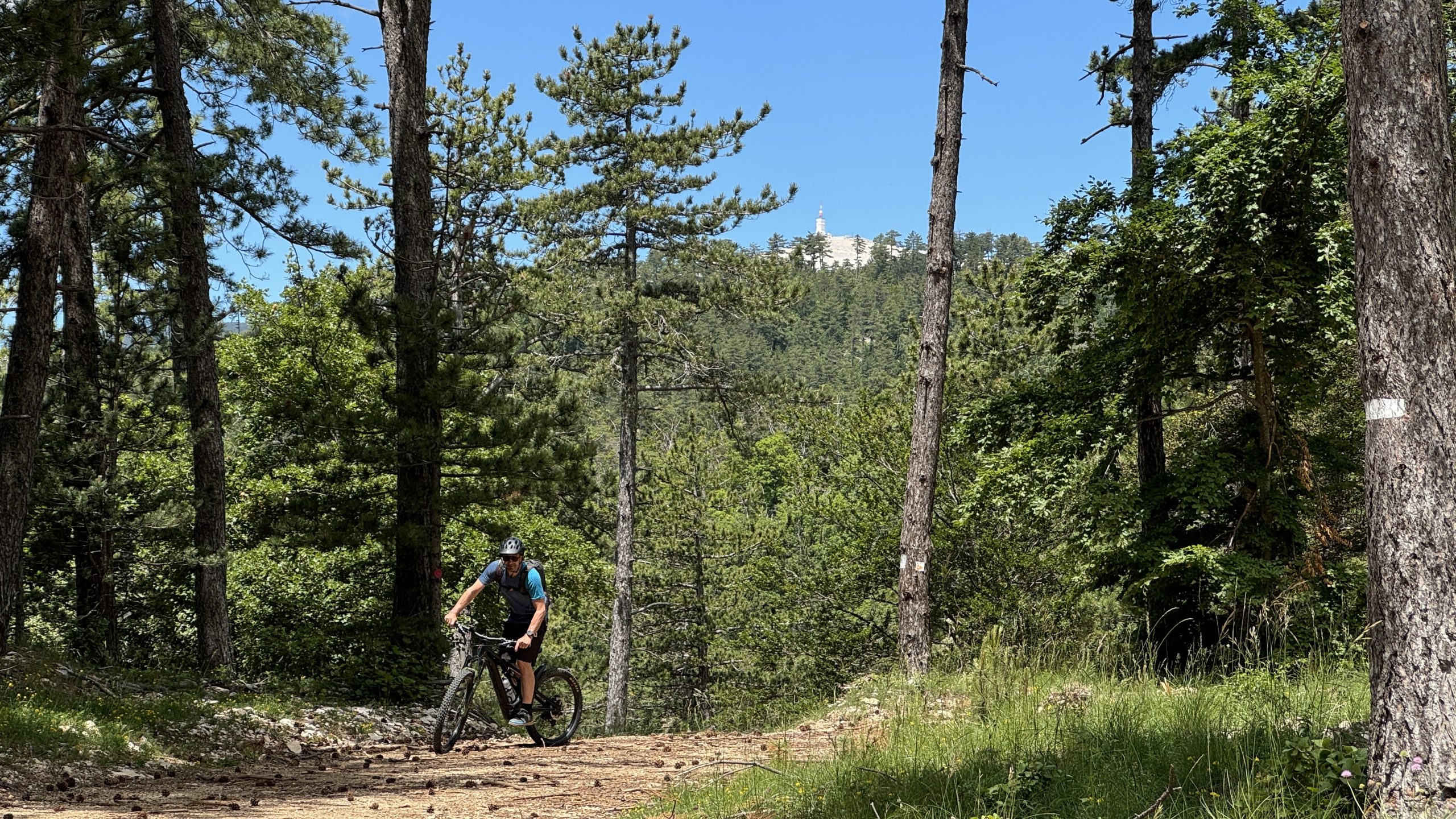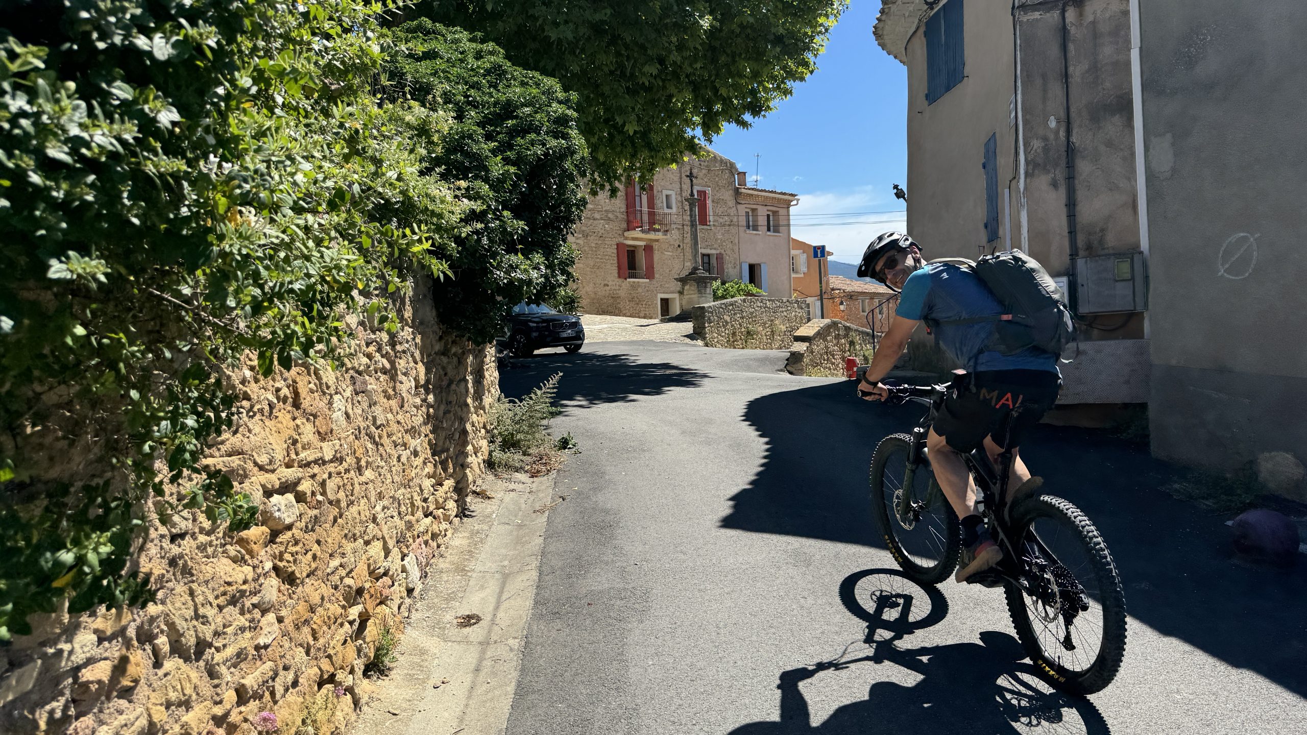 Wir wachen auf – strahlend blauer Himmel. Warm. Die Sonne scheint. Genauso hatten wir uns das vorgestellt. Wir fahren die VTT Tour Nr. 4 der Gemeinde „Le Rat“. Sie soll „difficile“ sein. Aber wir haben ja E. Trotzdem ist der Aufstieg durch das Geröll auf dem Uphill-Trail ordentlich. Wir queren immer vor dem Mont Ventoux. Der Downhill ist schon viel Single-Trail. Dafür aber ganz schön geröllig und zugewachsen. Ein paar Passagen sind spaßig. Ansonsten nicht das Premium-MTB Gebiet. Aber das Wetter macht alles wett!