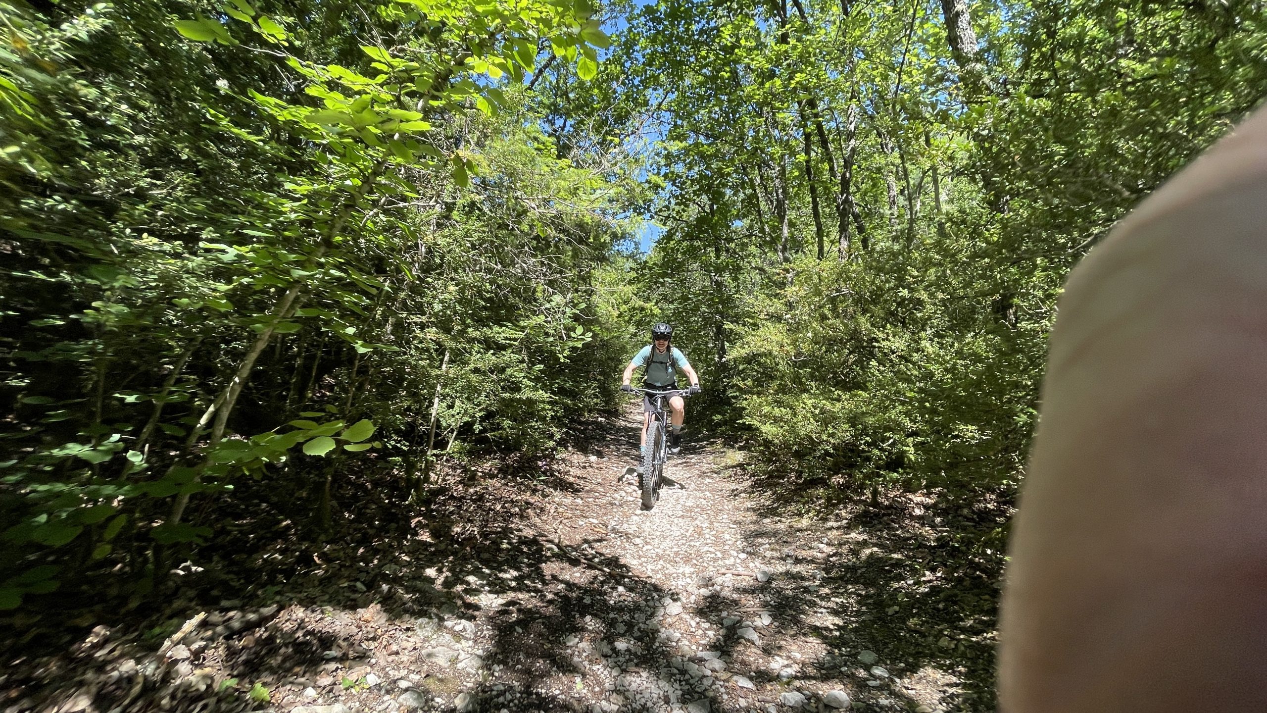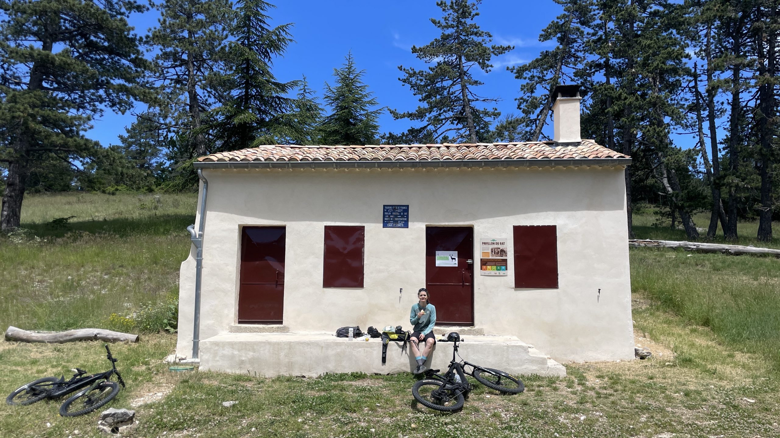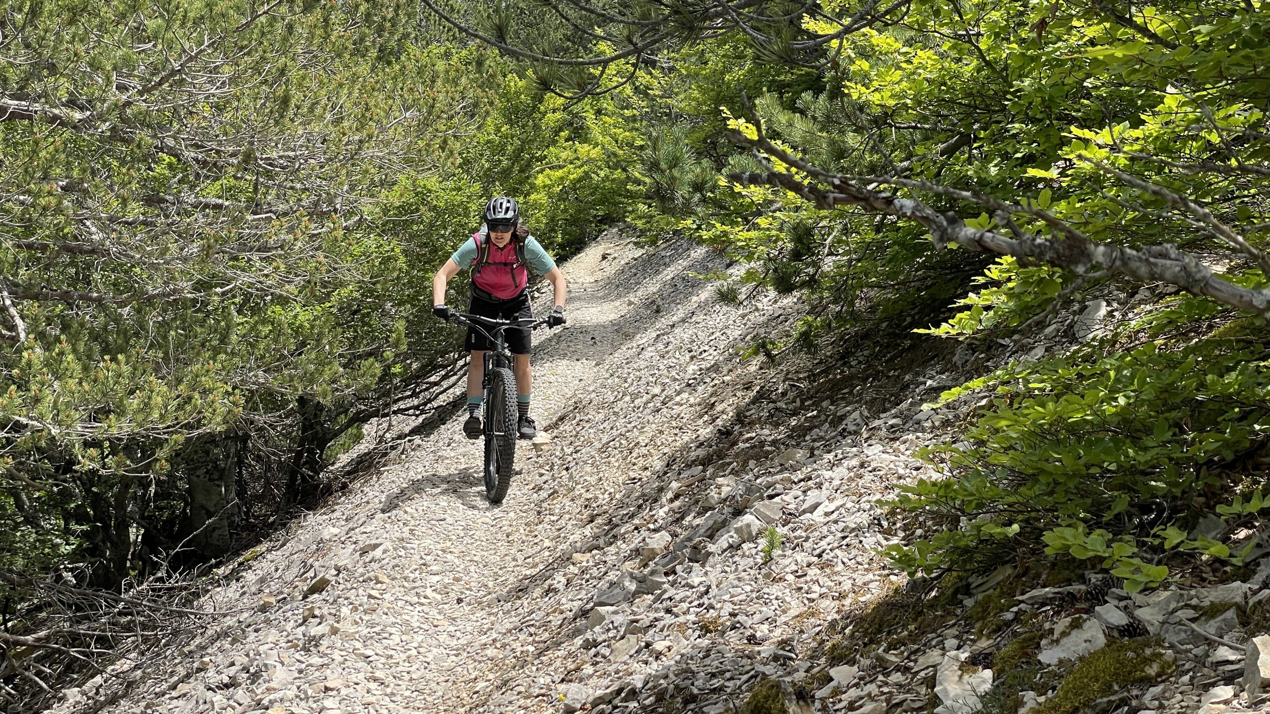 Wir wachen auf – strahlend blauer Himmel. Warm. Die Sonne scheint. Genauso hatten wir uns das vorgestellt. Wir fahren die VTT Tour Nr. 4 der Gemeinde „Le Rat“. Sie soll „difficile“ sein. Aber wir haben ja E. Trotzdem ist der Aufstieg durch das Geröll auf dem Uphill-Trail ordentlich. Wir queren immer vor dem Mont Ventoux. Der Downhill ist schon viel Single-Trail. Dafür aber ganz schön geröllig und zugewachsen. Ein paar Passagen sind spaßig. Ansonsten nicht das Premium-MTB Gebiet. Aber das Wetter macht alles wett!