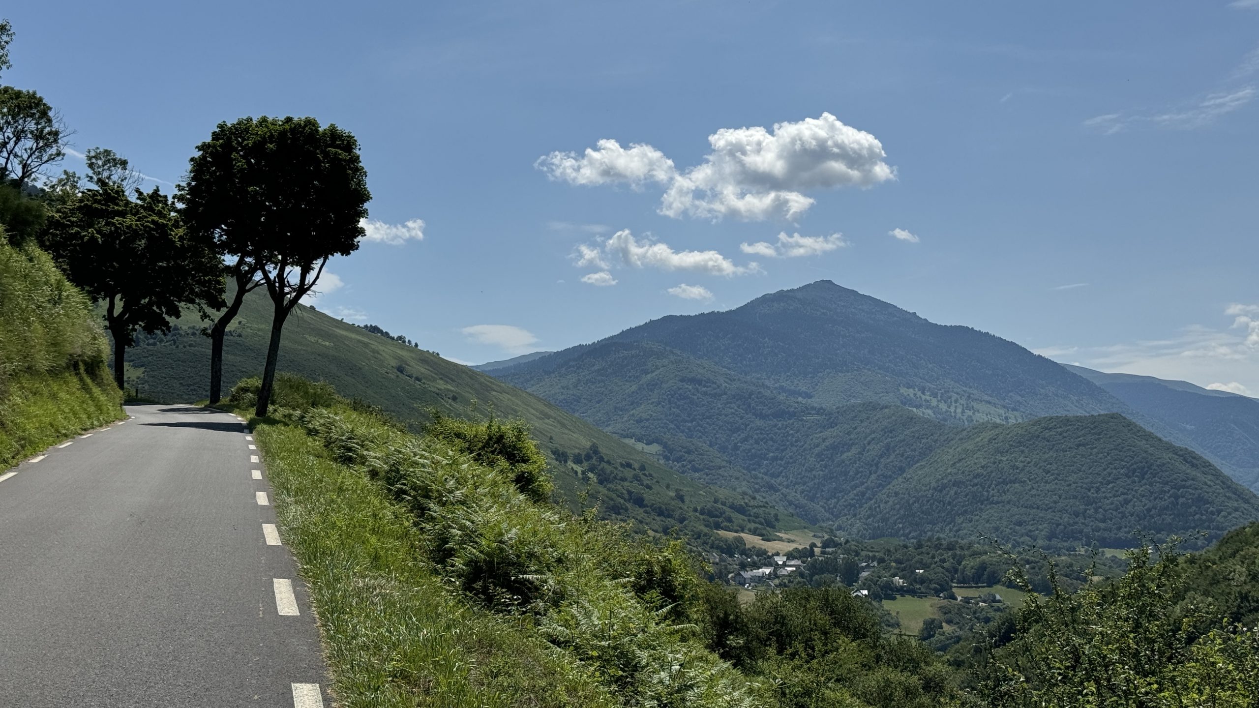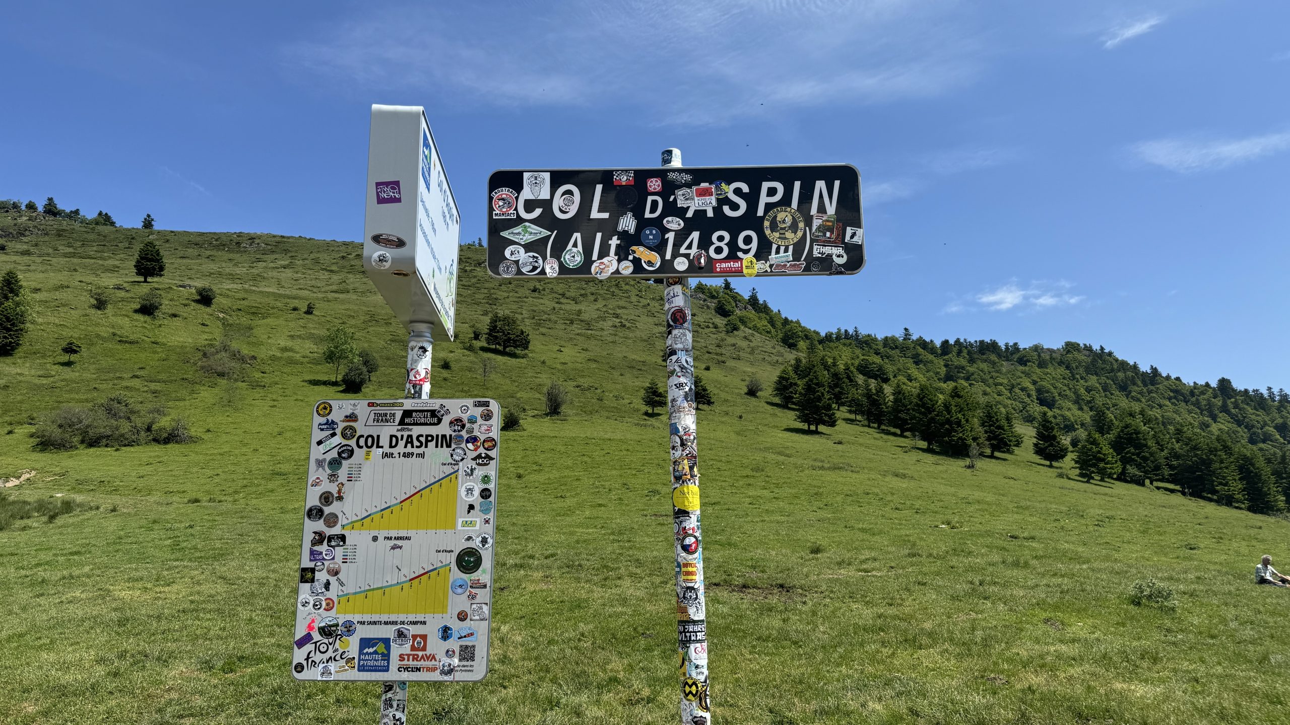 de France Schild zum Col d‘Aspin. In die Richtung soll es bei Asté auch Trails geben. Der Pass hoch ist traumhaft! So hatten wir es uns vorgestellt. Alles ist grün und es gibt einen Ausblick.
