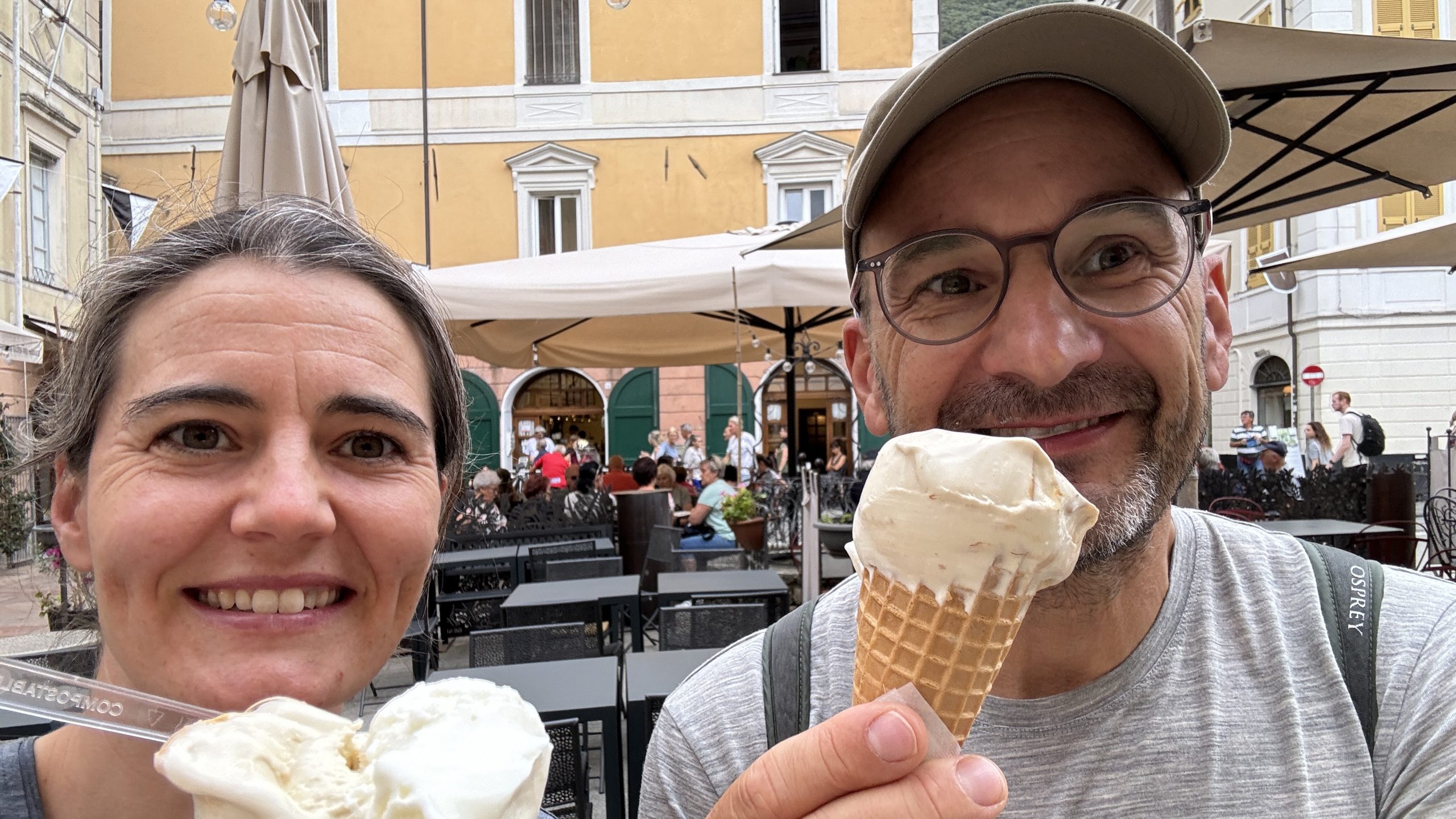 Wir nutzen den Nachmittag für einen Spaziergang nach Finalborgo. Dort genießen wir das super Eis! Unser absoluter Favorit- ever. Heute ist es noch, noch viel besser. Danach findet Torsten einen neuen Helm. Perfekt.