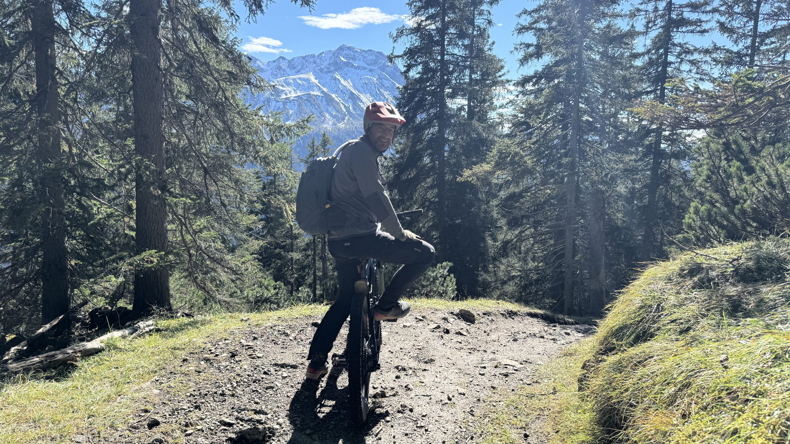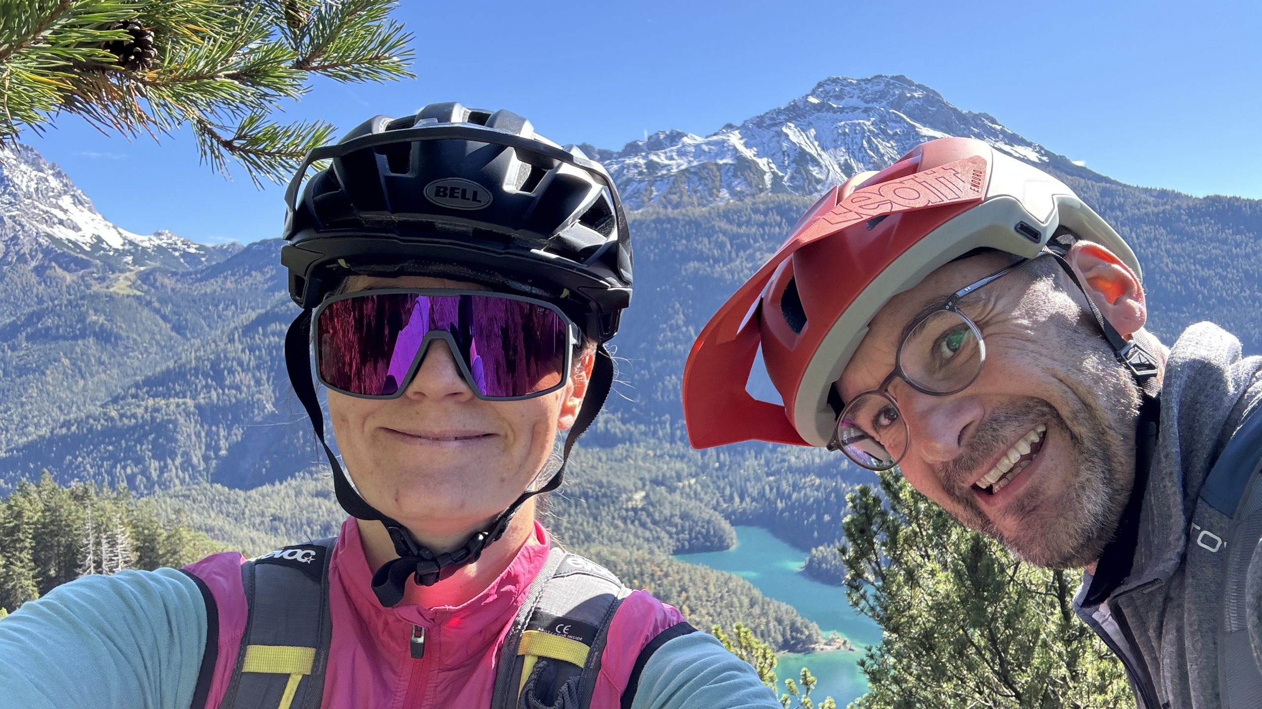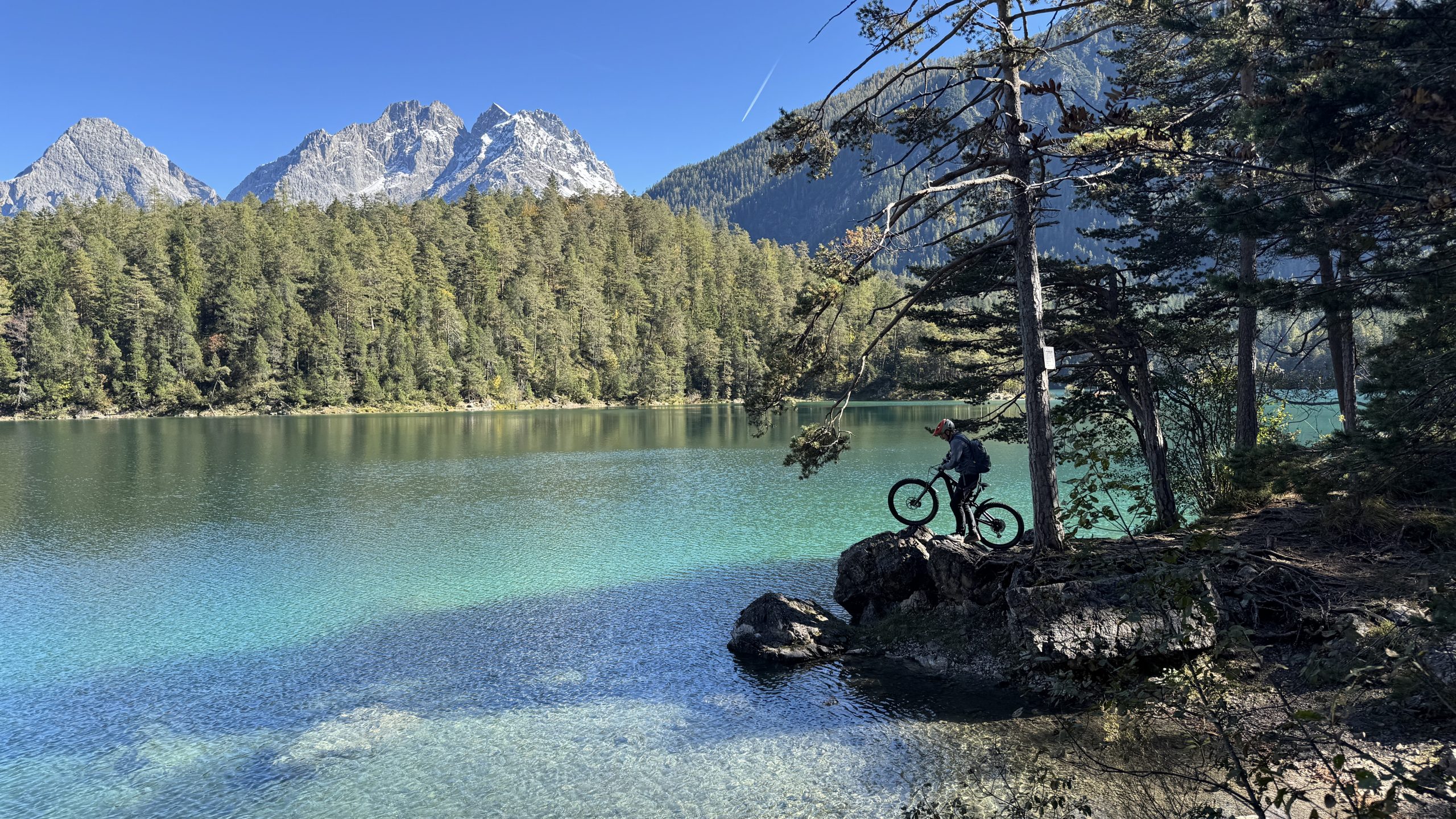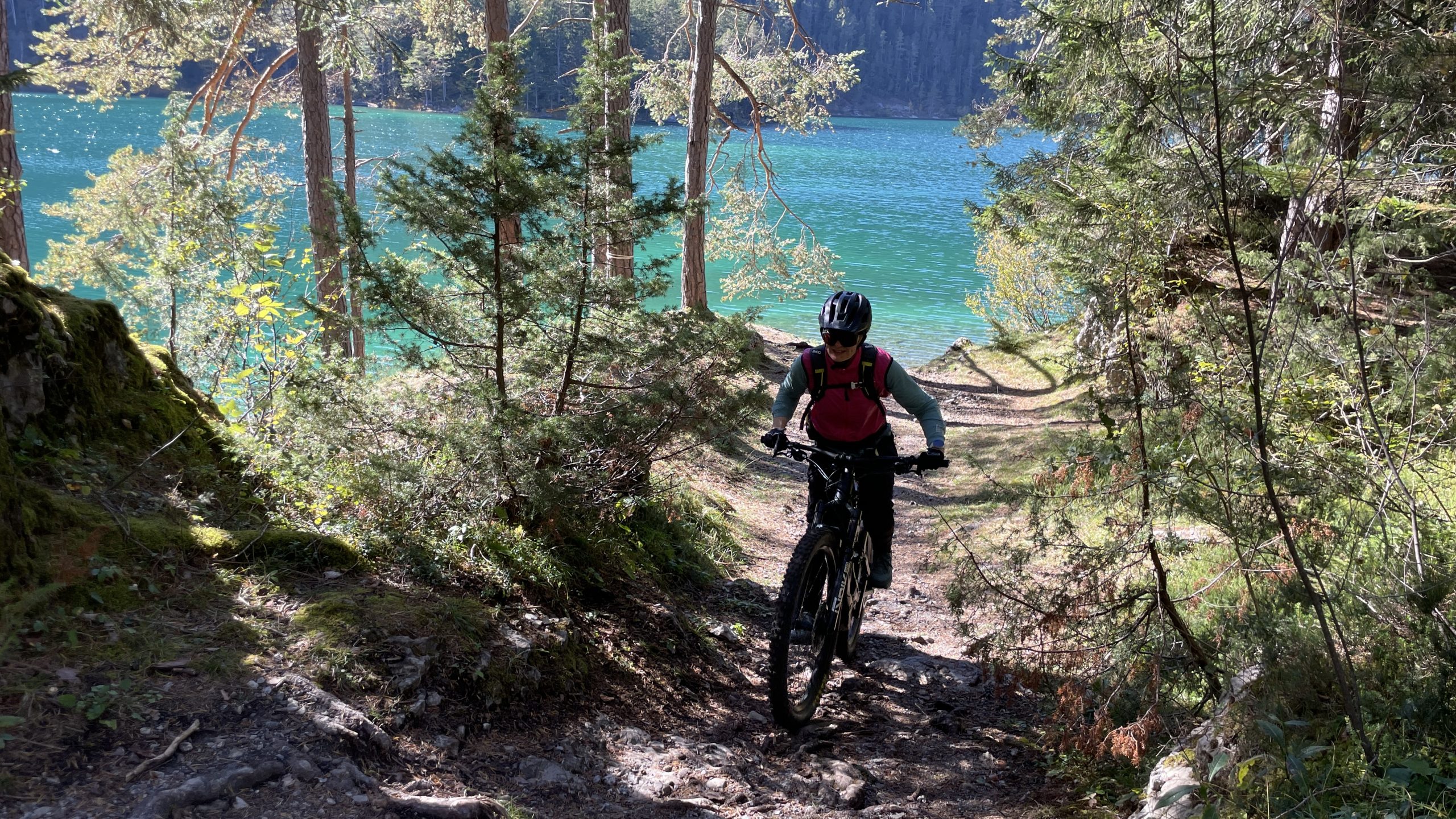 Mittags machen wir uns auf zum Blindseetrail. Mit de E-Bike eine ganz andere Nummer. Der Uphill geht deutlich schneller. Dann wird es langsam richtig sonnig und schön warm. Ein Traum Ausblick zur Zugspitze, die schon den ersten Schnee trägt, die Felsen aber noch durchkommen. Die Herbstbäume strahlen in gelb, rot und grün. Wir fühlen uns wie in Kanada. Ein Traum-Tag. Nichts los unterwegs. Wie im Film. Der Trail ist irgendwie einfacher geworden- vor zwei Jahren haben wir uns deutlich schwerer getan. Nun können wir das geniale Panorama und den Blick auf den durch die Sonne glitzernden Blindsee genießen.