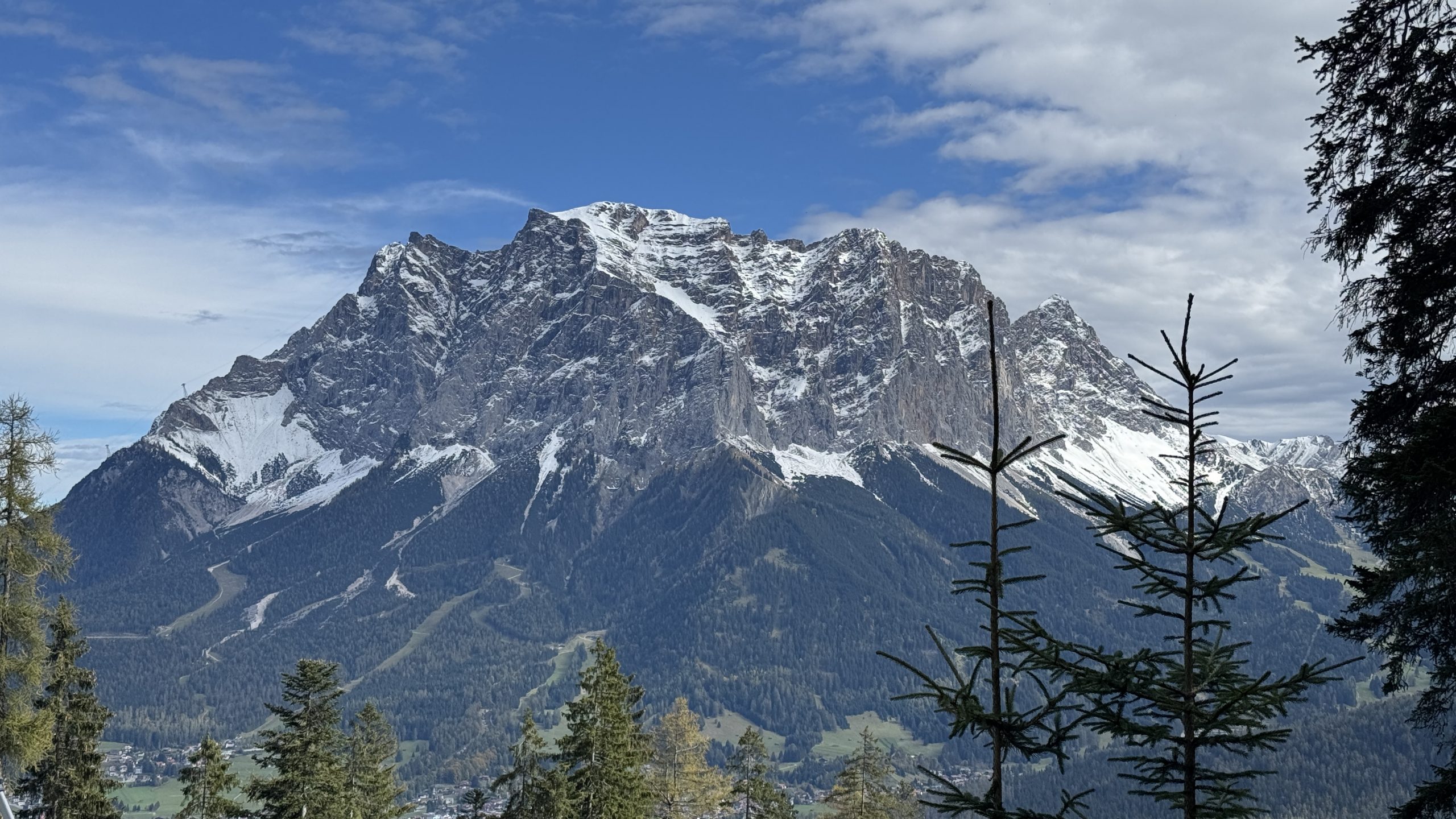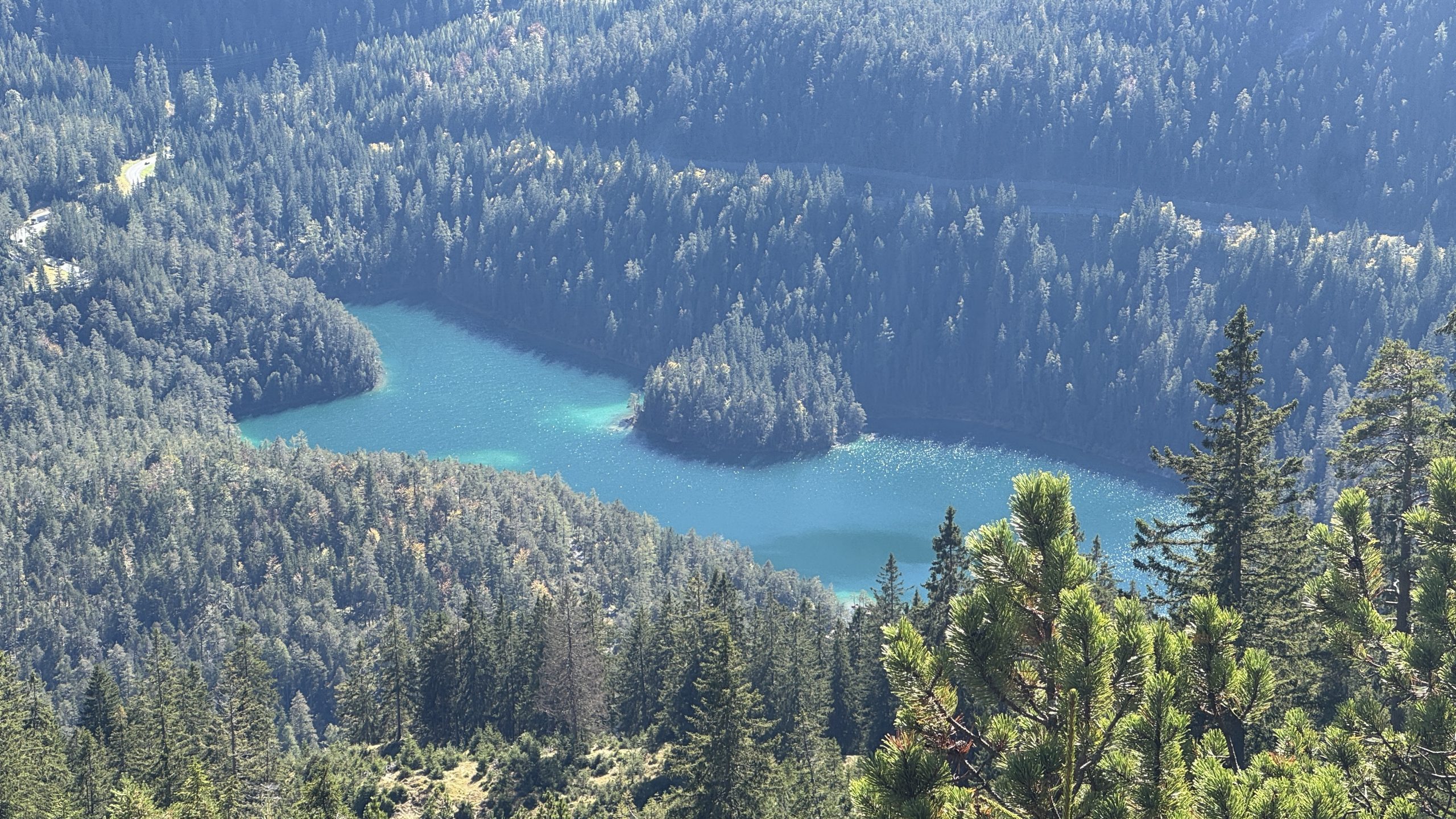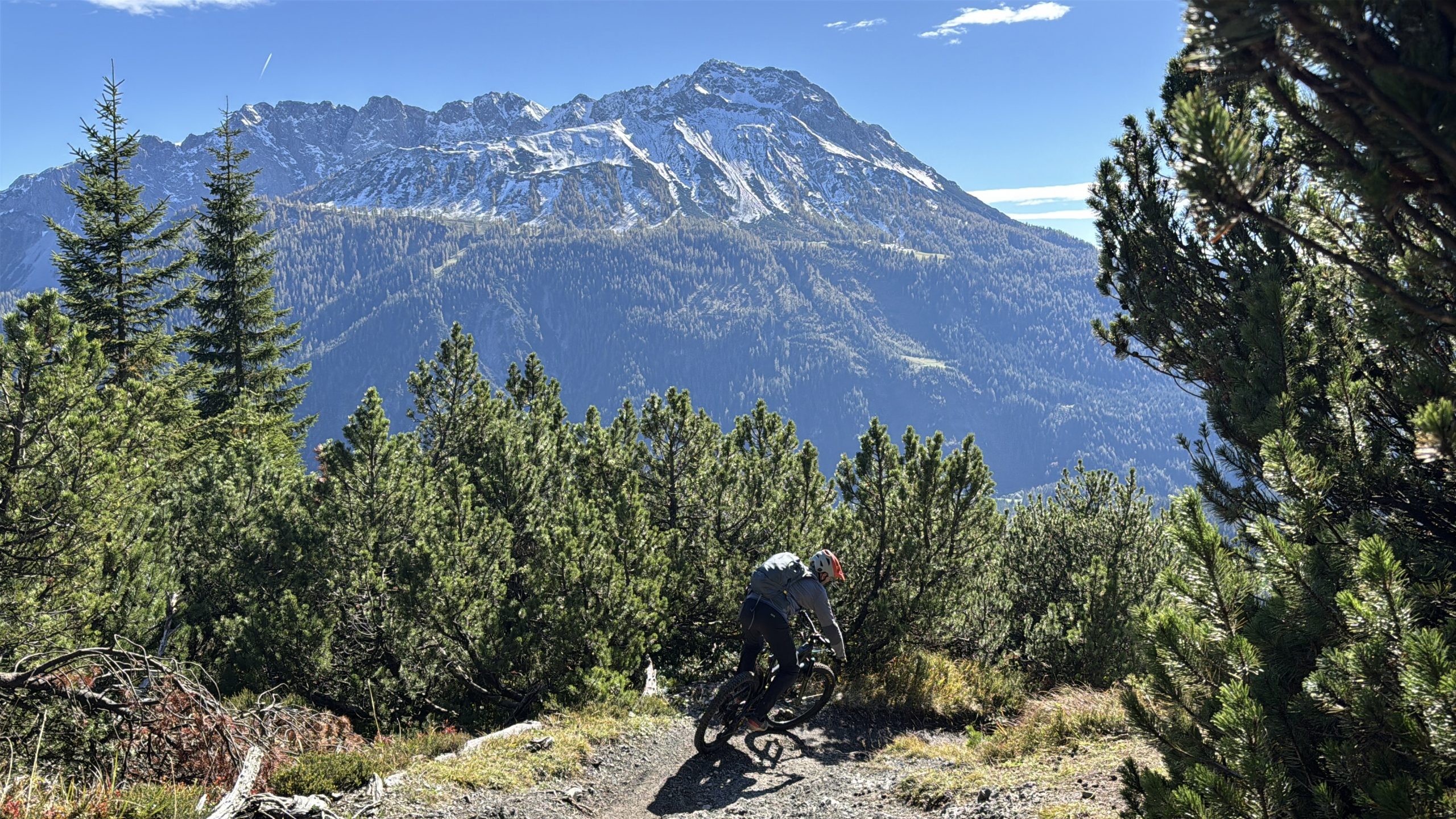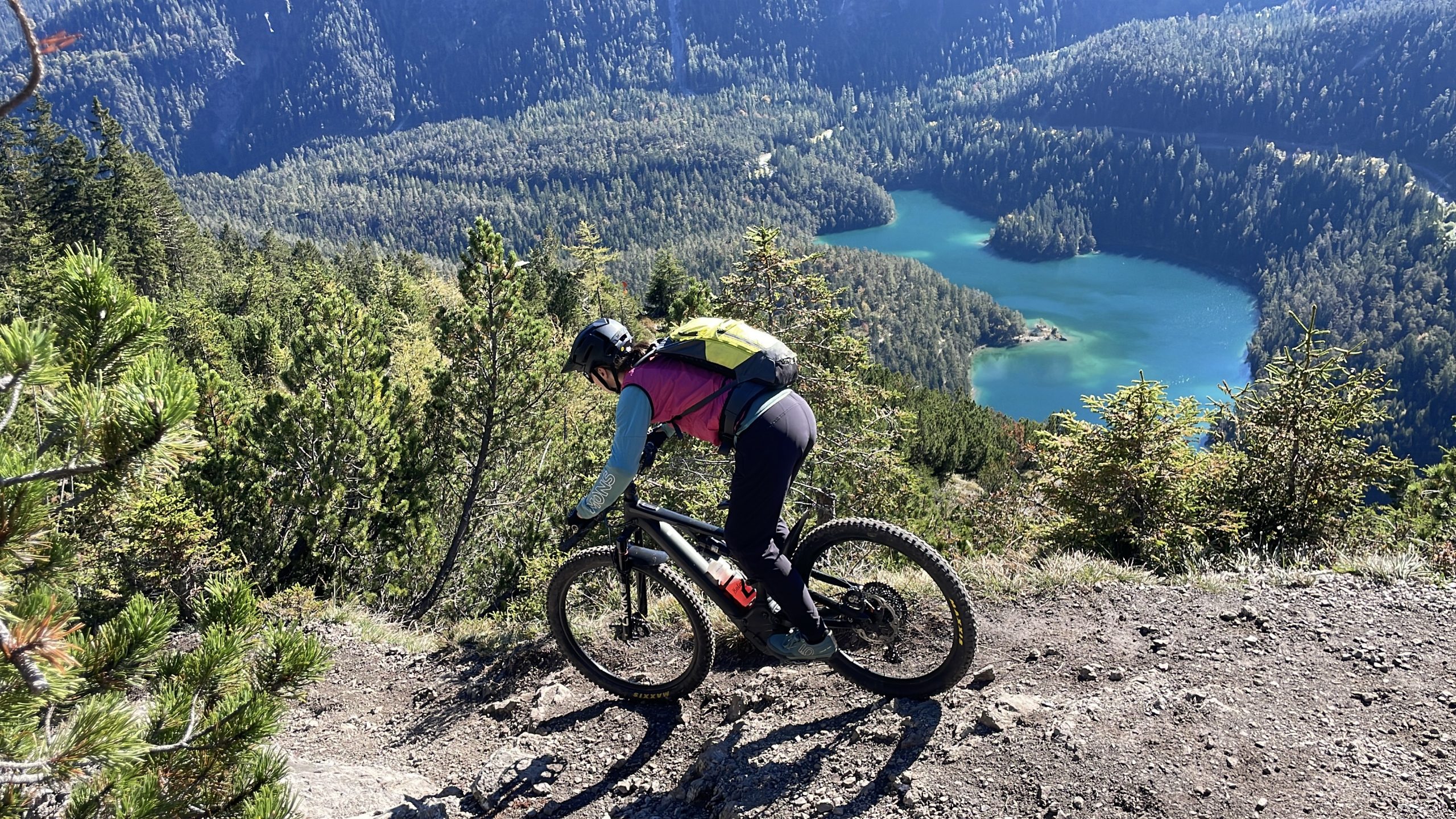 Mittags machen wir uns auf zum Blindseetrail. Mit de E-Bike eine ganz andere Nummer. Der Uphill geht deutlich schneller. Dann wird es langsam richtig sonnig und schön warm. Ein Traum Ausblick zur Zugspitze, die schon den ersten Schnee trägt, die Felsen aber noch durchkommen. Die Herbstbäume strahlen in gelb, rot und grün. Wir fühlen uns wie in Kanada. Ein Traum-Tag. Nichts los unterwegs. Wie im Film. Der Trail ist irgendwie einfacher geworden- vor zwei Jahren haben wir uns deutlich schwerer getan. Nun können wir das geniale Panorama und den Blick auf den durch die Sonne glitzernden Blindsee genießen.