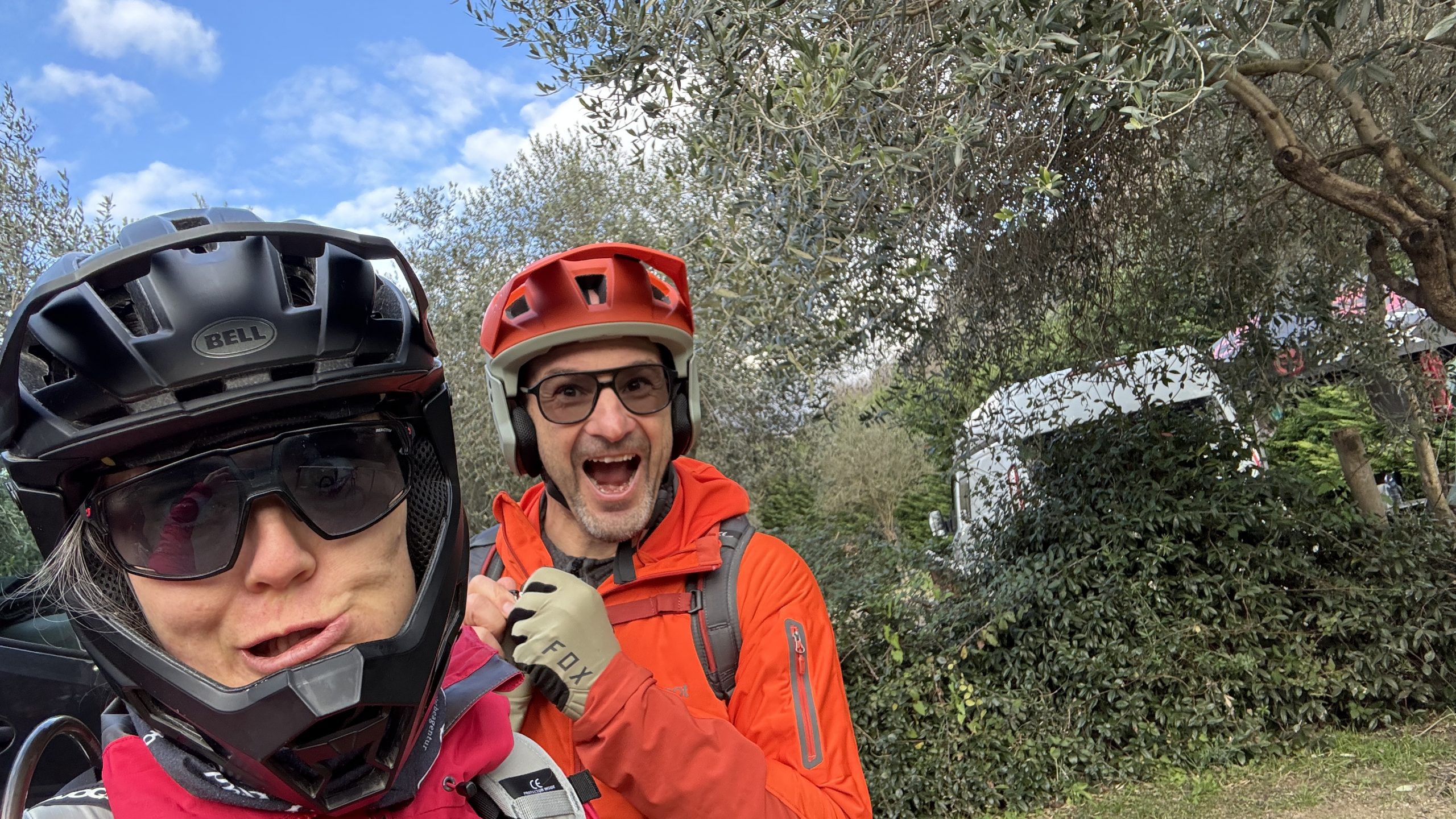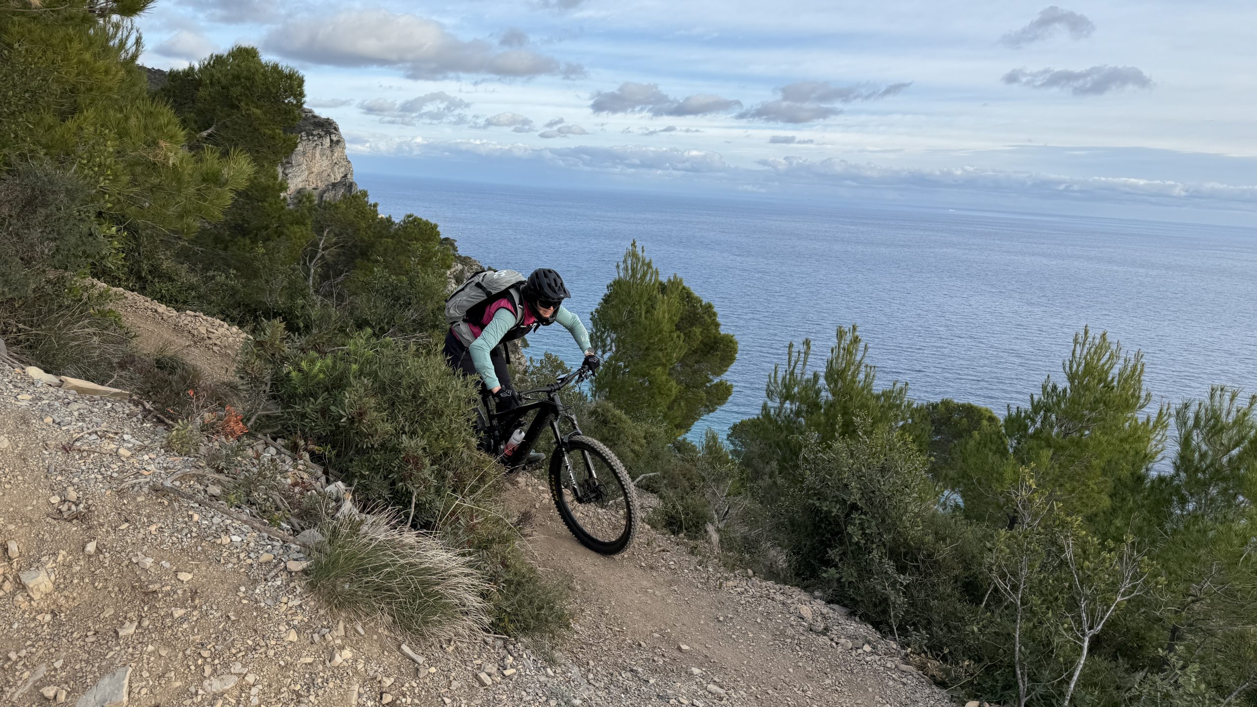Toller sind die Querungen bis zum DH Men. Den DH Men haben wir uns bisher nicht getraut. Das Panorama ist genial. Die Sonne glitzert im Meer. Der Trail ist steil und schotterig. Es überrascht uns allerdings, das wir alles fahren können. Mit Pausen. No way in einem Stück. Dauerfeuer. Wir sind stolz auf uns. Das hat richtig Spaß gemacht! Wir queren noch einmal hoch zum Brighella. Torstens neuer Favorit.