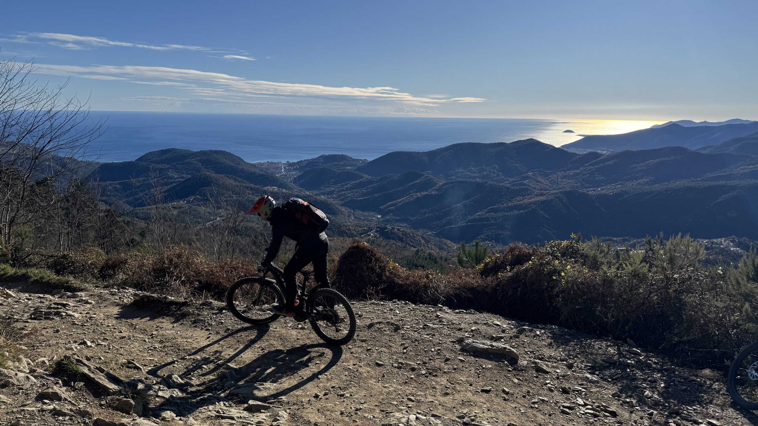 Der Himmel ist wolkenfrei! Sonne pur. Wir starten den Tag mit einem Cappuccino in Calize. Zwei Cappuccino für 3 Euro. Das es sowas noch gibt. Dann geht es locker rauf zum DIN in Melogno. Das Meer funkelt in der Sonne. Herrlich. Oben ist es schon frisch- aber kein Vergleich zu den Jahren davor. Der Rollercoaster ist trocken und geputzt. Macht immer wieder richtig Freude. Wir fahren ihn mal Zu Ende. Dann noch einmal halb hoch zum Cacciatore. Wir dachten, wir wären ihn noch nicht gefahren. Der Zugang von der Kirche ist abgesperrt und der Anfang sehr laubig. Dann wird es richtig toll. Wir erinnern uns – damals war es nass und wir sind ziemlich viel gefahren. Heute ist es trocken und wir können alles fahren. Jippi.