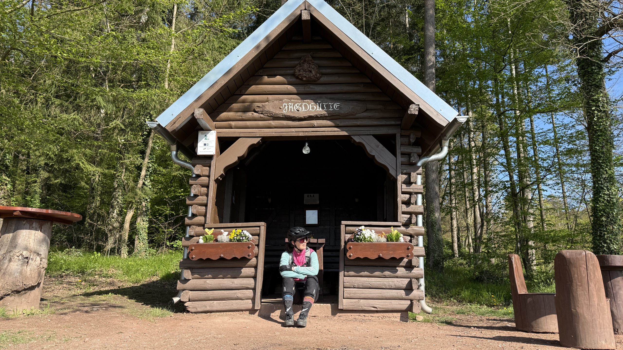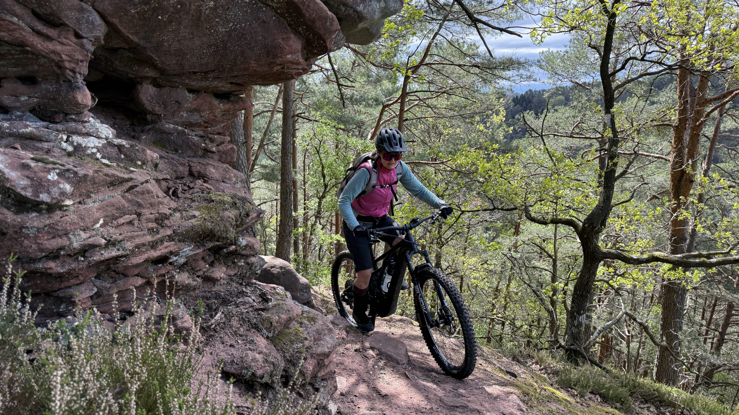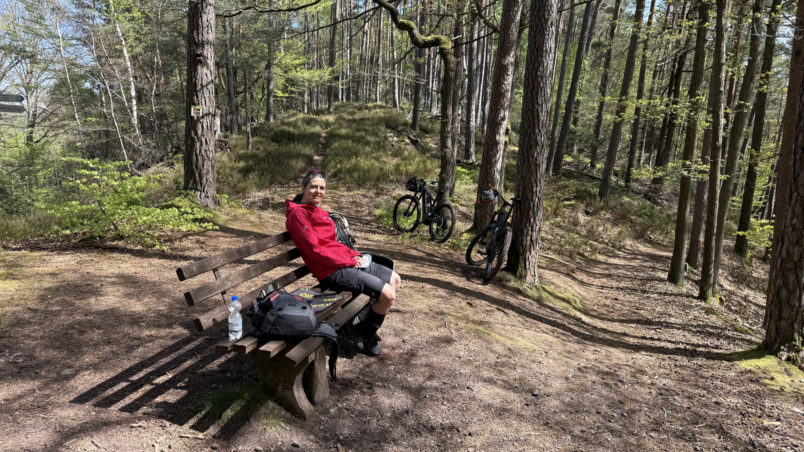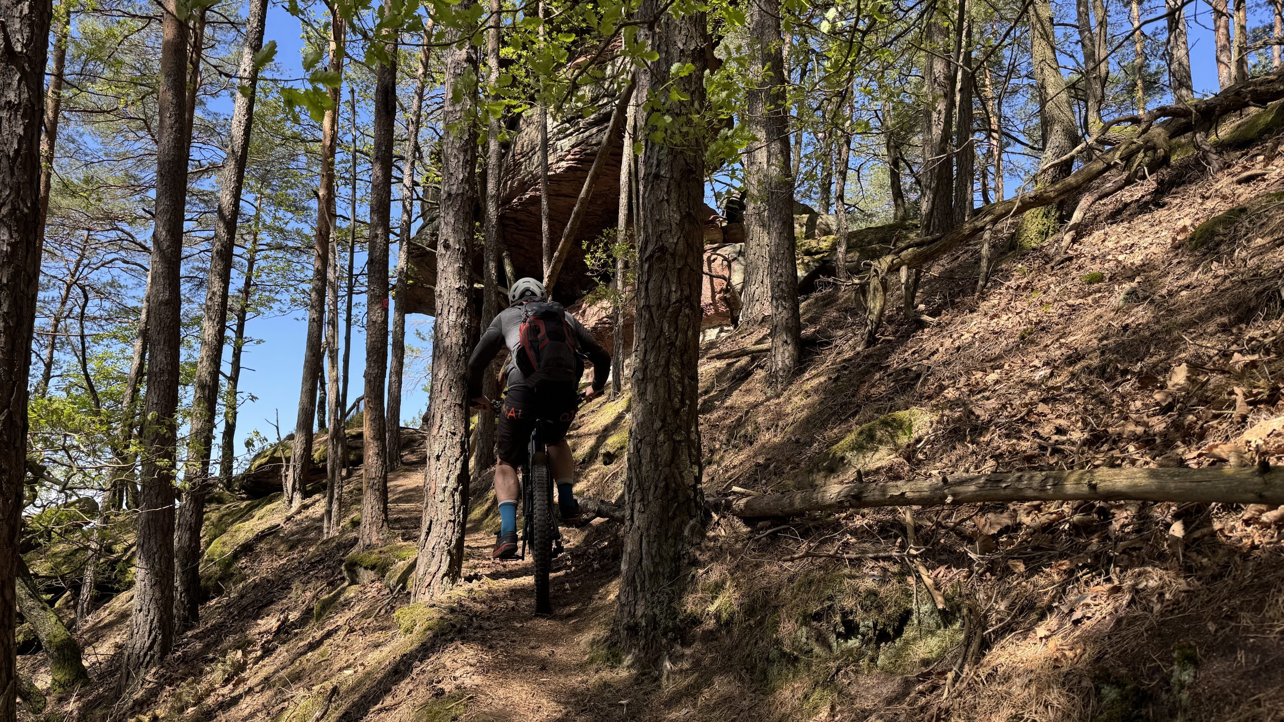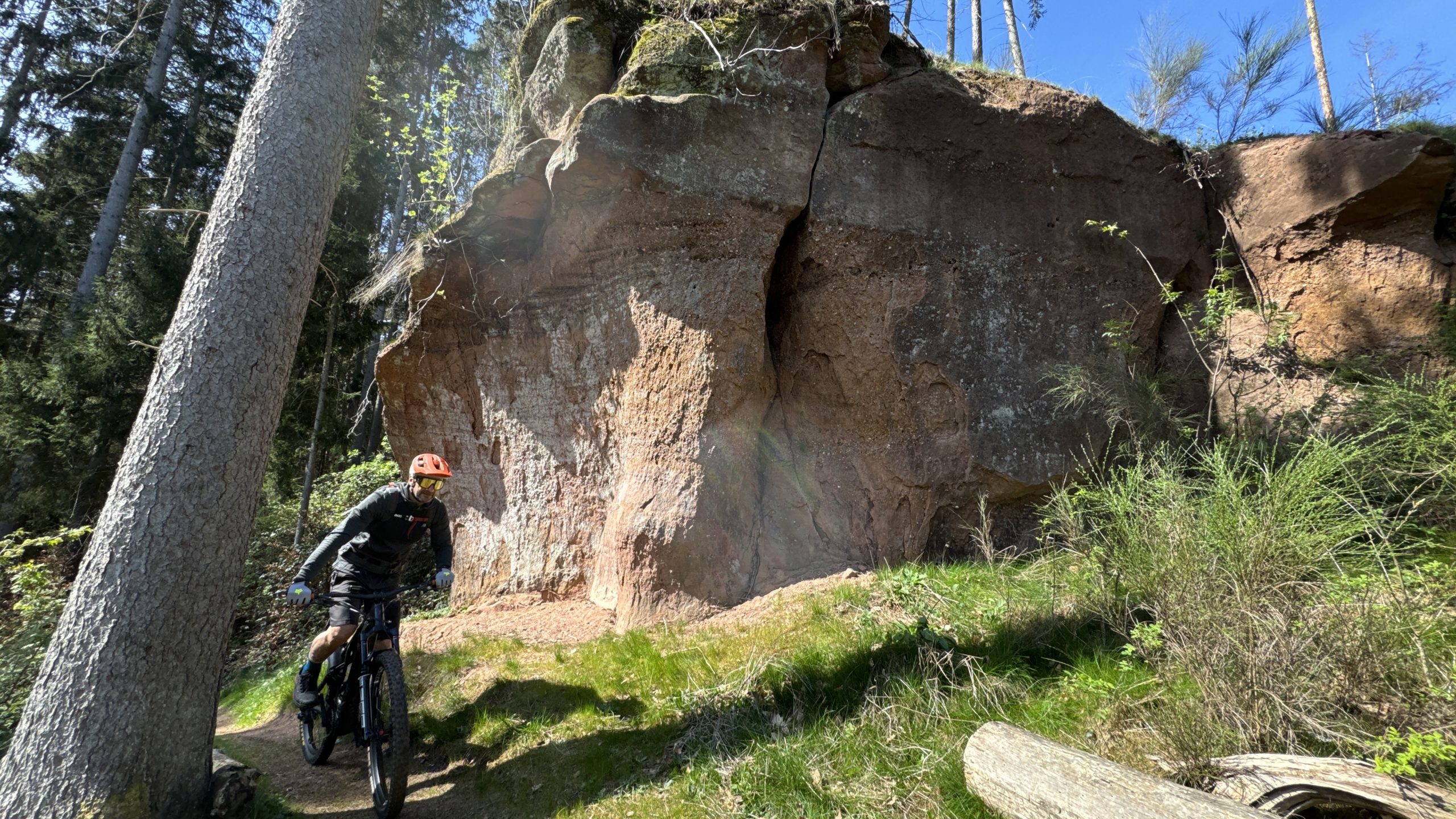 In Dahn ist richtig viel los. Da sind wir froh wieder in den Wald zu kommen. Leider relativ viel Forststraße. Schöner Wald, aber fast nur Wald. Ein bisschen wie in der Toskana. Auch zwei Wildschweine 🐗🐗, die vor uns zweimal queren. Okay, wir waren auch auf der Wildsau-Tour. Highlight ist der Trail beim Bergwerk.