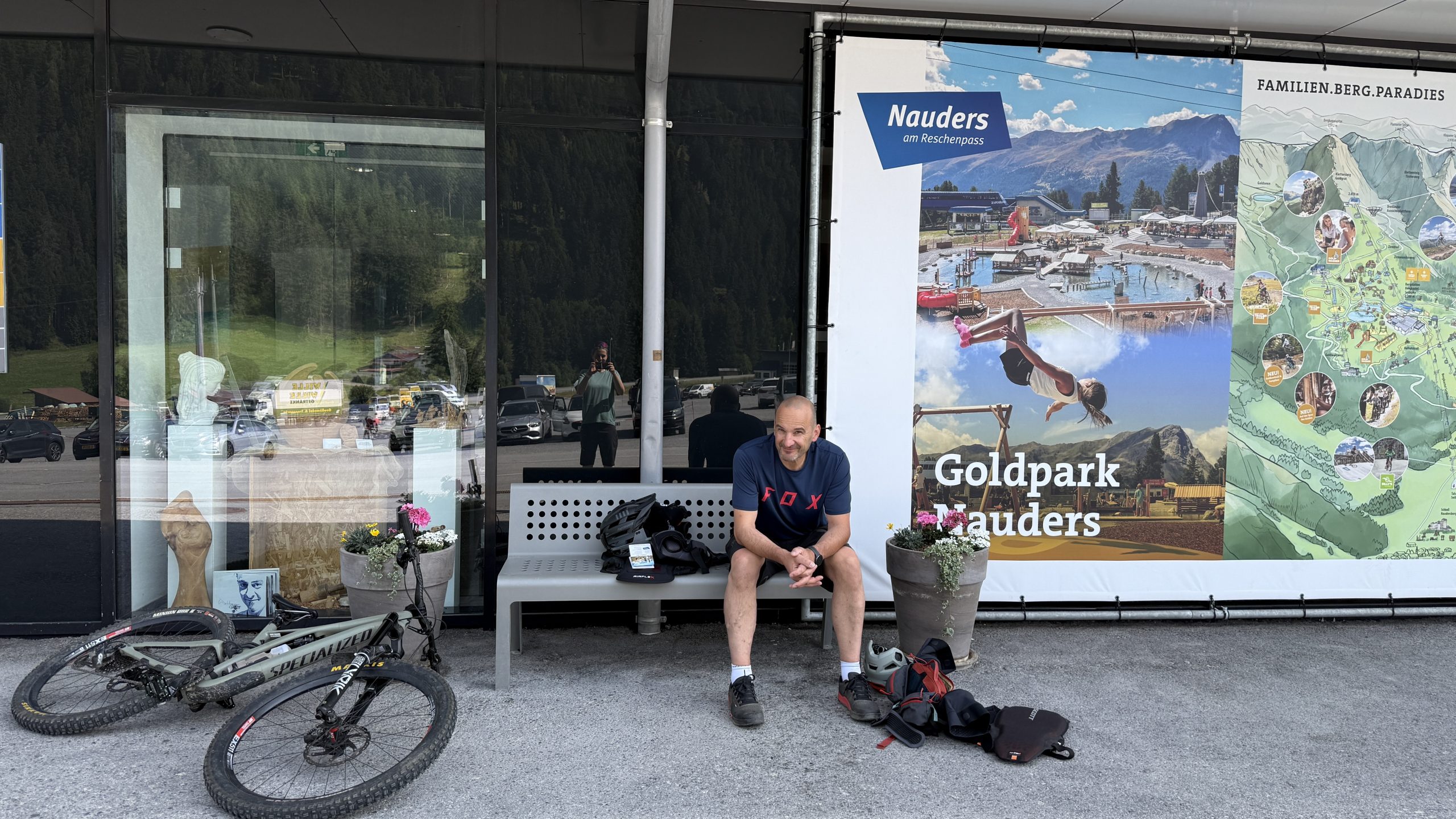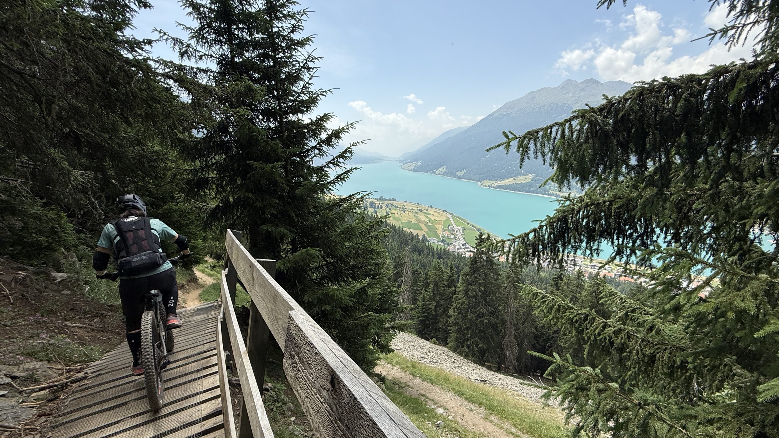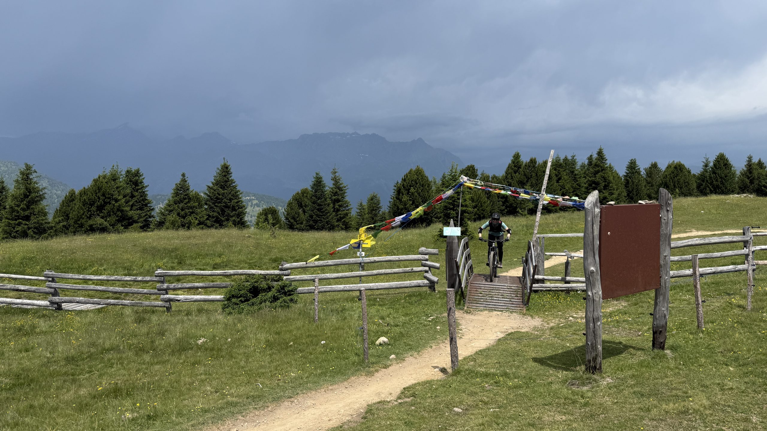 Da nachmittags der Regen kommen soll, wollen wir den Vormittag in Nauders nutzen. Am Lift in Nauders stellt Torsten leider fest, dass ihm eine Speiche fehlt. Glück im Unglück – der sehr freundliche Fahrradmechaniker an der Station kommt vorbei und bietet uns die Reparatur an. Mega. Zum Zentrieren fährt er zum Chef nach Nauders. Top. Dauert leider nur solange, dass wir nach der ersten Auffahrt feststellen müssen, dass das Gewitter kurz bevorsteht. Statt Schredden heißt es dann, schnell den Bunker-Trail runter.