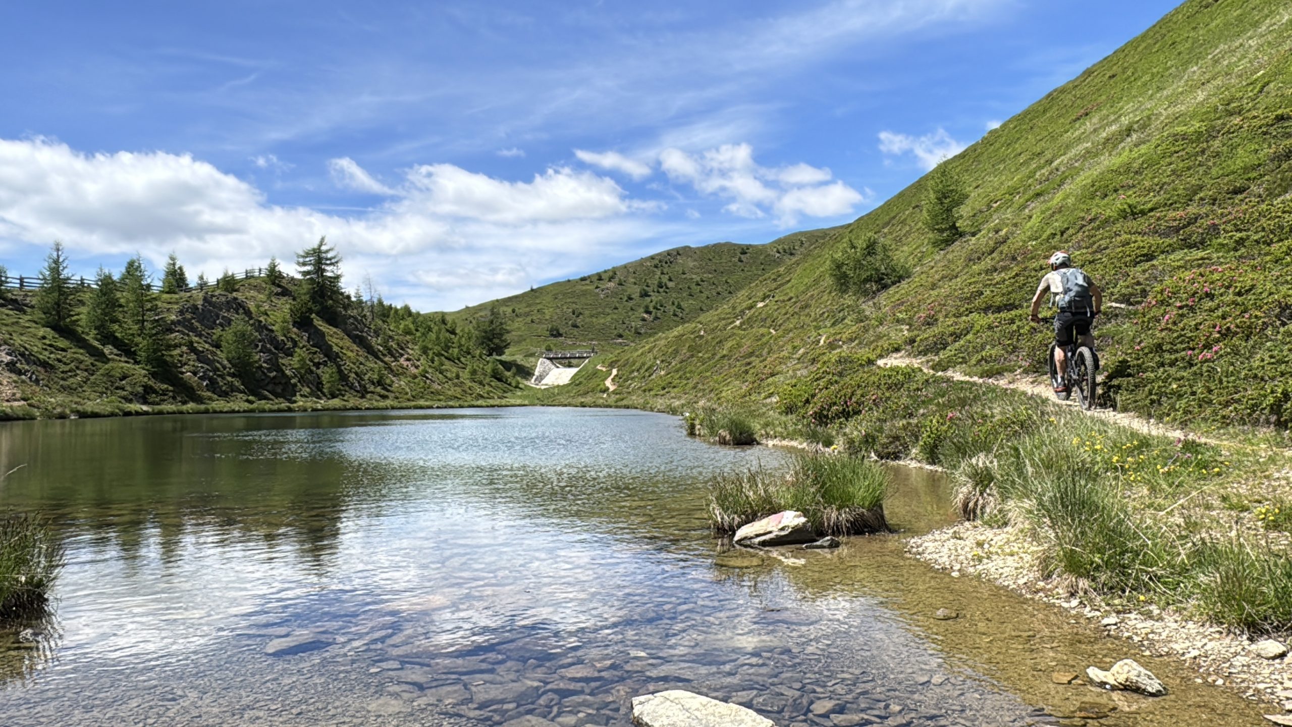 Schöneben, queren zur Talstation Haideralm, entlang am Haidersee und dann hoch zum Watles. Der Anstieg ist zu Beginn ganz schön steil und wir sind froh, dieses Mal mit dem E-Bike unterwegs zu sein. Ab dem Pfaffensee sind wir letztes Mal nicht viel gefahren. Das geht heute besser. Der Blick vom Watles ist grandios – die Abfahrt durch das Zerzer Tal ebenso. Wir queren vorbei an der Brugger-Alm und hoch zur Haider-Alm. Den schwarzen Haider-Alm-Trail müssen wir mitnehmen. Dann mit der Bahn noch einmal hoch und wir queren zurück zum Parkplatz Schöneben.