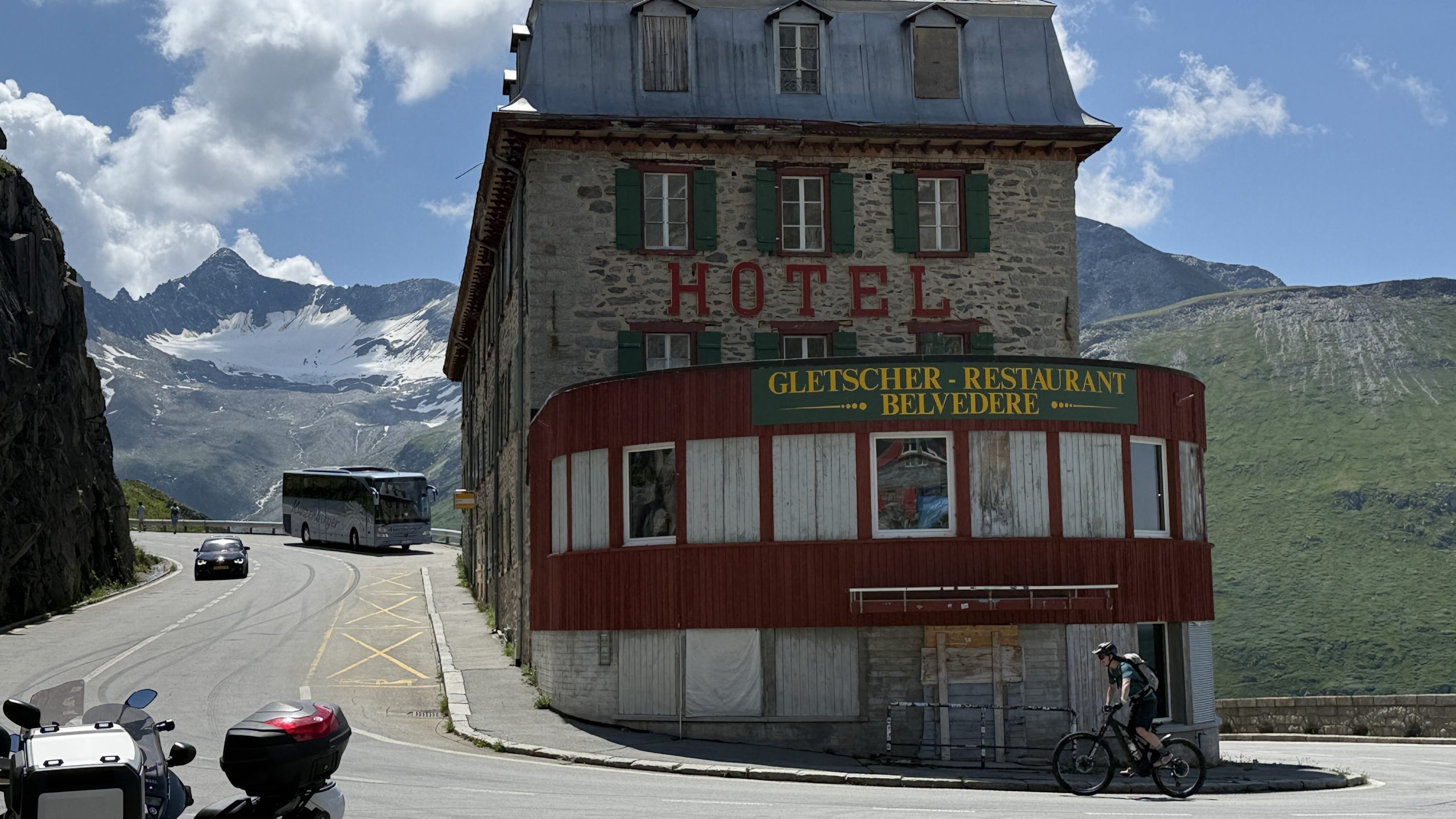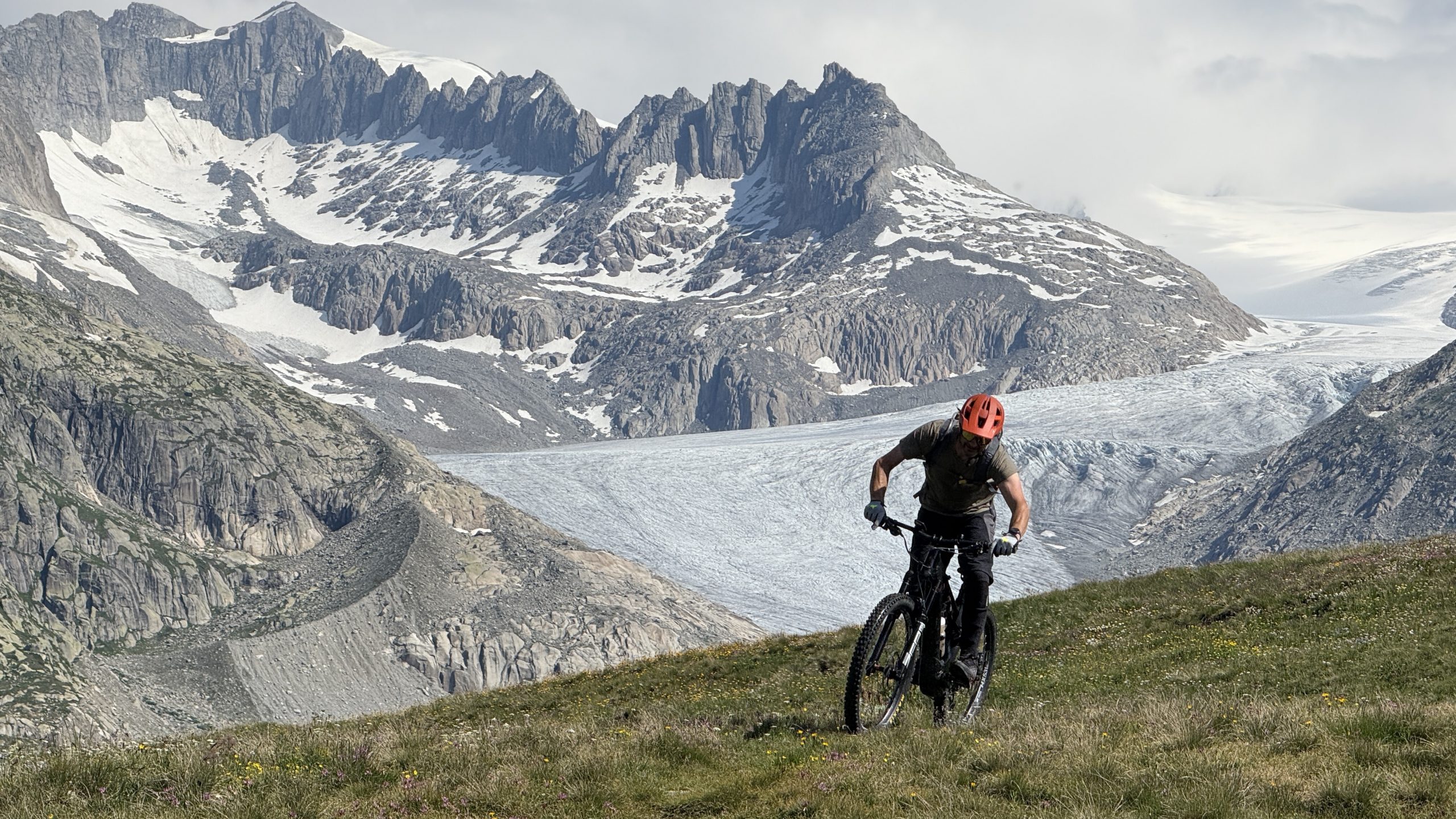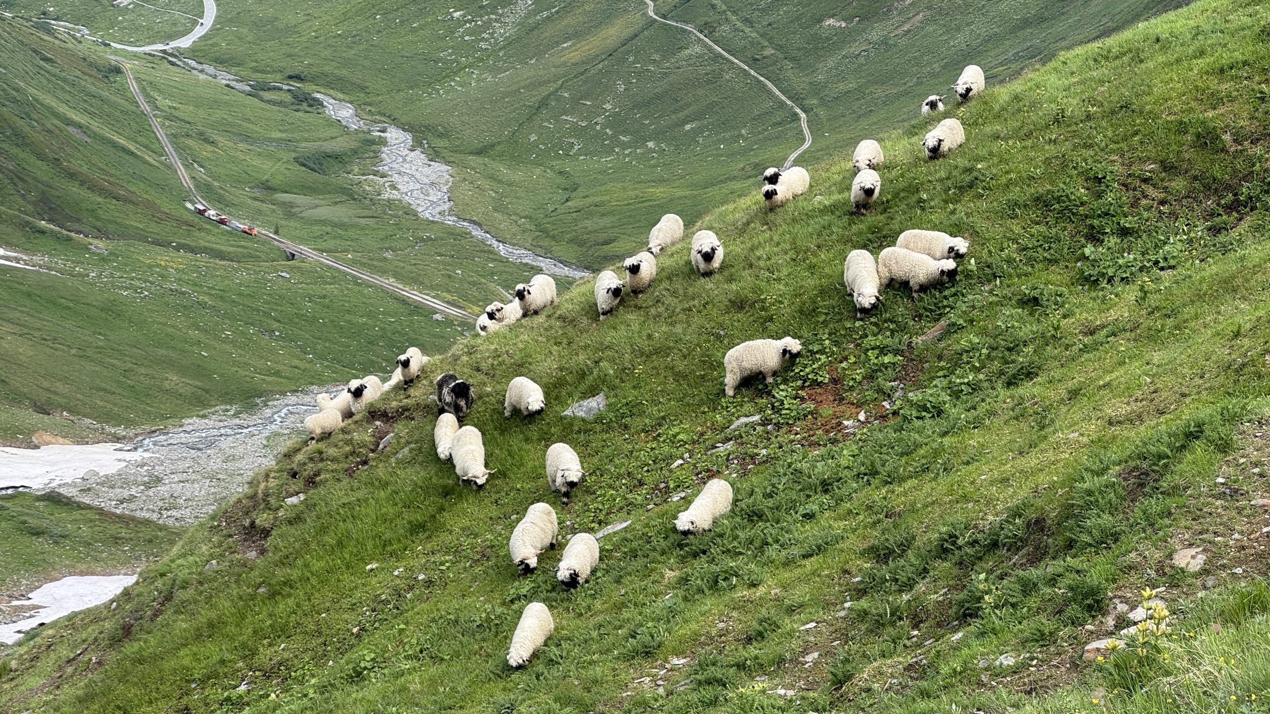 Eine alte Militärstraße geht es hoch. Vor und hinter den spektakulären Tunneln liegt noch Schnee. Sonst ist die Tour technisch nicht anspruchsvoll. Das Panorama auf den Rhone-Gletscher und in das Rhone-Tal ist phänomenal. Außerdem gibt es hier Schweizer Walliser Schwarznasen-Schafe. Theoretisch müssten wir auch das Matterhorn sehen. Über Wiesen surfen wir hinab nach Obergoms. Eine schöne Panoroma-Tour. Mit E ist es auch nicht schlimm, die Passtraße wieder hochzutreten.