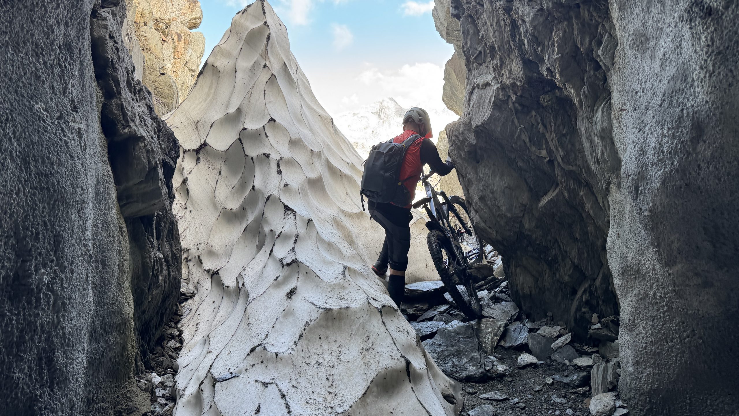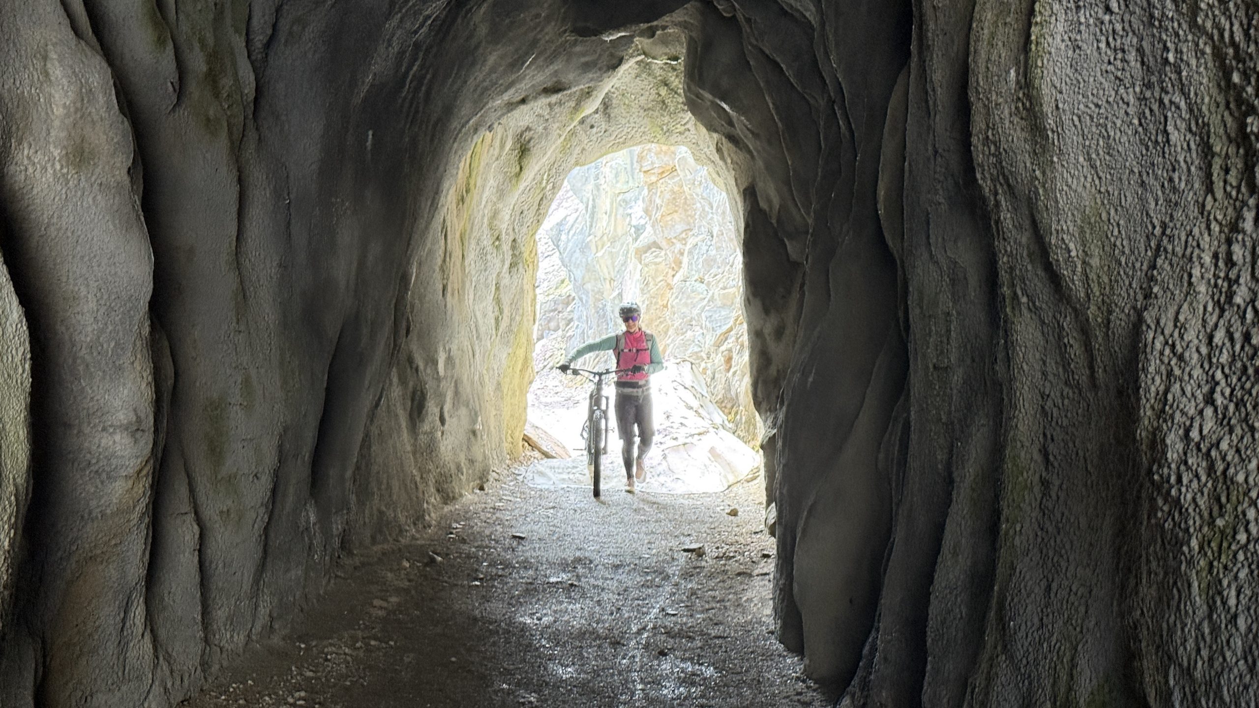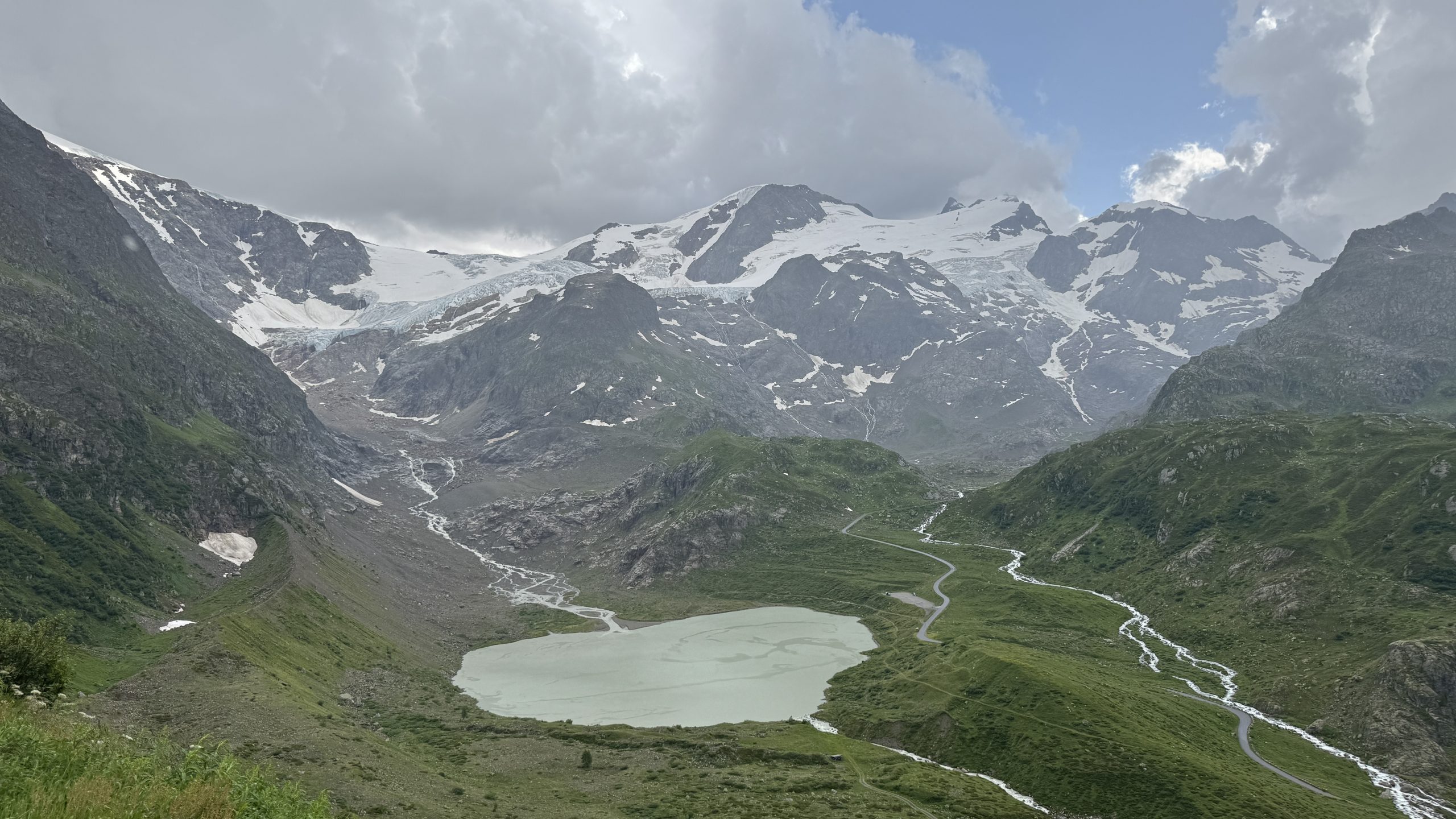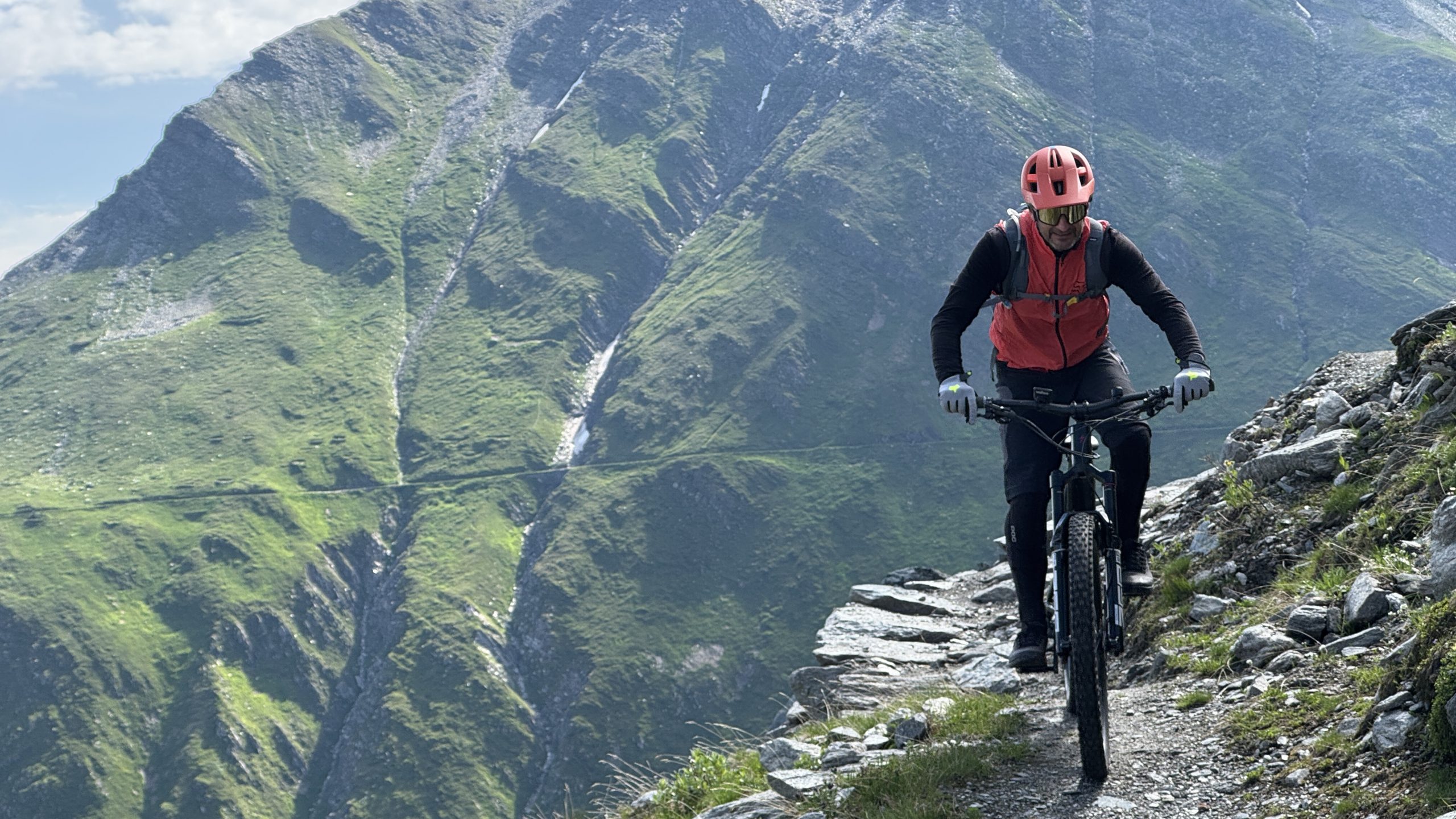 Eine alte Militärstraße geht es hoch. Vor und hinter den spektakulären Tunneln liegt noch Schnee. Sonst ist die Tour technisch nicht anspruchsvoll. Das Panorama auf den Rhone-Gletscher und in das Rhone-Tal ist phänomenal. Außerdem gibt es hier Schweizer Walliser Schwarznasen-Schafe. Theoretisch müssten wir auch das Matterhorn sehen. Über Wiesen surfen wir hinab nach Obergoms. Eine schöne Panoroma-Tour. Mit E ist es auch nicht schlimm, die Passtraße wieder hochzutreten.
