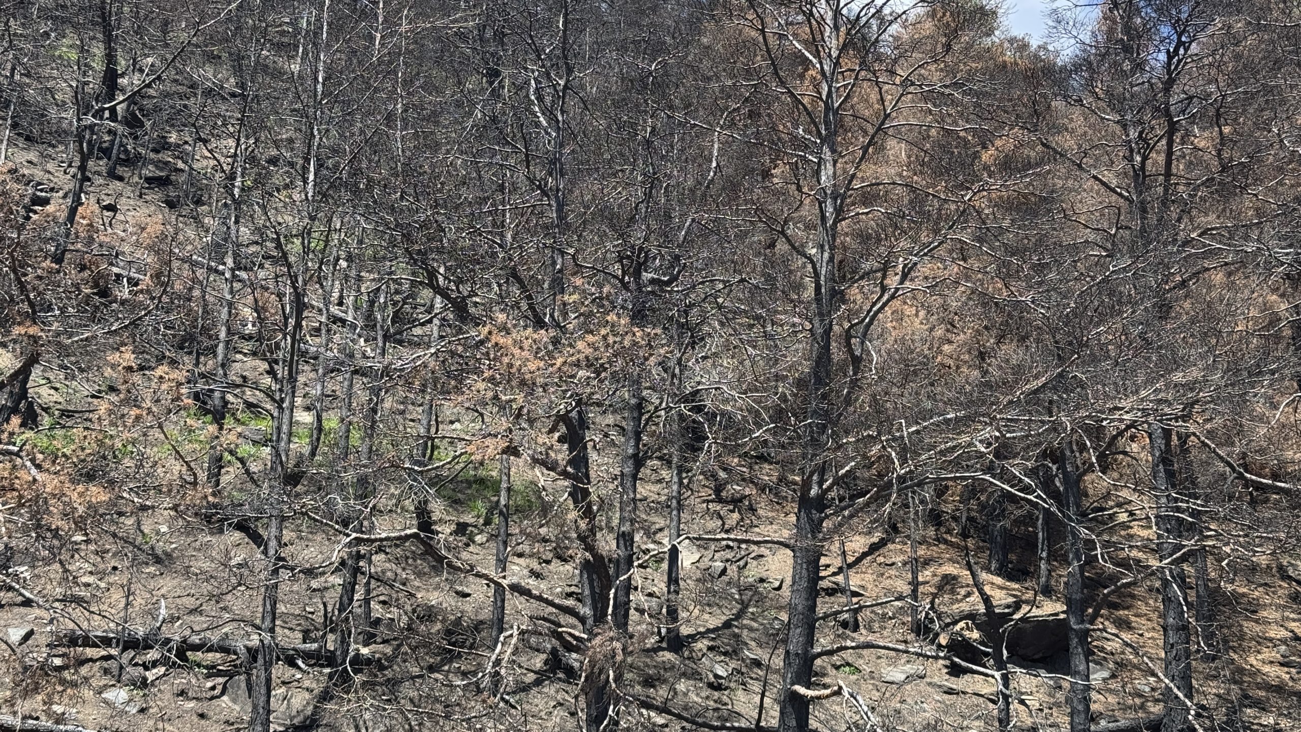 Die Anfahrt durch den Apfelhain war so nicht geplant. Eine Spur müssen wir einmal mitten zwei Reihen entlang fahren. Auf den herumliegenden Äpfeln fährt es sich rutschiger als im Arco-Geröll. Neues Fahrerlebnis. Dann geht es 1.100 Hm hoch Richtung Bergstation St. Martin am Kofel (1.740 M). Zwischenzeitlich ist es ziemlich steil und letztes Mal ohne E haben wir sehr geflucht. Die Spuren des Waldbrands über Latsch sind nicht zu übersehen.
