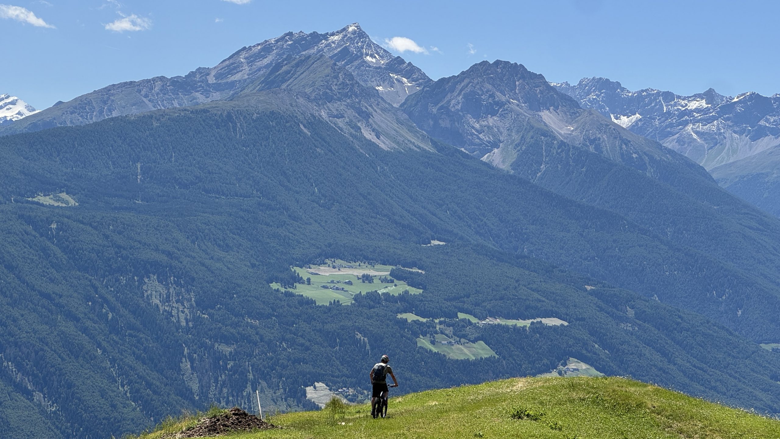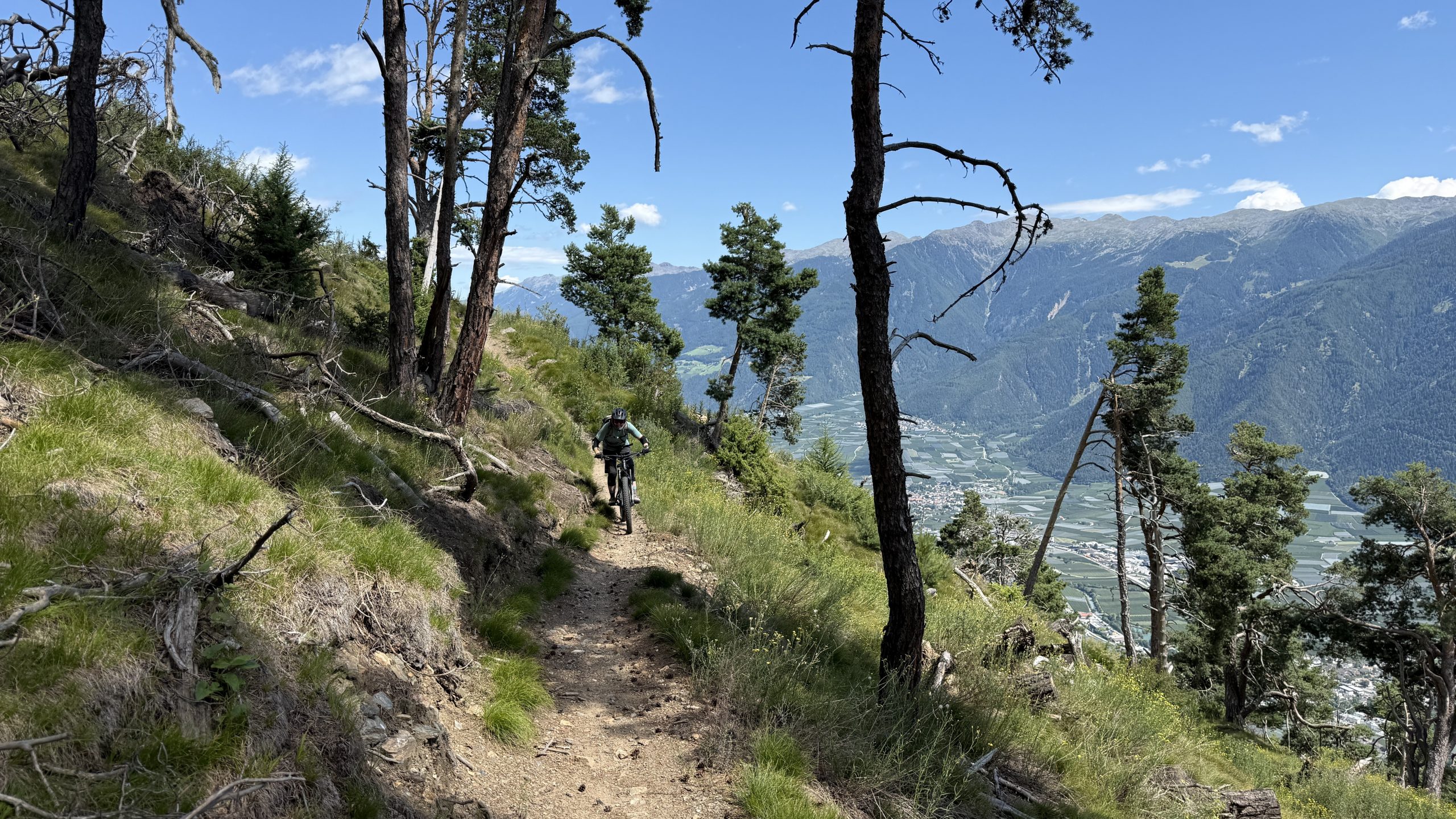 Der Panorama-Trail öffnet ab 14h wieder für Biker. Das passt perfekt. Der Trail ist wie beschrieben sehr abschüssig. Manche Stellen deswegen lieber nicht fahrbar. Panorama ja – wunderschön wie im ganzen Vinschgau. Spaßiger ist der Flipsi-Trail (ehemals Propain-Trail). Botanisch ein Highlight. Wir kurven durch Gräser, Blumen und ein Kieferwäldchen. Das macht Laune. Pünktlich zum Meeting zurück am Bus.😀