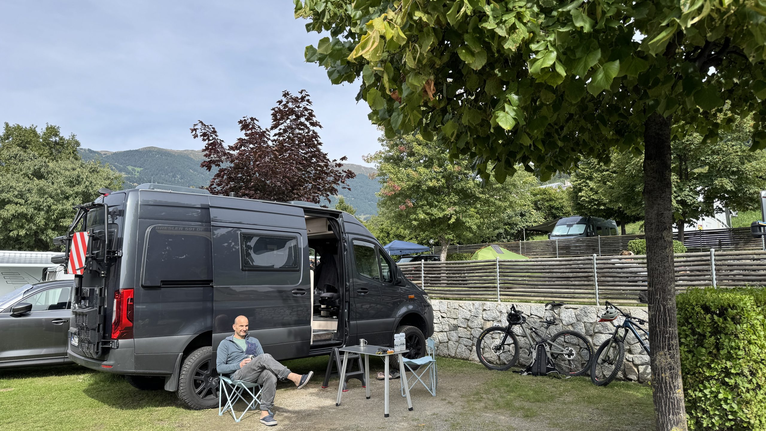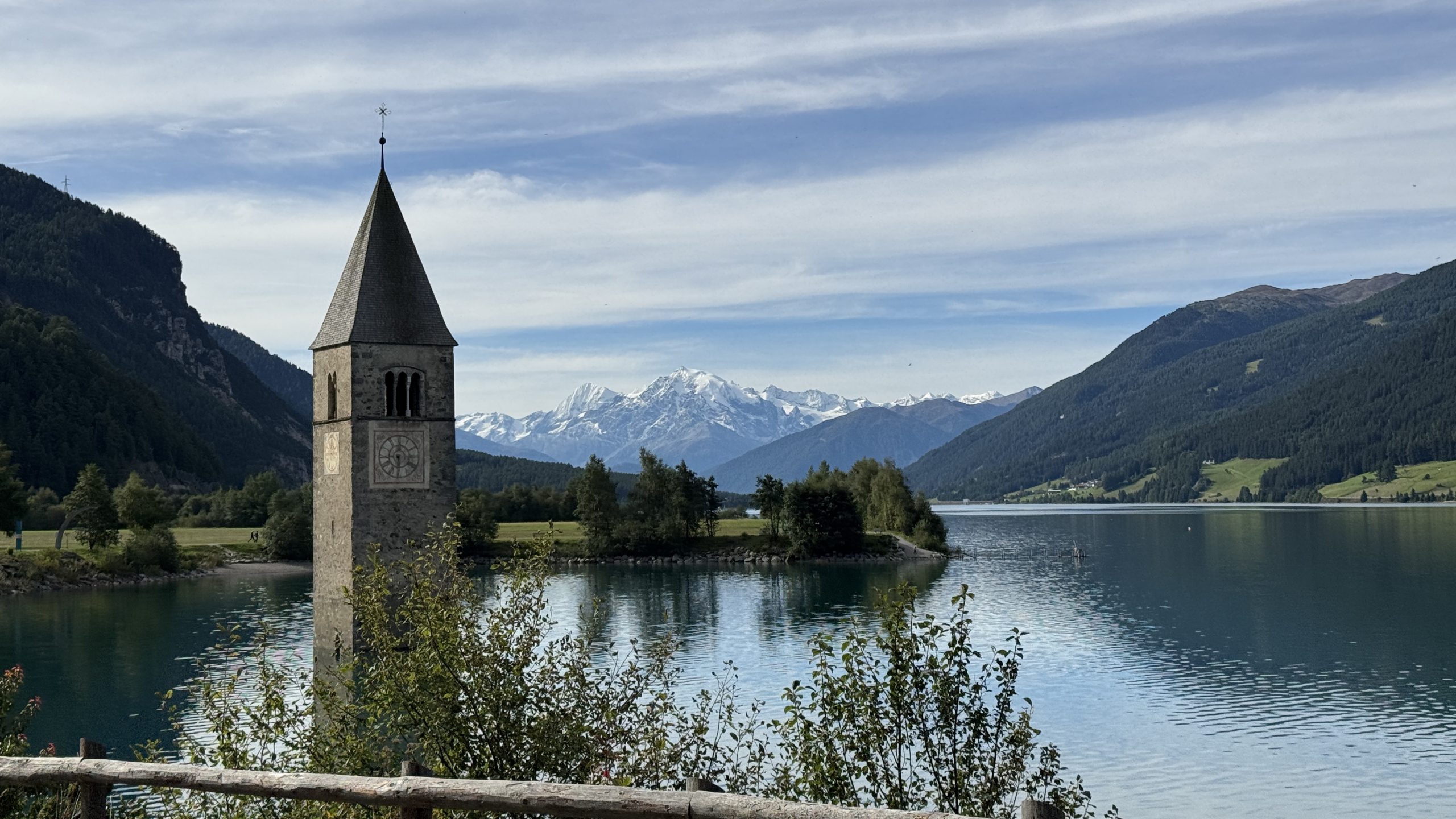 wir schaffen es bis zum Reschensee. Dort ist zwar Enduro-Rennen. Einen Platz für die Nacht gibt es dennoch.
