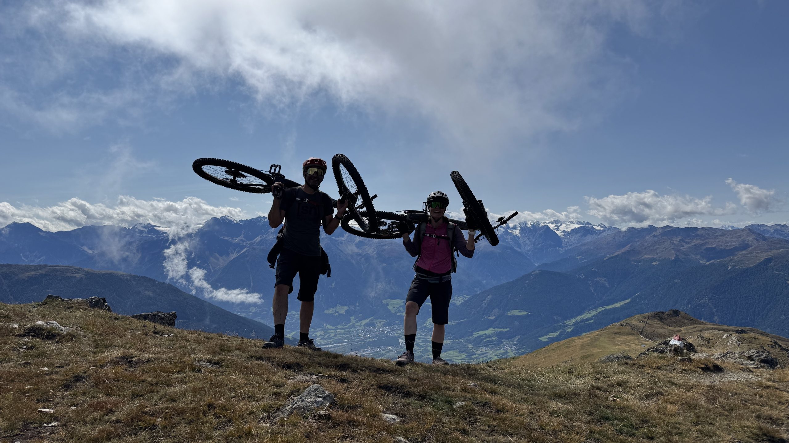 Erst mit dem Shuttle, dann fahrend, dann schiebend bis zum ersten Gipfel. Puh. Letztes Mal lag hier im Juni Schnee. Nach einer Pause geht es dann zum Hochjoch – wieder fahrend, schiebend und die letzten 10 Meter tragend.