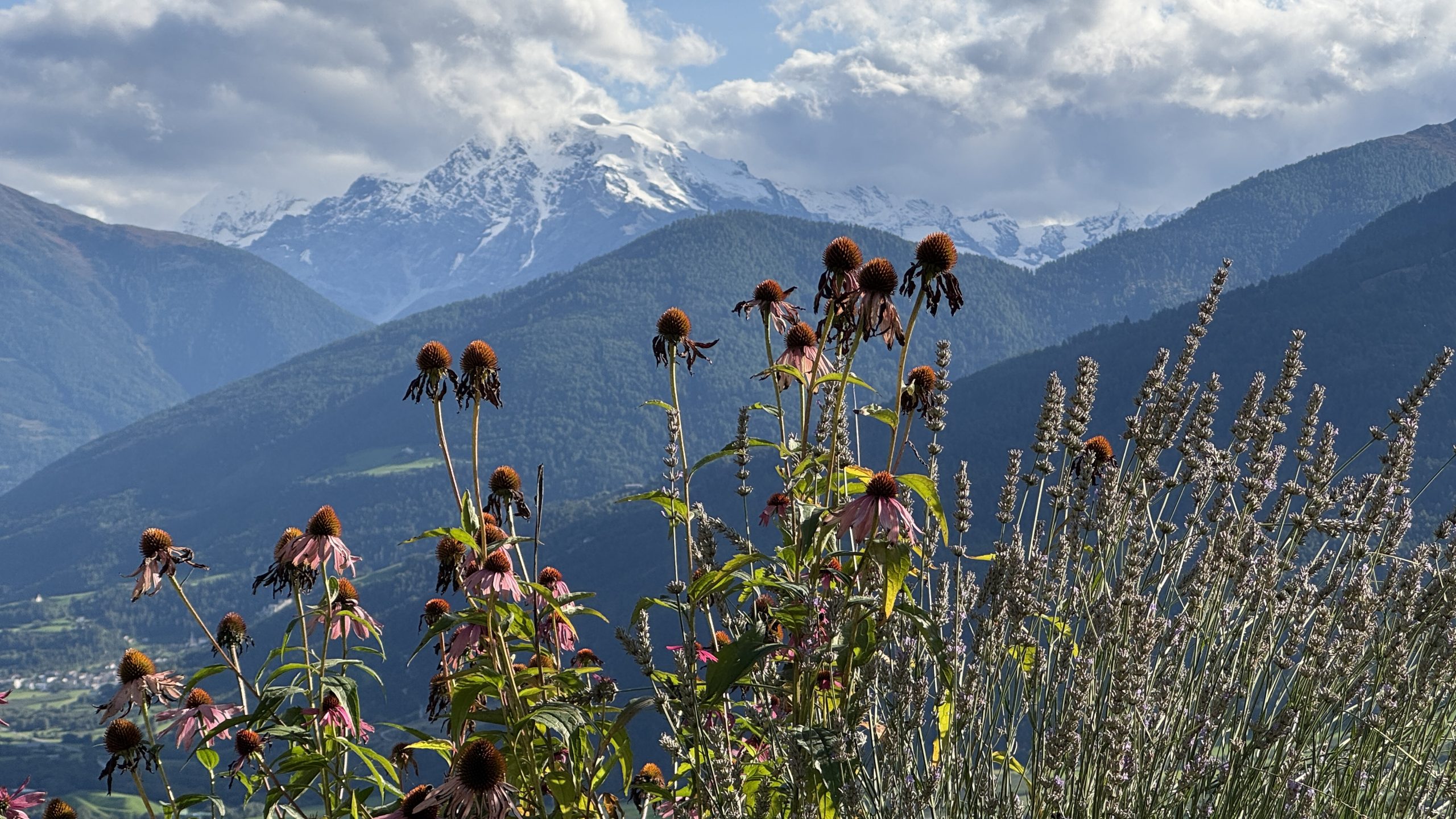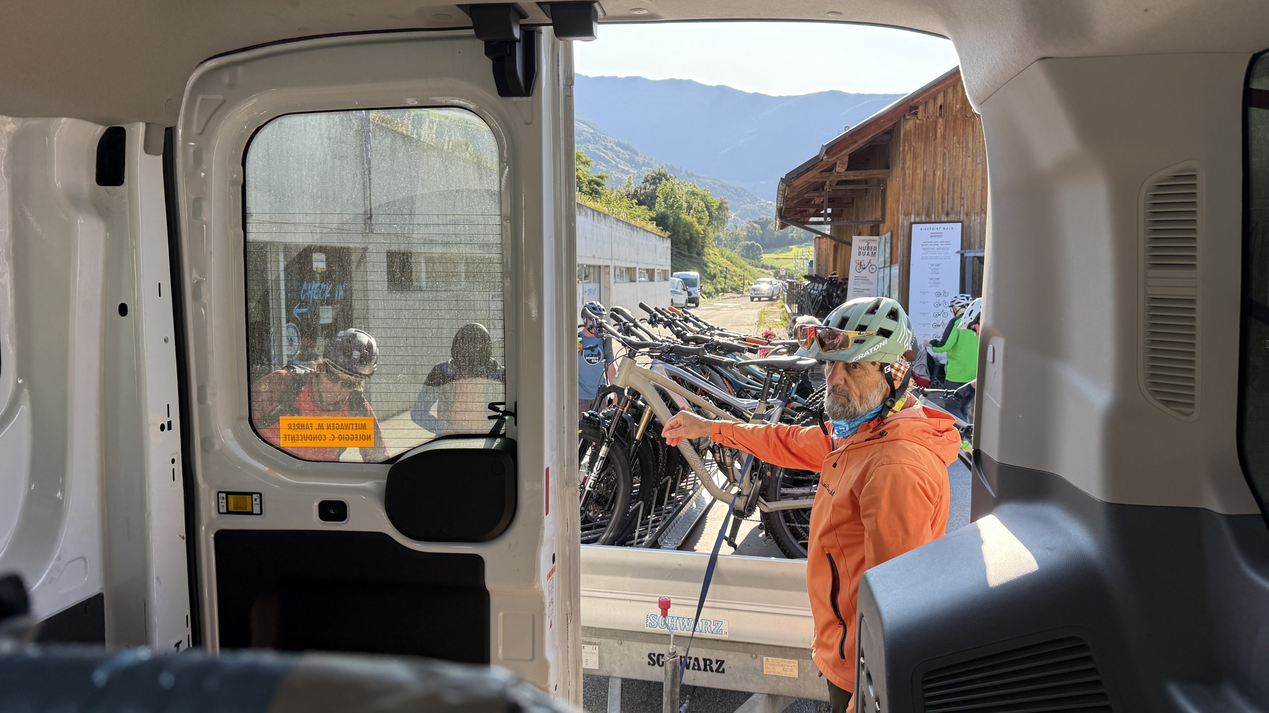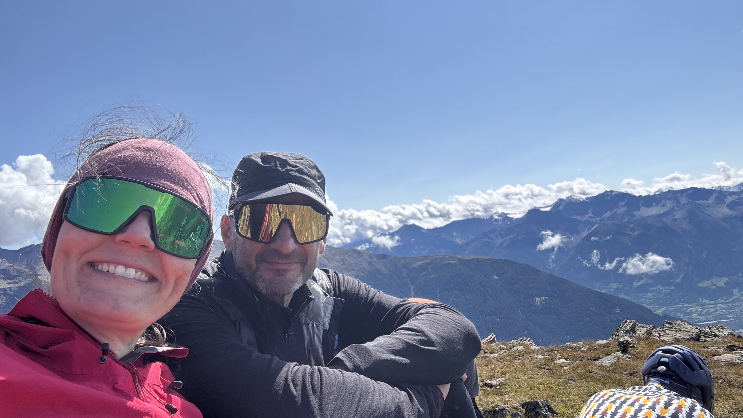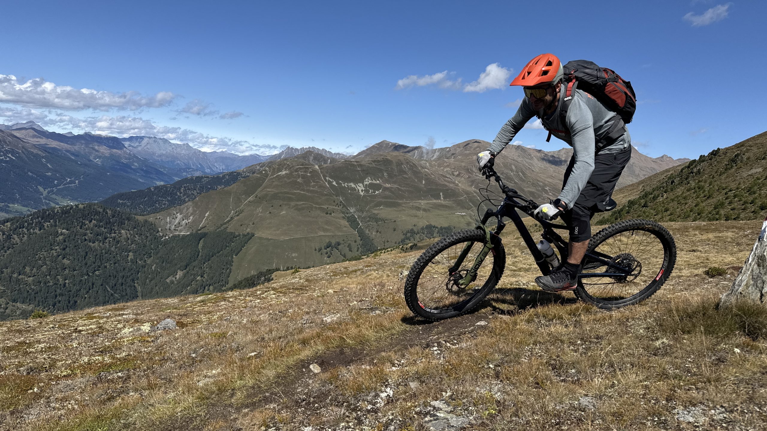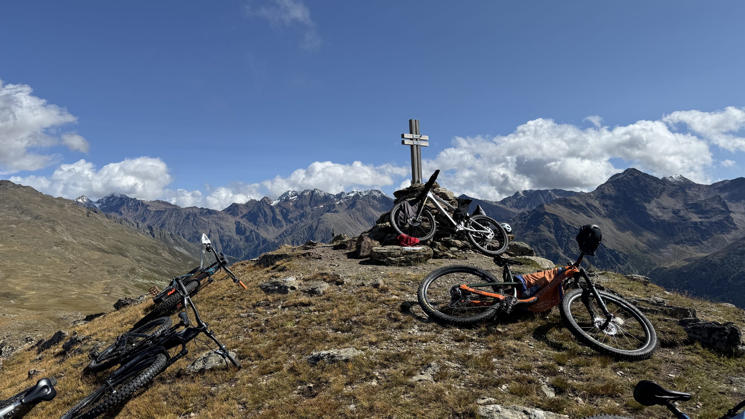 Bei bestem Wetter starten wir zur Drei-Gipfel-Biketour. Spitzige Lun (2.324 m), Niederjoch (2.460m) und Hochjoch (2.570m) stehen auf dem Programm. Wir erinnern uns daran, wie wir hier vor 5 Jahren bei Siegi biken gelernt haben.